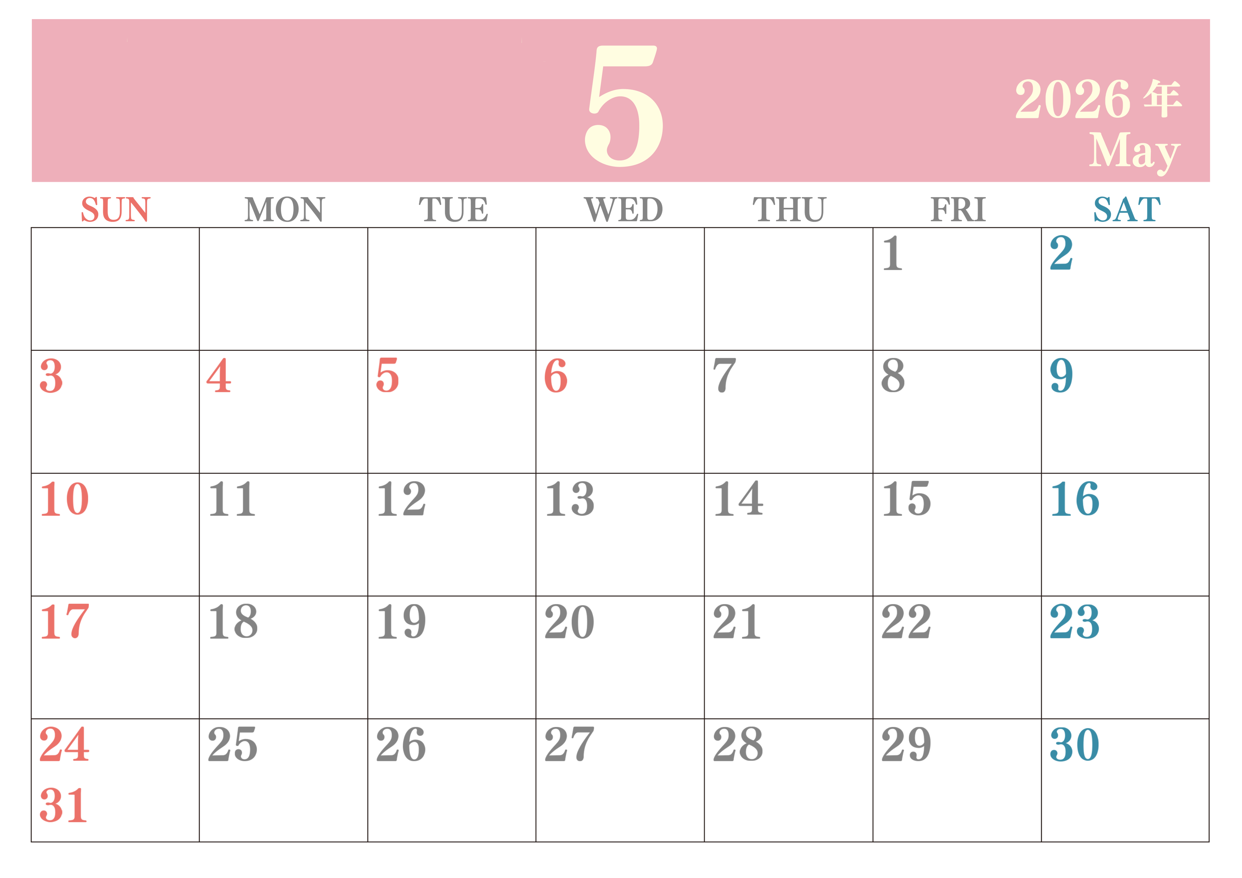 2026年・無料のカレンダーテンプレート 2026年5月横型日曜始まり 大きい文字が見やすく書き込みも楽なA4無料シンプルカレンダー(2026-01140500) 素材状デザイン王 2025年4月8日 2026年5月横型日曜始まりの大きい文字が見やすく書き込みも楽なA4無料シンプルカレンダーです。スケジュールの整理におすすめのフリー素材です。忙しいスケジュールを簡単にまとめて書き込みましょう。(2026-01140500) シンプル 5月 横型のカレンダー 日曜始まり カレンダーデザイン-0114