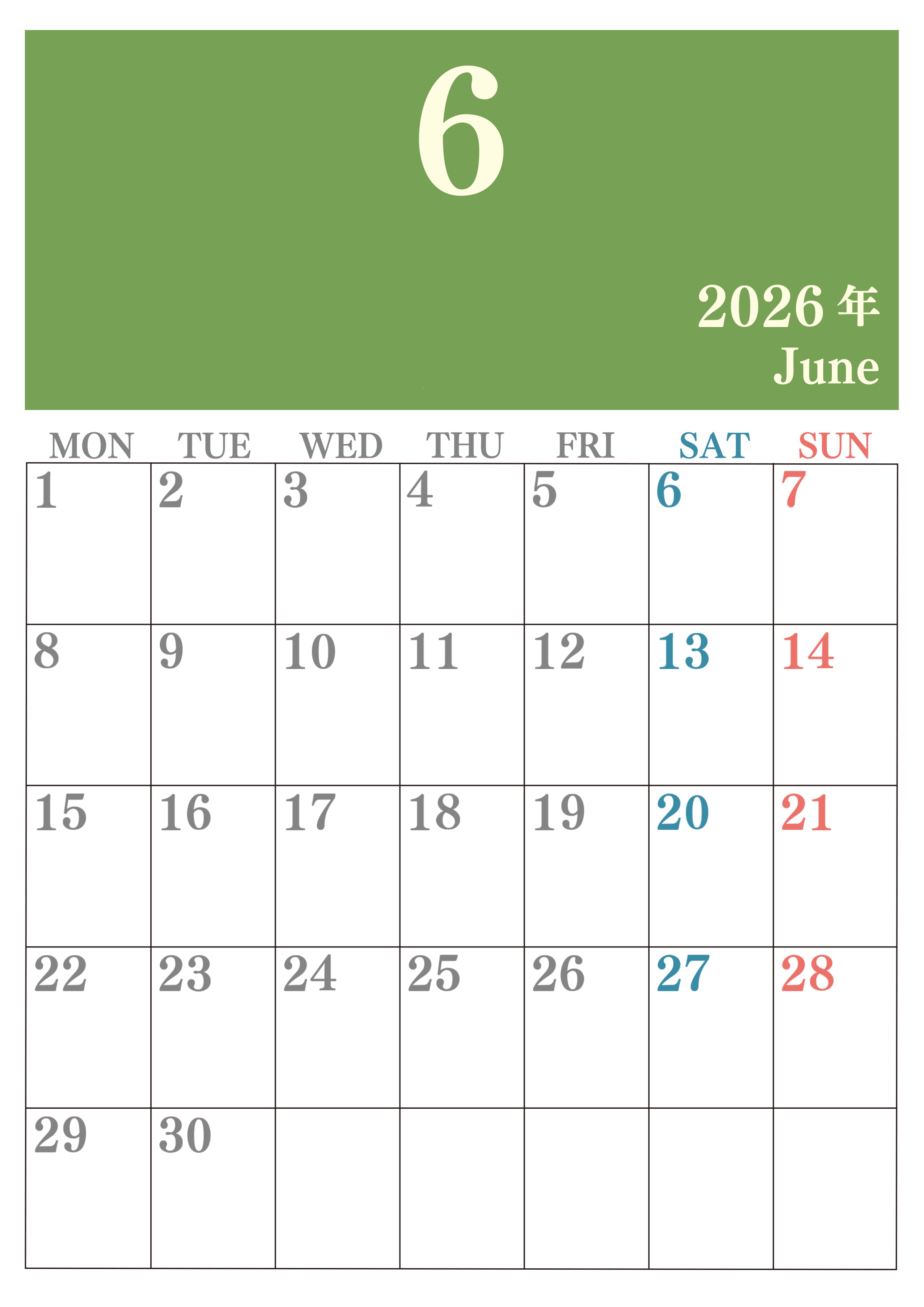 2026年・無料のカレンダーテンプレート 2026年6月縦型月曜始まり 大きい文字が見やすく書き込みも楽なA4無料シンプルカレンダー(2026-01140611) 素材状デザイン王 2025年4月8日 2026年6月縦型月曜始まりの大きい文字が見やすく書き込みも楽なA4無料シンプルカレンダーです。スケジュールの整理におすすめのフリー素材です。多忙なプランの可視化に役立ちます。(2026-01140611) シンプル 6月 縦型のカレンダー 月曜始まり カレンダーデザイン-0114