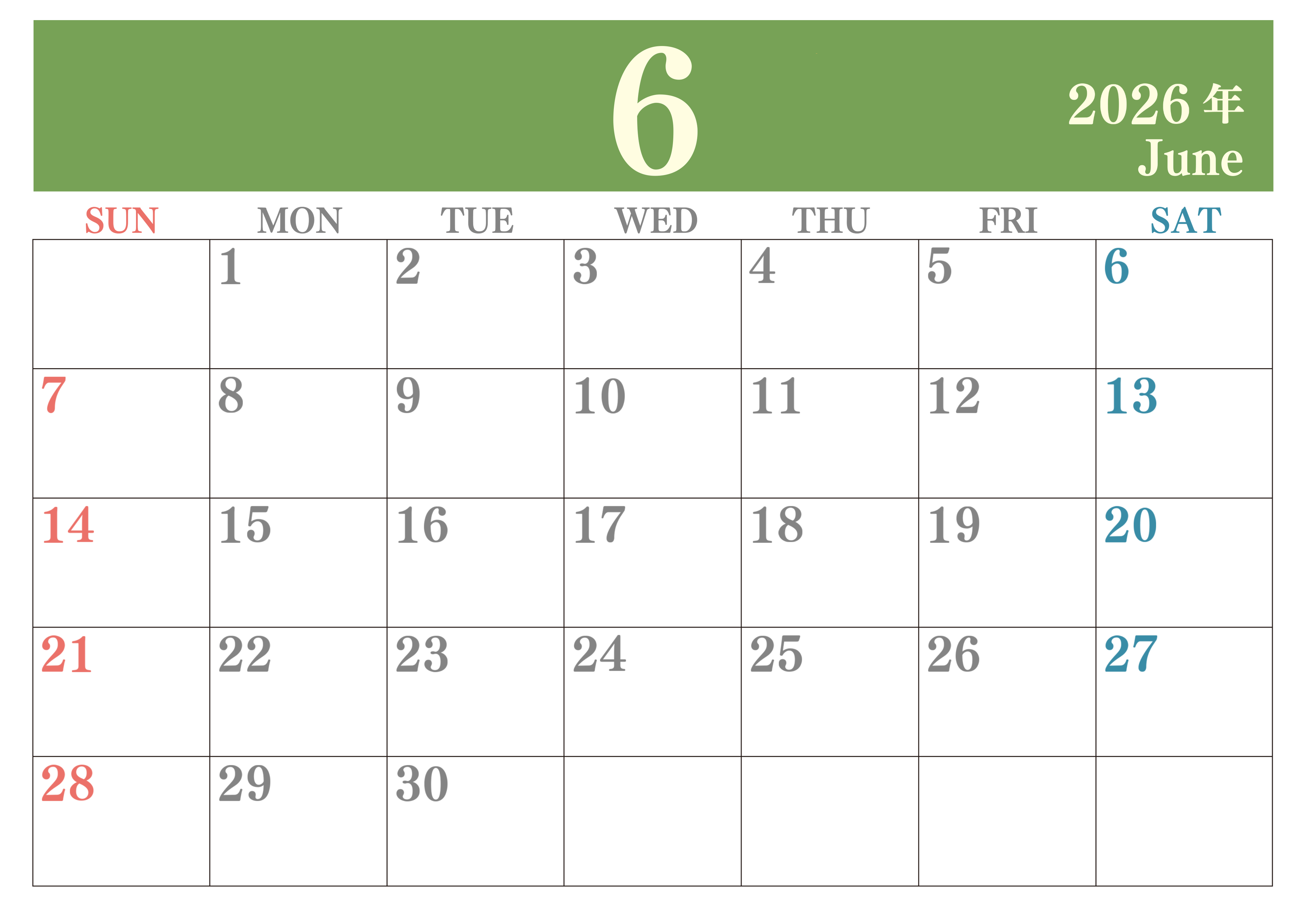 2026年・無料のカレンダーテンプレート 2026年6月横型日曜始まり 大きい文字が見やすく書き込みも楽なA4無料シンプルカレンダー(2026-01140600) 素材状デザイン王 2025年4月8日 2026年6月横型日曜始まりの大きい文字が見やすく書き込みも楽なA4無料シンプルカレンダーです。スケジュールの整理におすすめのフリー素材です。多忙なプランの可視化に役立ちます。(2026-01140600) シンプル 6月 横型のカレンダー 日曜始まり カレンダーデザイン-0114