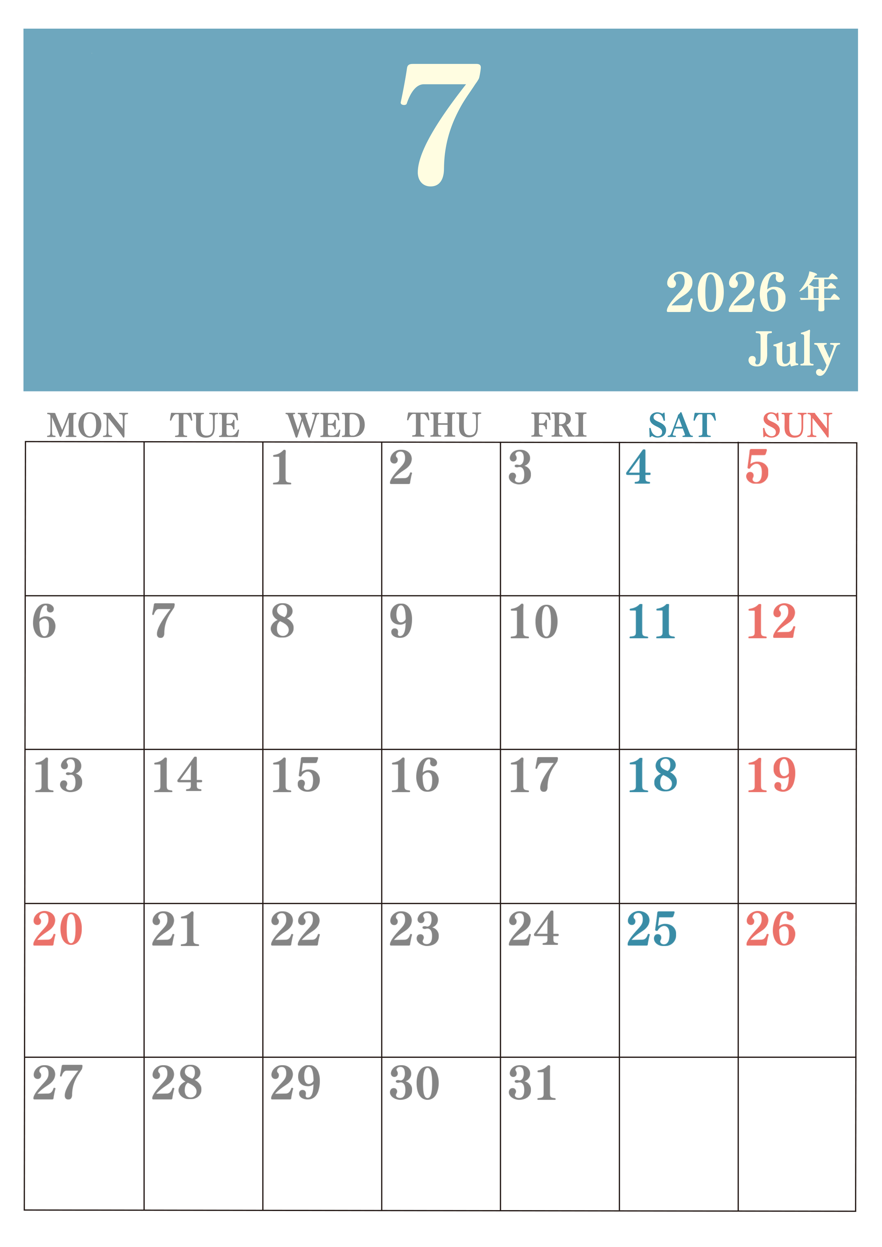 2026年・無料のカレンダーテンプレート 2026年7月縦型月曜始まり 大きい文字が見やすく書き込みも楽なA4無料シンプルカレンダー(2026-01140711) 素材状デザイン王 2025年4月8日 2026年7月縦型月曜始まりの大きい文字が見やすく書き込みも楽なA4無料シンプルカレンダーです。スケジュールの整理におすすめのフリー素材です。計画を効率的に立てましょう。(2026-01140711) シンプル 7月 縦型のカレンダー 月曜始まり カレンダーデザイン-0114