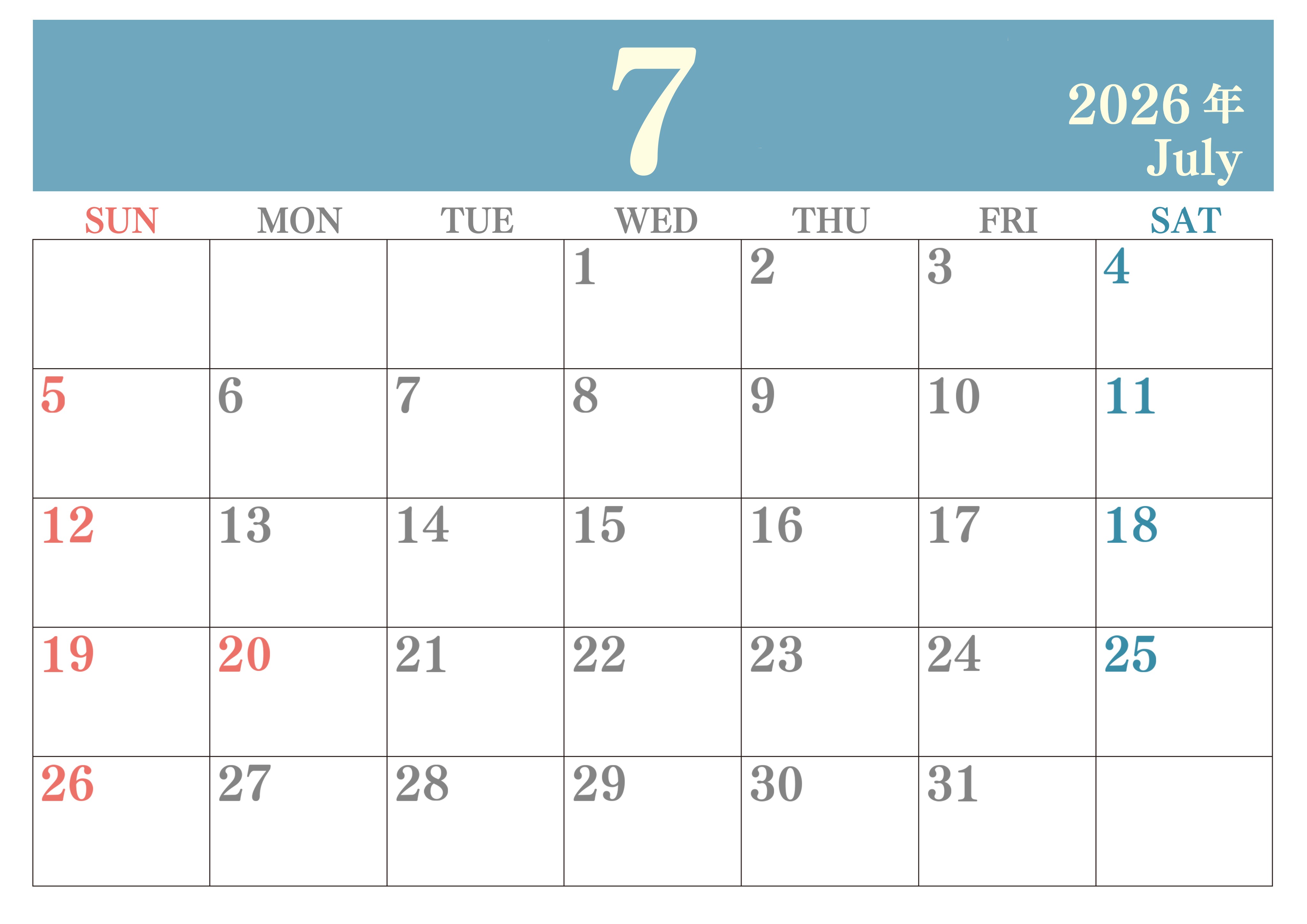 2026年・無料のカレンダーテンプレート 2026年7月横型日曜始まり 大きい文字が見やすく書き込みも楽なA4無料シンプルカレンダー(2026-01140700) 素材状デザイン王 2025年4月8日 2026年7月横型日曜始まりの大きい文字が見やすく書き込みも楽なA4無料シンプルカレンダーです。スケジュールの整理におすすめのフリー素材です。計画を効率的に立てましょう。(2026-01140700) シンプル 7月 横型のカレンダー 日曜始まり カレンダーデザイン-0114
