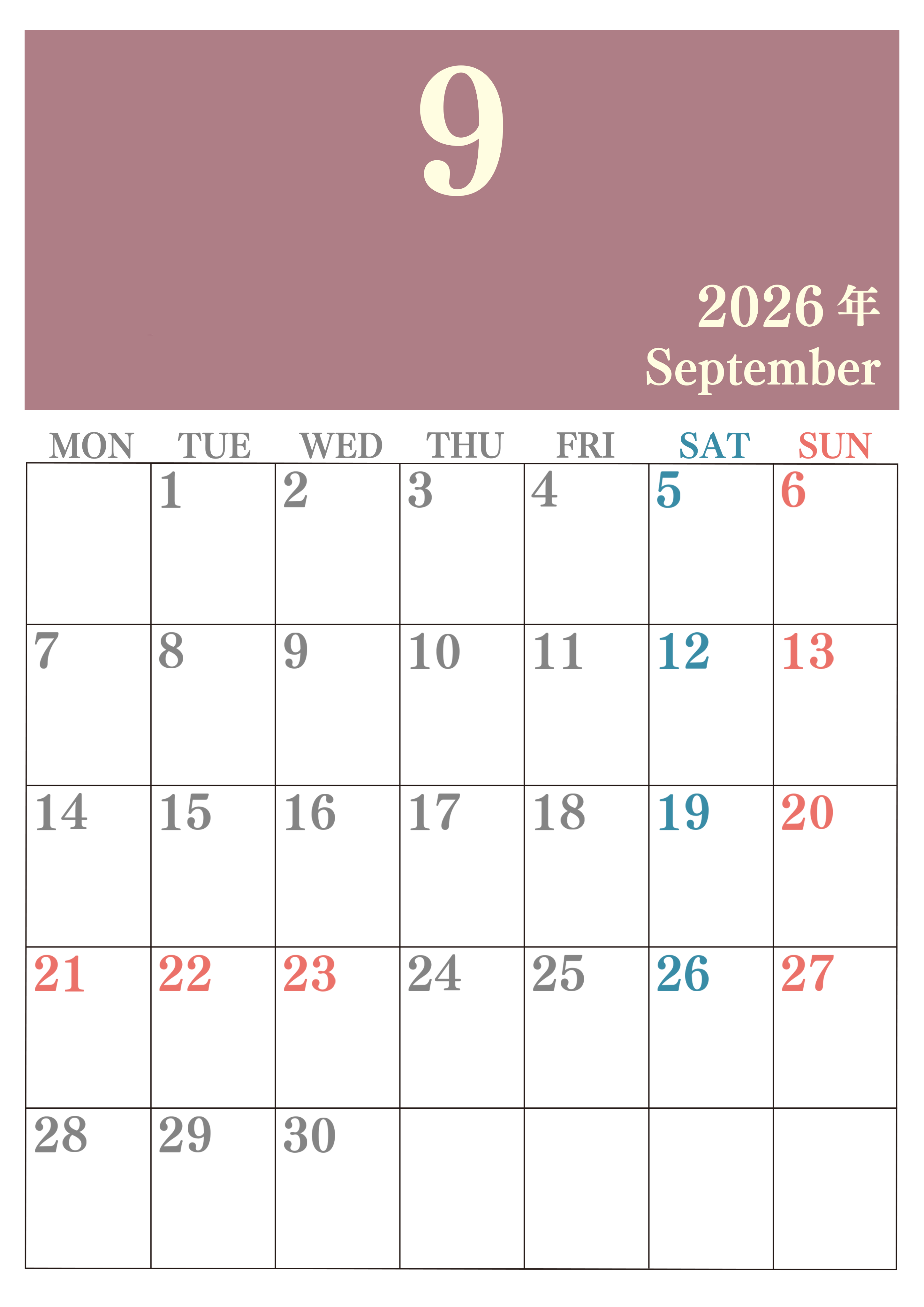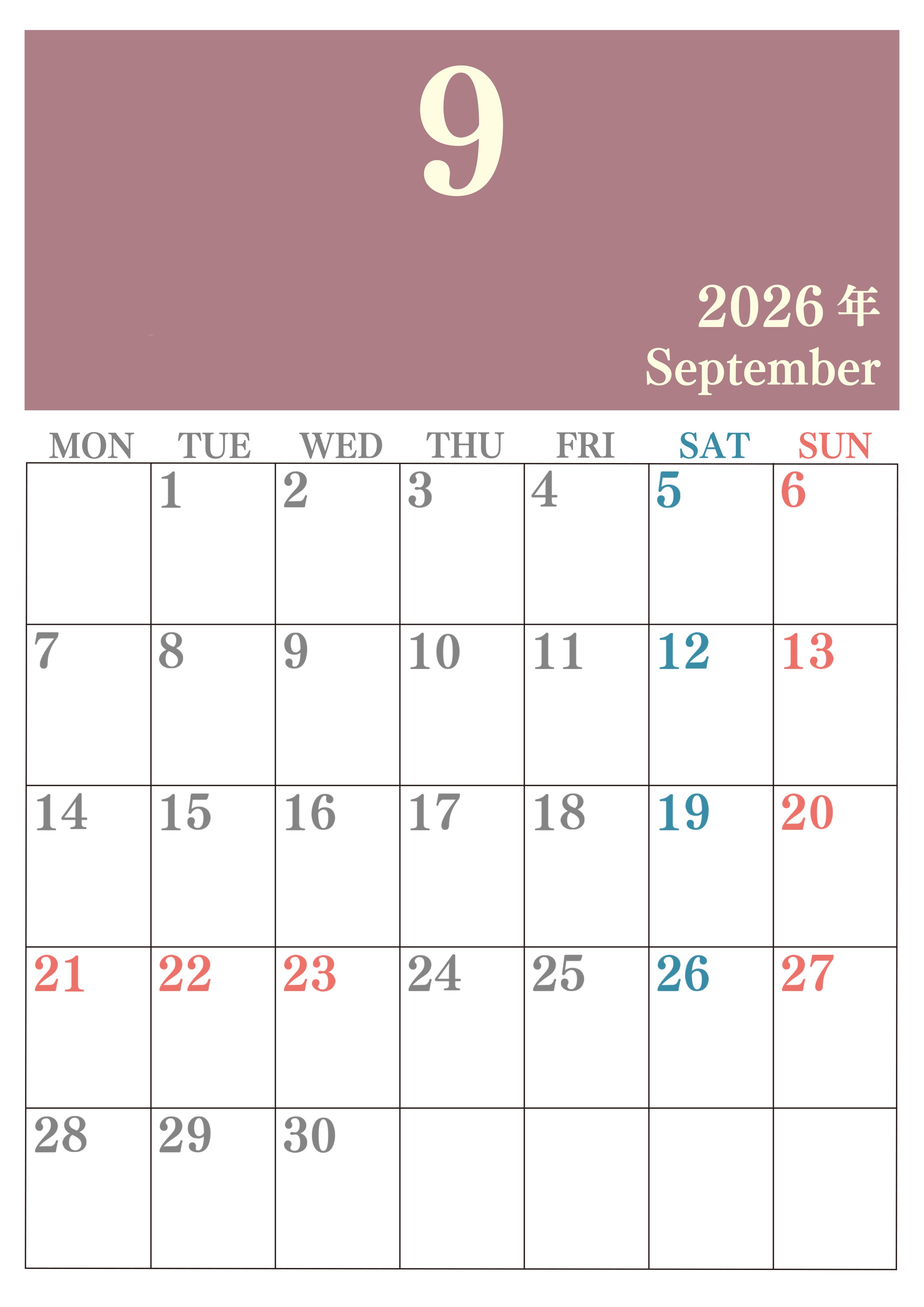 2026年・無料のカレンダーテンプレート 2026年9月縦型月曜始まり 大きい文字が見やすく書き込みも楽なA4無料シンプルカレンダー(2026-01140911) 素材状デザイン王 2025年4月8日 2026年9月縦型月曜始まりの大きい文字が見やすく書き込みも楽なA4無料シンプルカレンダーです。スケジュールの整理におすすめのフリー素材です。多忙なプランの可視化に役立ちます。(2026-01140911) シンプル 9月 縦型のカレンダー 月曜始まり カレンダーデザイン-0114