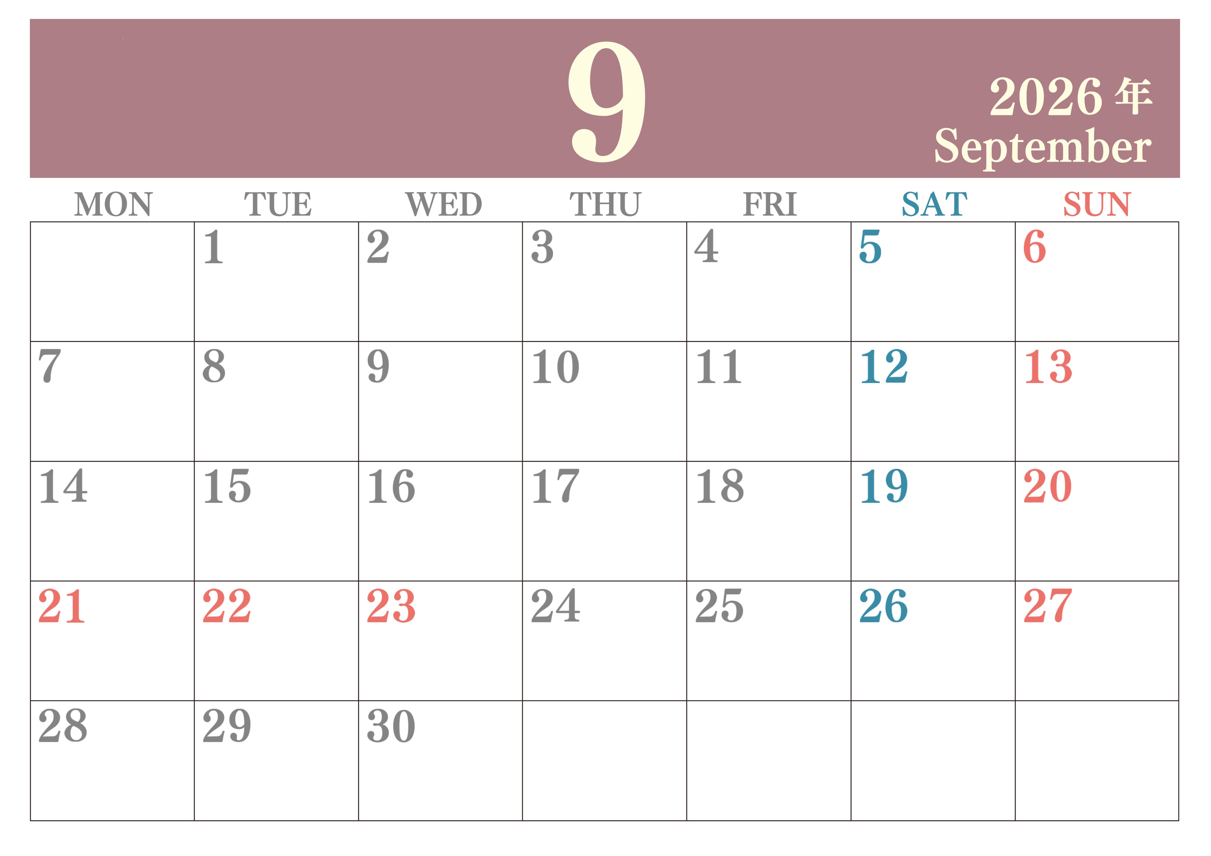 2026年9月横型月曜始まり 大きい文字が見やすく書き込みも楽なA4無料シンプルカレンダー(2026-01140901)