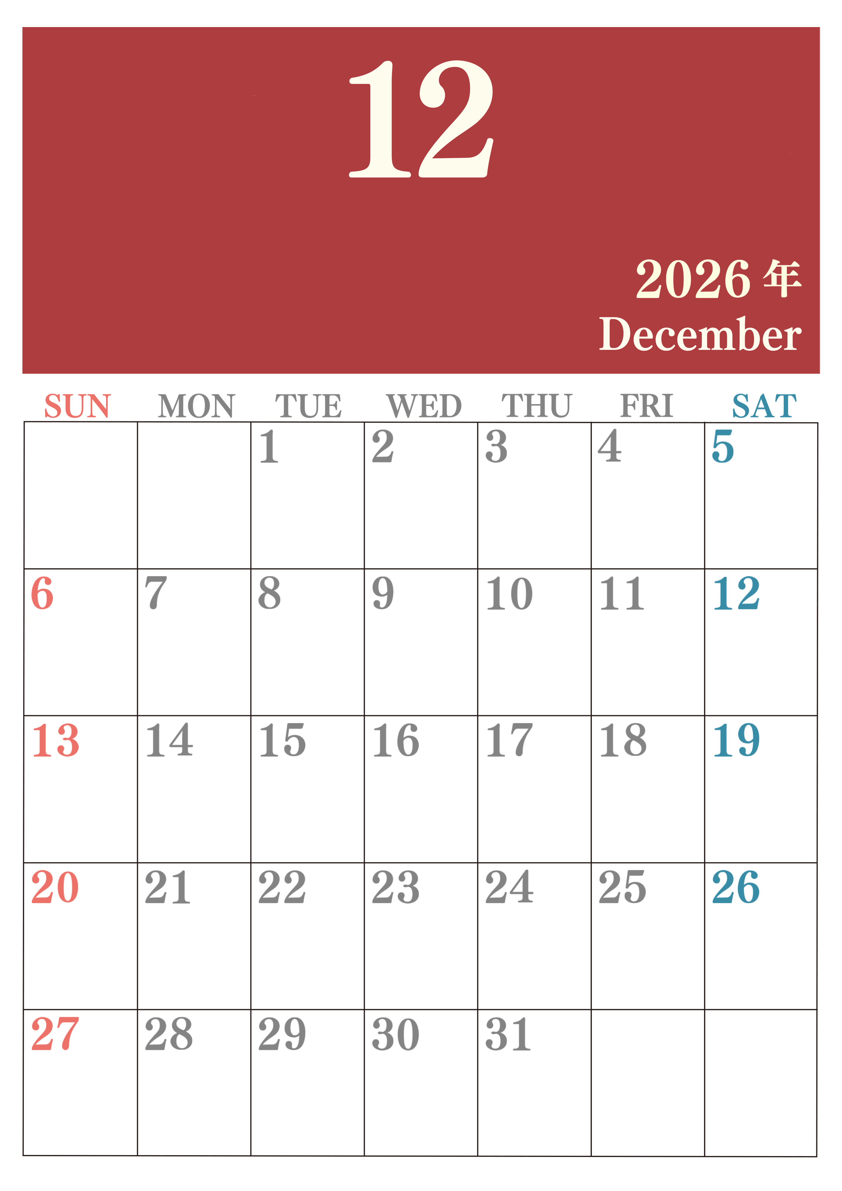 2026年・無料のカレンダーテンプレート 2026年12月縦型日曜始まり 大きい文字が見やすく書き込みも楽なA4無料シンプルカレンダー(2026-01141210) 素材状デザイン王 2025年4月8日 2026年12月縦型日曜始まりの大きい文字が見やすく書き込みも楽なA4無料シンプルカレンダーです。スケジュールの整理におすすめのフリー素材です。多忙なプランの可視化に役立ちます。(2026-01141210) シンプル 12月 縦型のカレンダー 日曜始まり カレンダーデザイン-0114