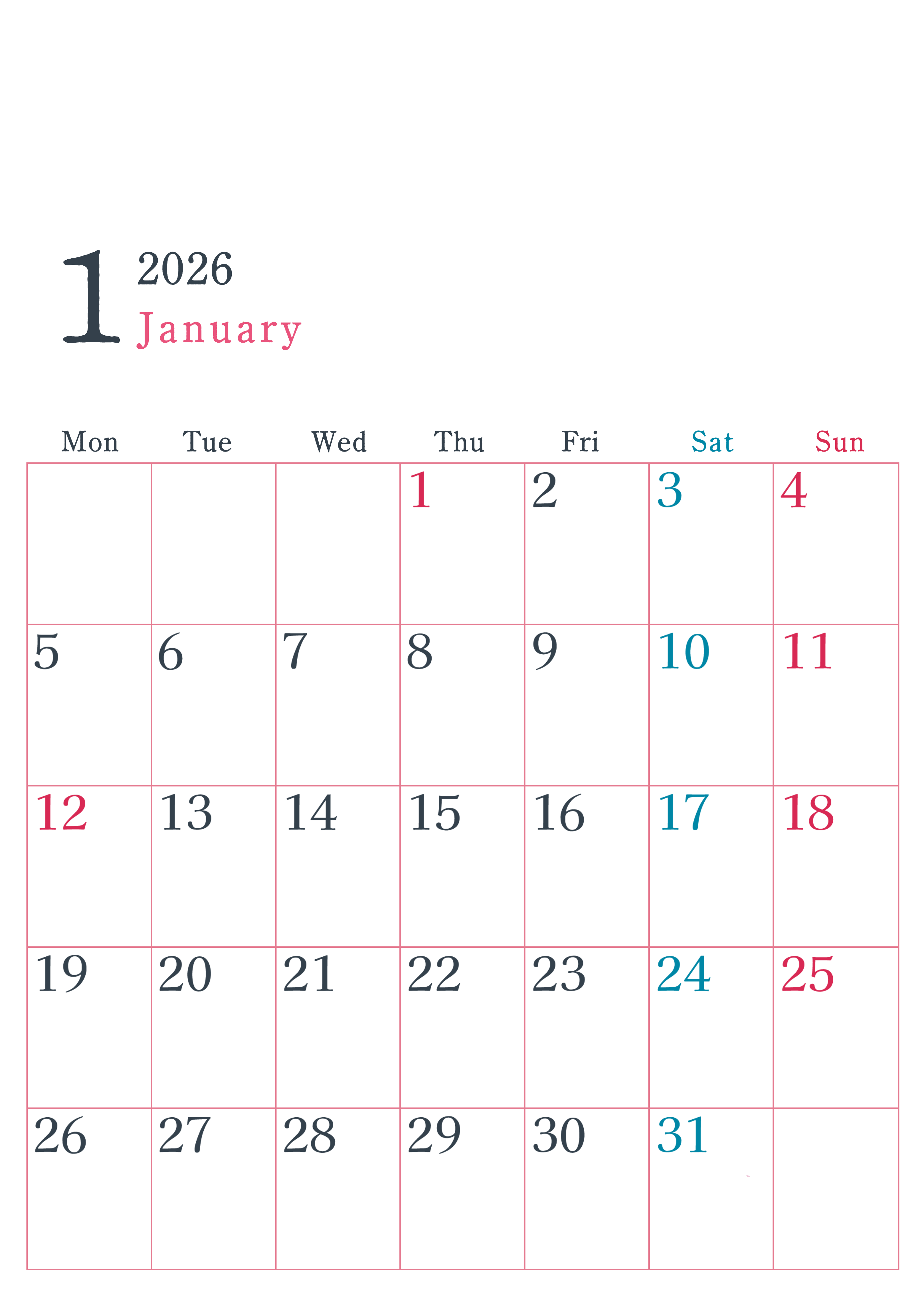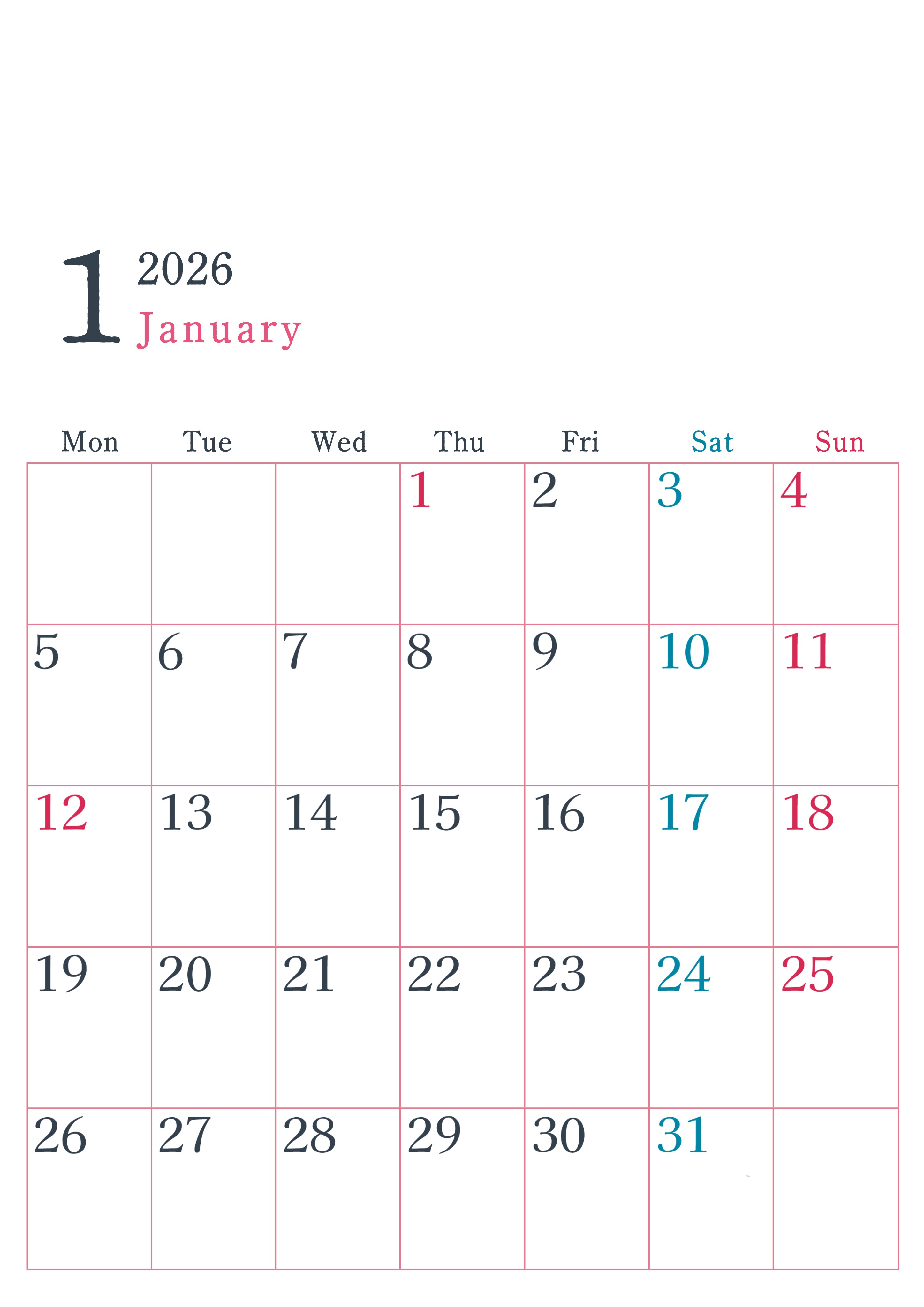 2026年1月縦型月曜始まりのシンプルで書き込みしやすい文字が大きい見やすいおすすめの無料カレンダーです。余白たっぷりで使いやすく、計画を立てるのに最適です。(2026-01150111)