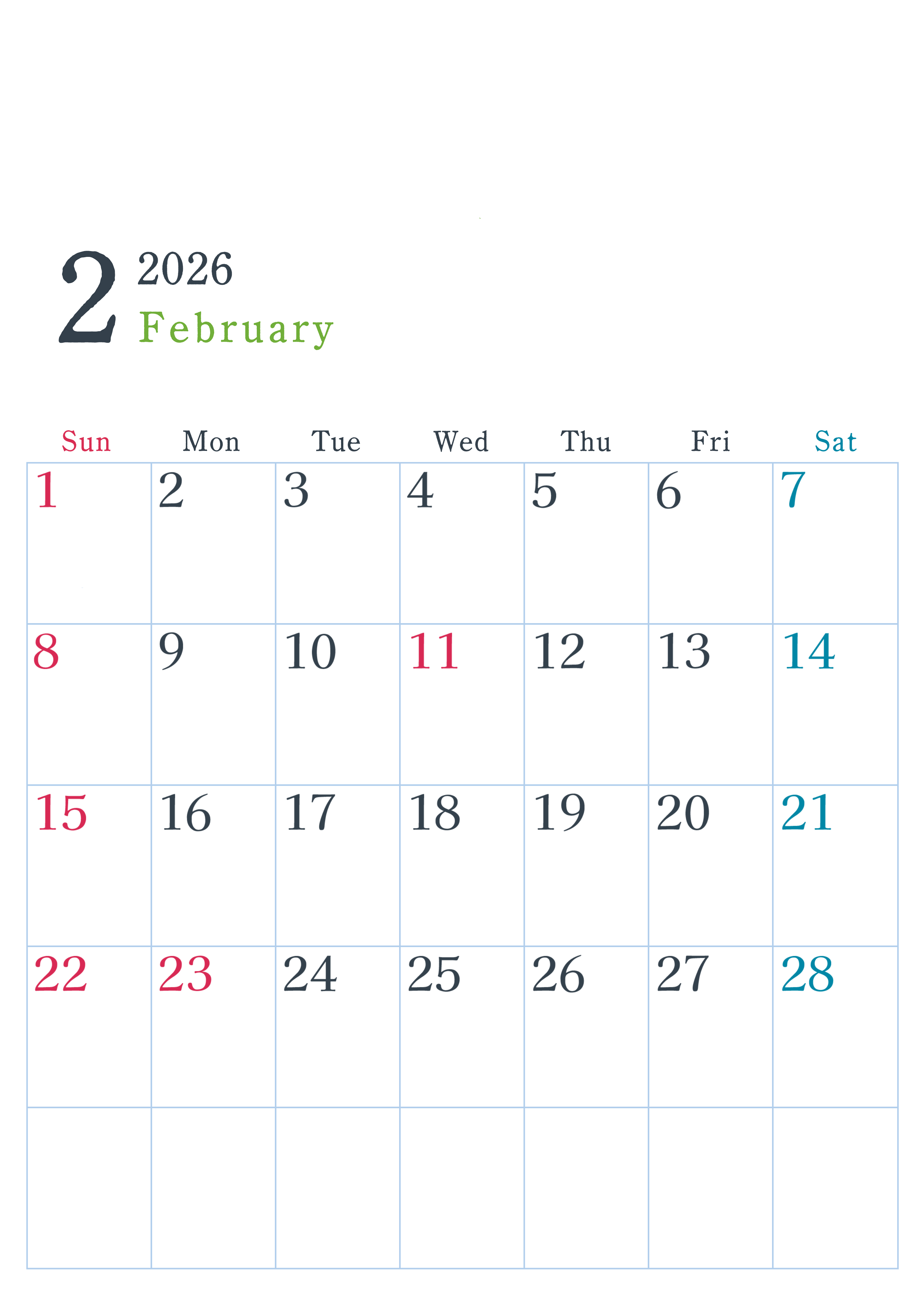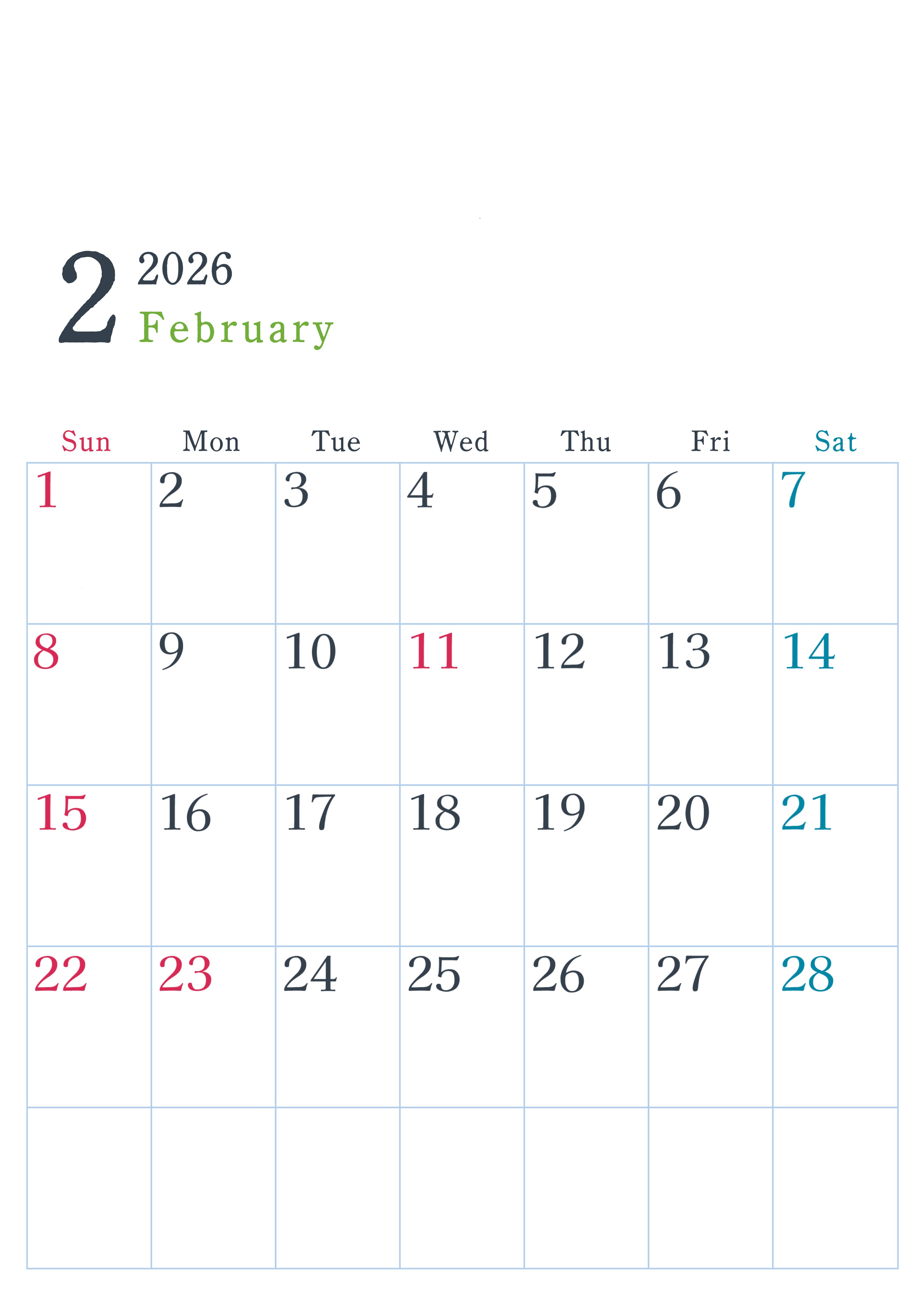 2026年2月縦型日曜始まりのシンプルで書き込みしやすい文字が大きい見やすいおすすめの無料カレンダーです。余白たっぷりで使いやすく、スケジュールを管理しやすいです。(2026-01150210)