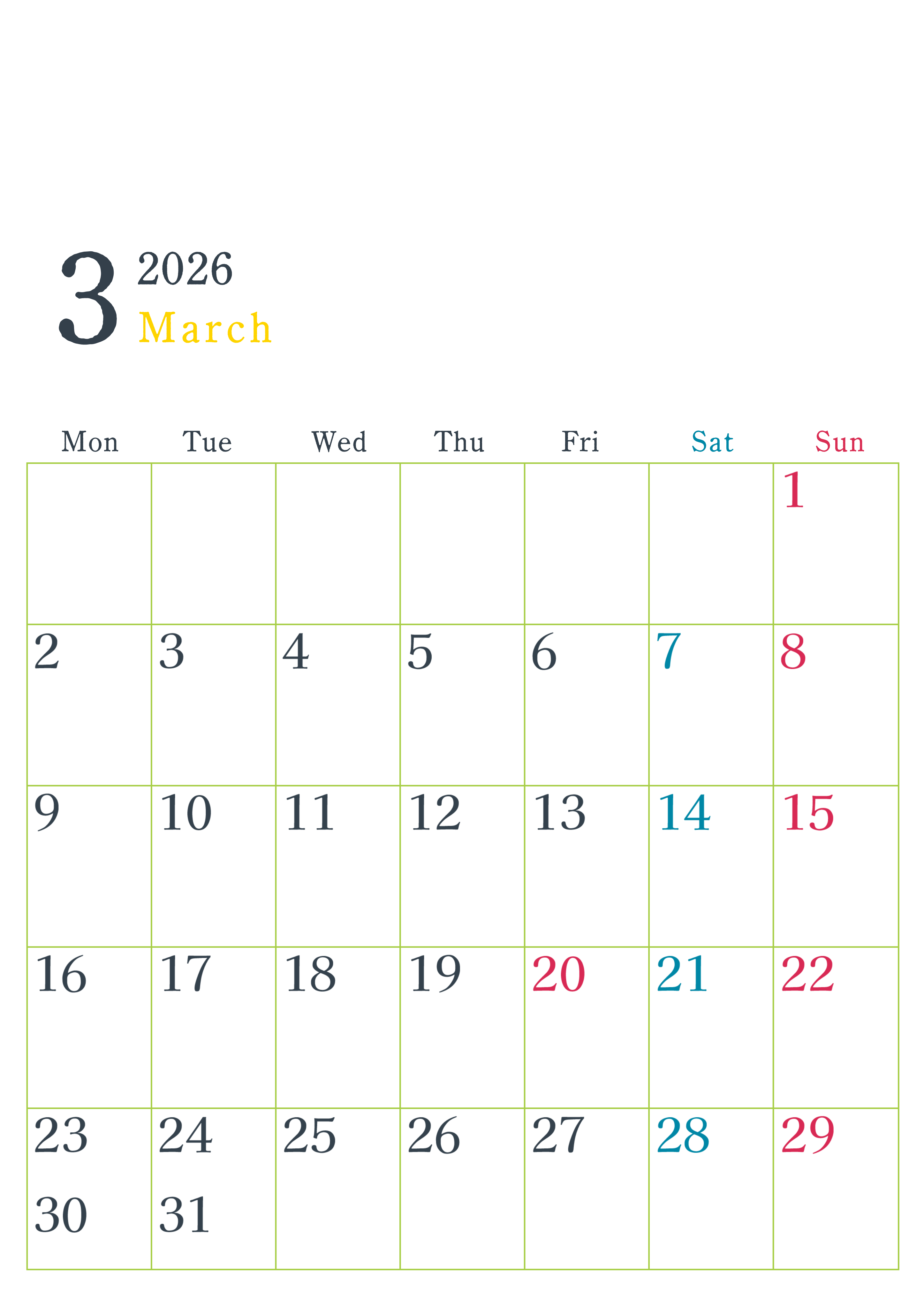 2026年・無料のカレンダーテンプレート 2026年3月縦型月曜始まり シンプルで書き込みしやすい文字が大きい見やすいおすすめの無料カレンダー(2026-01150311) 素材状デザイン王 2025年4月8日 2026年3月縦型月曜始まりのシンプルで書き込みしやすい文字が大きい見やすいおすすめの無料カレンダーです。余白たっぷりで使いやすく、プランの整理にぴったりです。(2026-01150311) シンプル 3月 縦型のカレンダー 月曜始まり カレンダーデザイン-0115