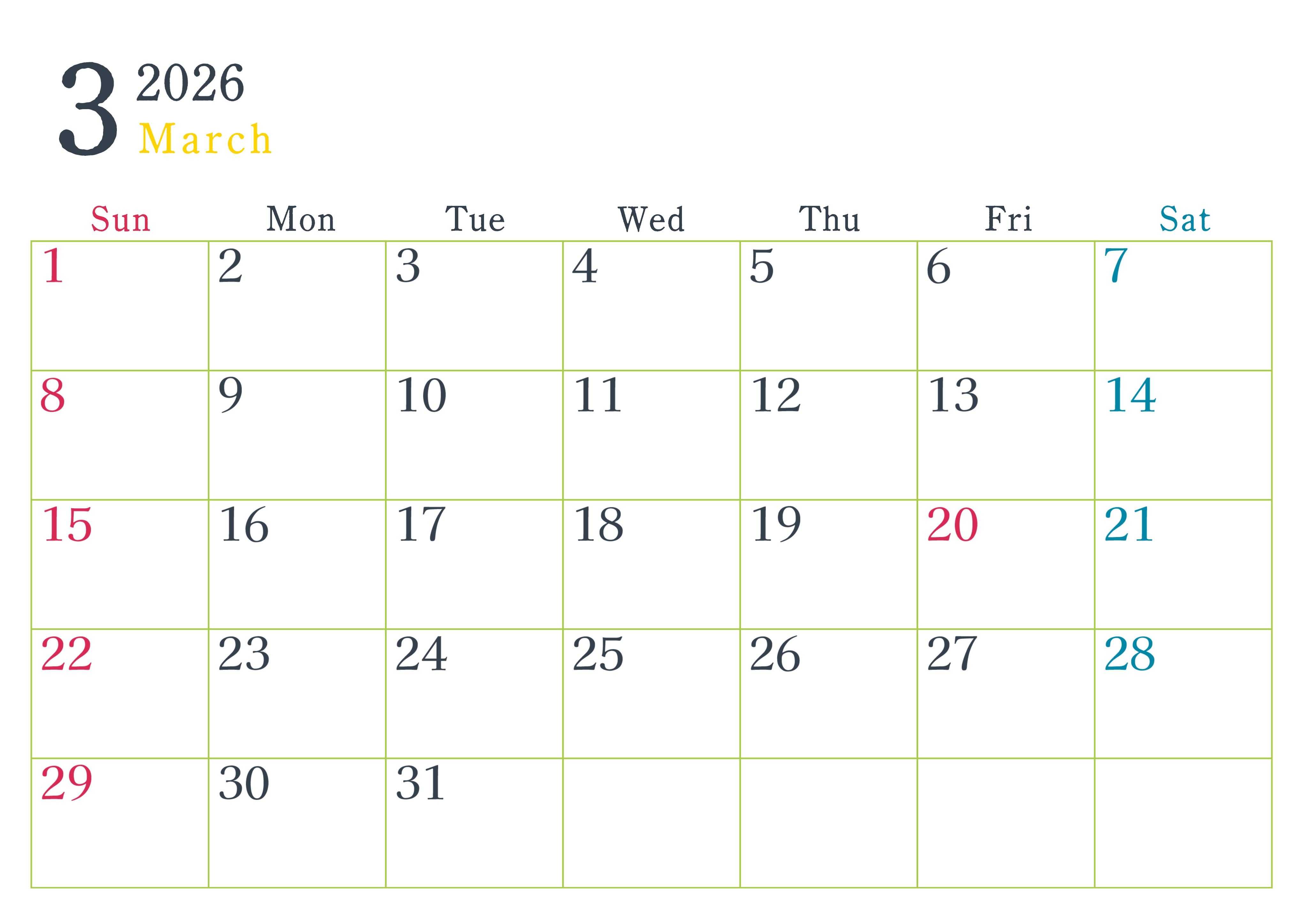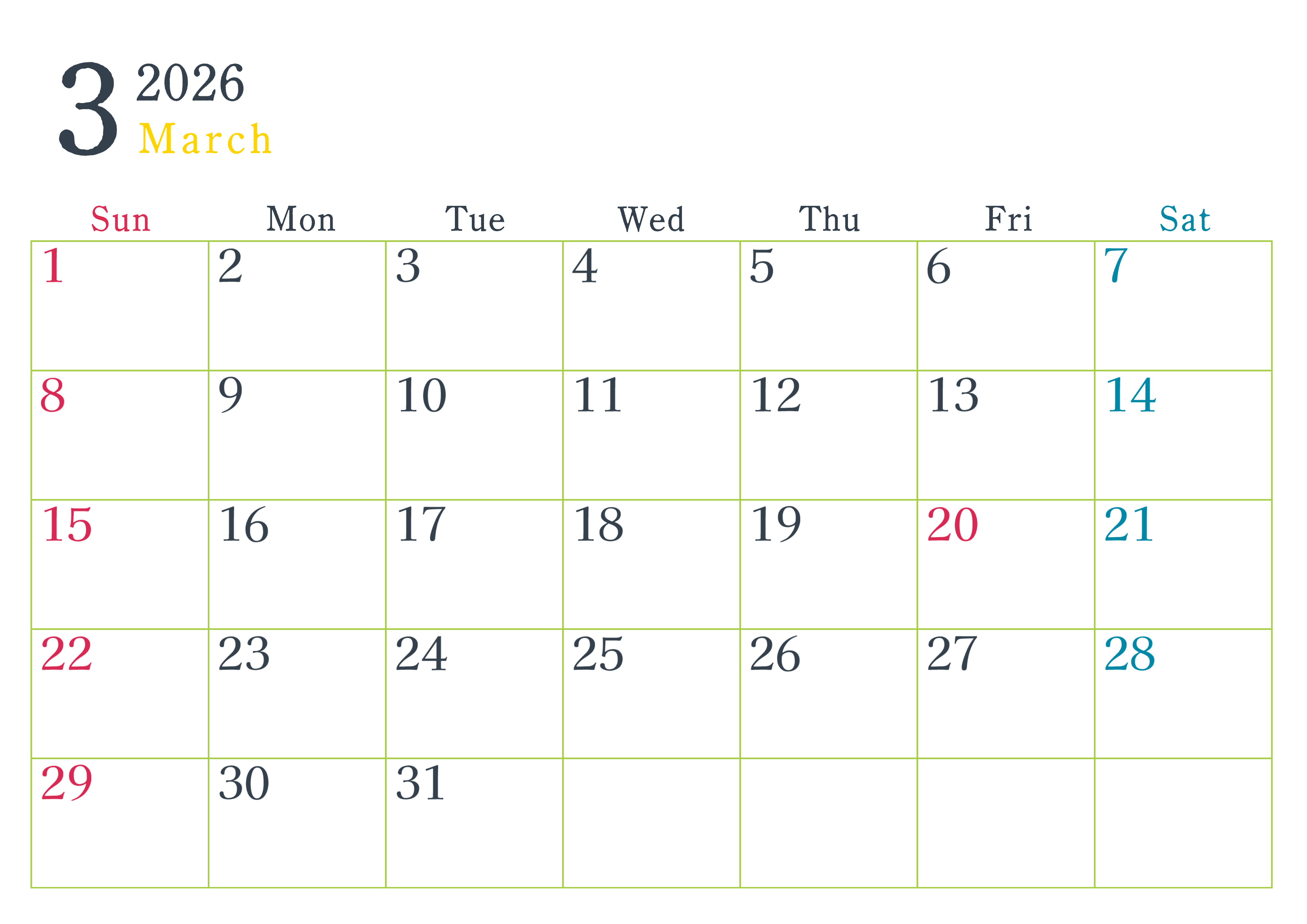 2026年・無料のカレンダーテンプレート 2026年3月横型日曜始まり シンプルで書き込みしやすい文字が大きい見やすいおすすめの無料カレンダー(2026-01150300) 素材状デザイン王 2025年4月8日 2026年3月横型日曜始まりのシンプルで書き込みしやすい文字が大きい見やすいおすすめの無料カレンダーです。余白たっぷりで使いやすく、プランの整理にぴったりです。(2026-01150300) シンプル 3月 横型のカレンダー 日曜始まり カレンダーデザイン-0115