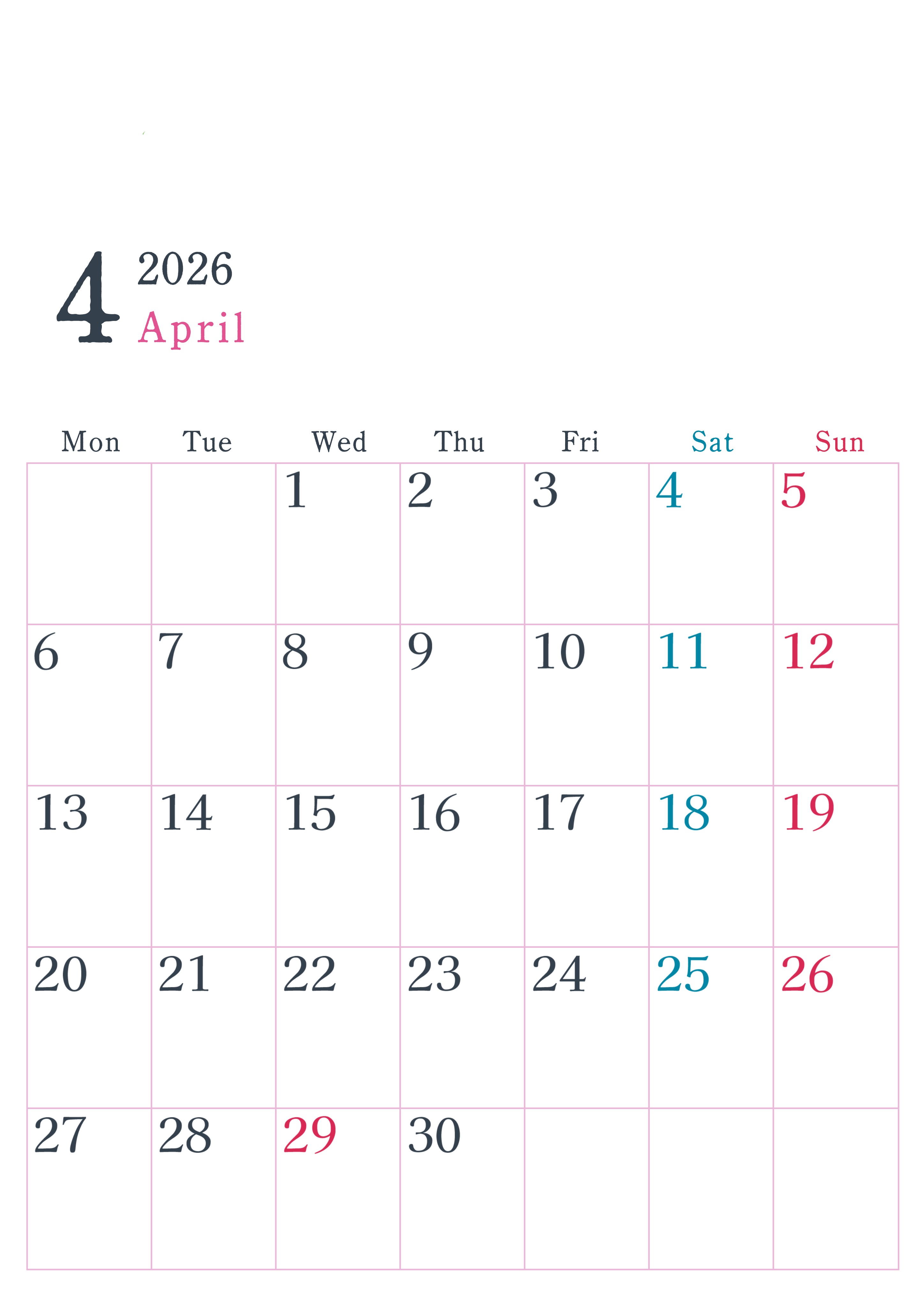 2026年・無料のカレンダーテンプレート 2026年4月縦型月曜始まり シンプルで書き込みしやすい文字が大きい見やすいおすすめの無料カレンダー(2026-01150411) 素材状デザイン王 2025年4月8日 2026年4月縦型月曜始まりのシンプルで書き込みしやすい文字が大きい見やすいおすすめの無料カレンダーです。余白たっぷりで使いやすく、計画を立てるのに最適です。(2026-01150411) シンプル 4月 縦型のカレンダー 月曜始まり カレンダーデザイン-0115