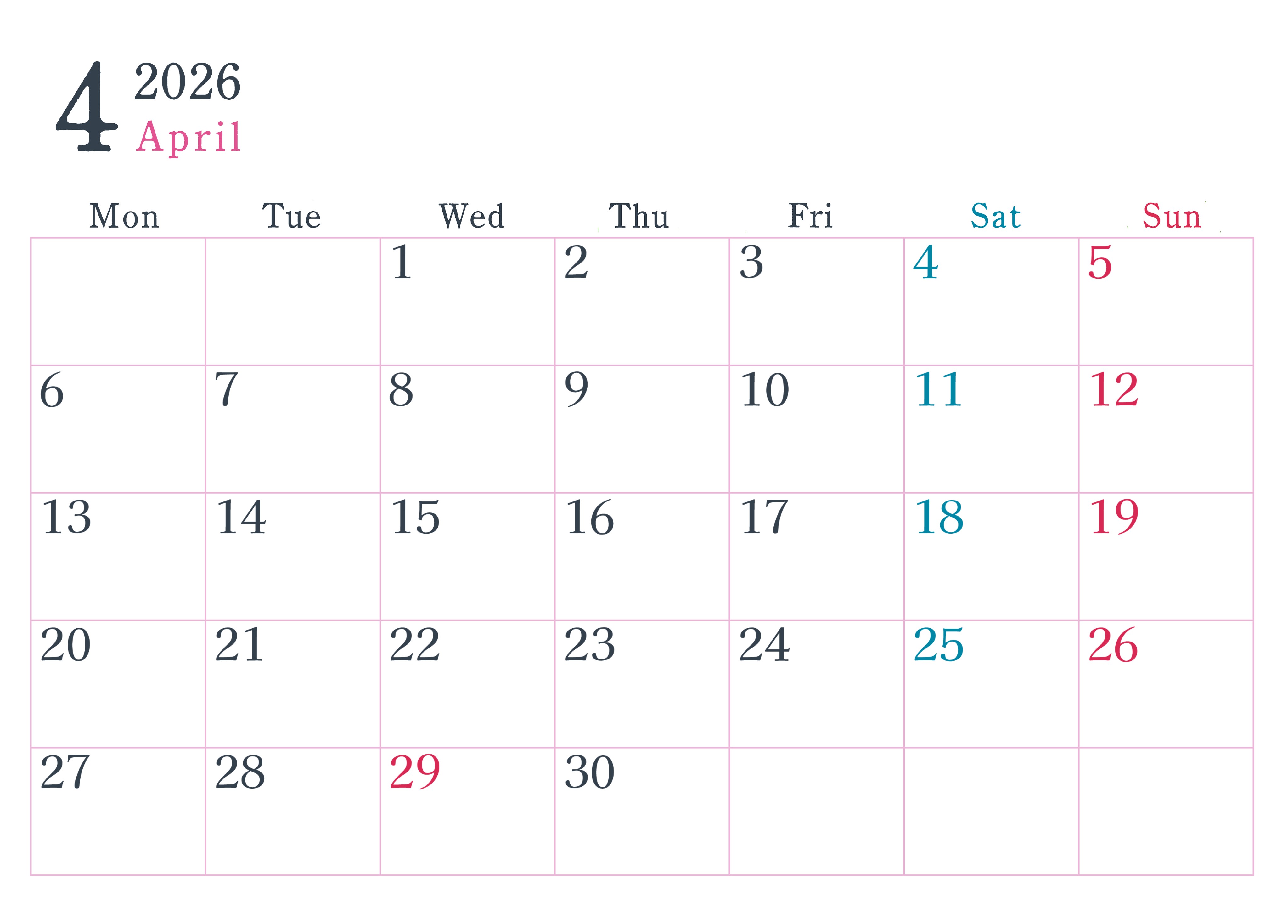 2026年・無料のカレンダーテンプレート 2026年4月横型月曜始まり シンプルで書き込みしやすい文字が大きい見やすいおすすめの無料カレンダー(2026-01150401) 素材状デザイン王 2025年4月8日 2026年4月横型月曜始まりのシンプルで書き込みしやすい文字が大きい見やすいおすすめの無料カレンダーです。余白たっぷりで使いやすく、計画を立てるのに最適です。(2026-01150401) シンプル 4月 横型のカレンダー 月曜始まり カレンダーデザイン-0115