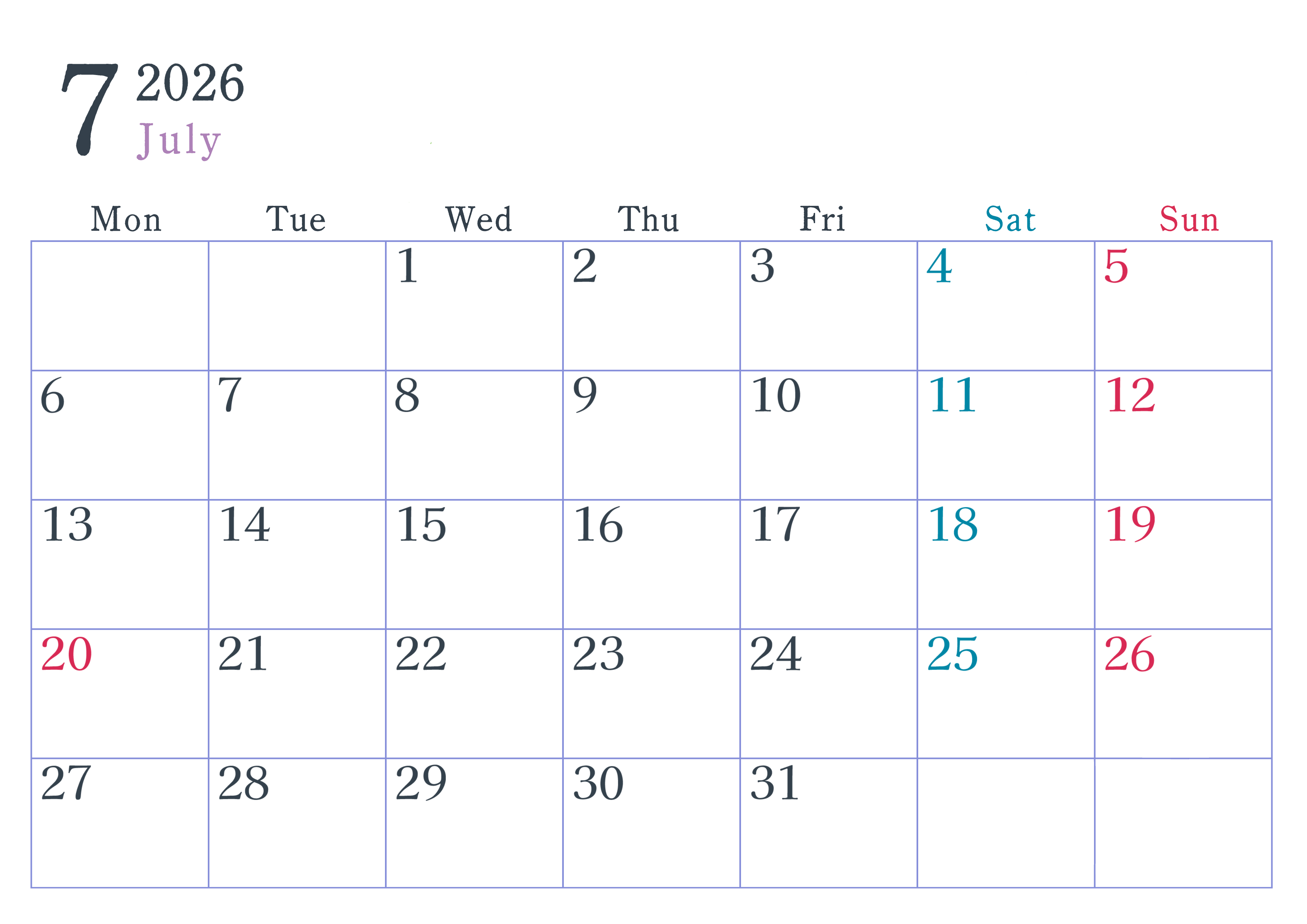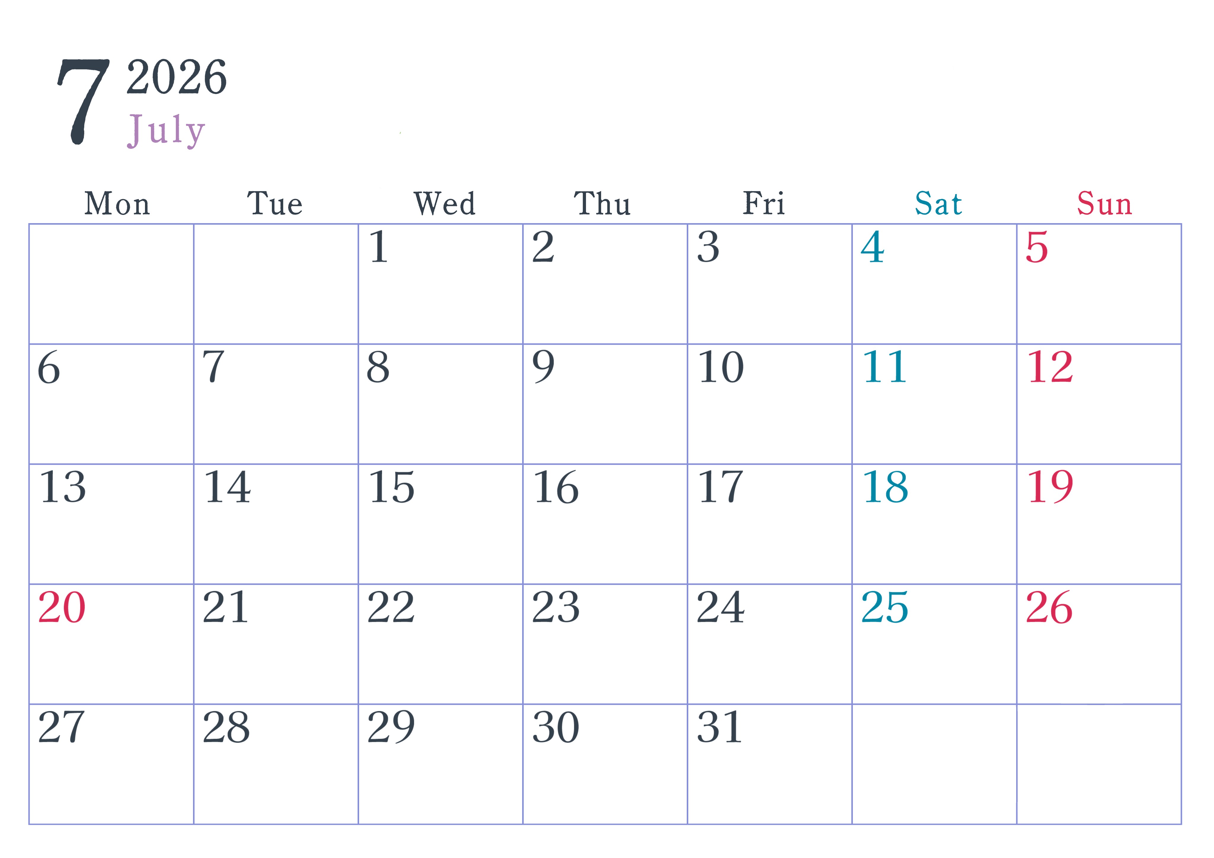 2026年・無料のカレンダーテンプレート 2026年7月横型月曜始まり シンプルで書き込みしやすい文字が大きい見やすいおすすめの無料カレンダー(2026-01150701) 素材状デザイン王 2025年4月8日 2026年7月横型月曜始まりのシンプルで書き込みしやすい文字が大きい見やすいおすすめの無料カレンダーです。余白たっぷりで使いやすく、計画を立てるのに最適です。(2026-01150701) シンプル 7月 横型のカレンダー 月曜始まり カレンダーデザイン-0115