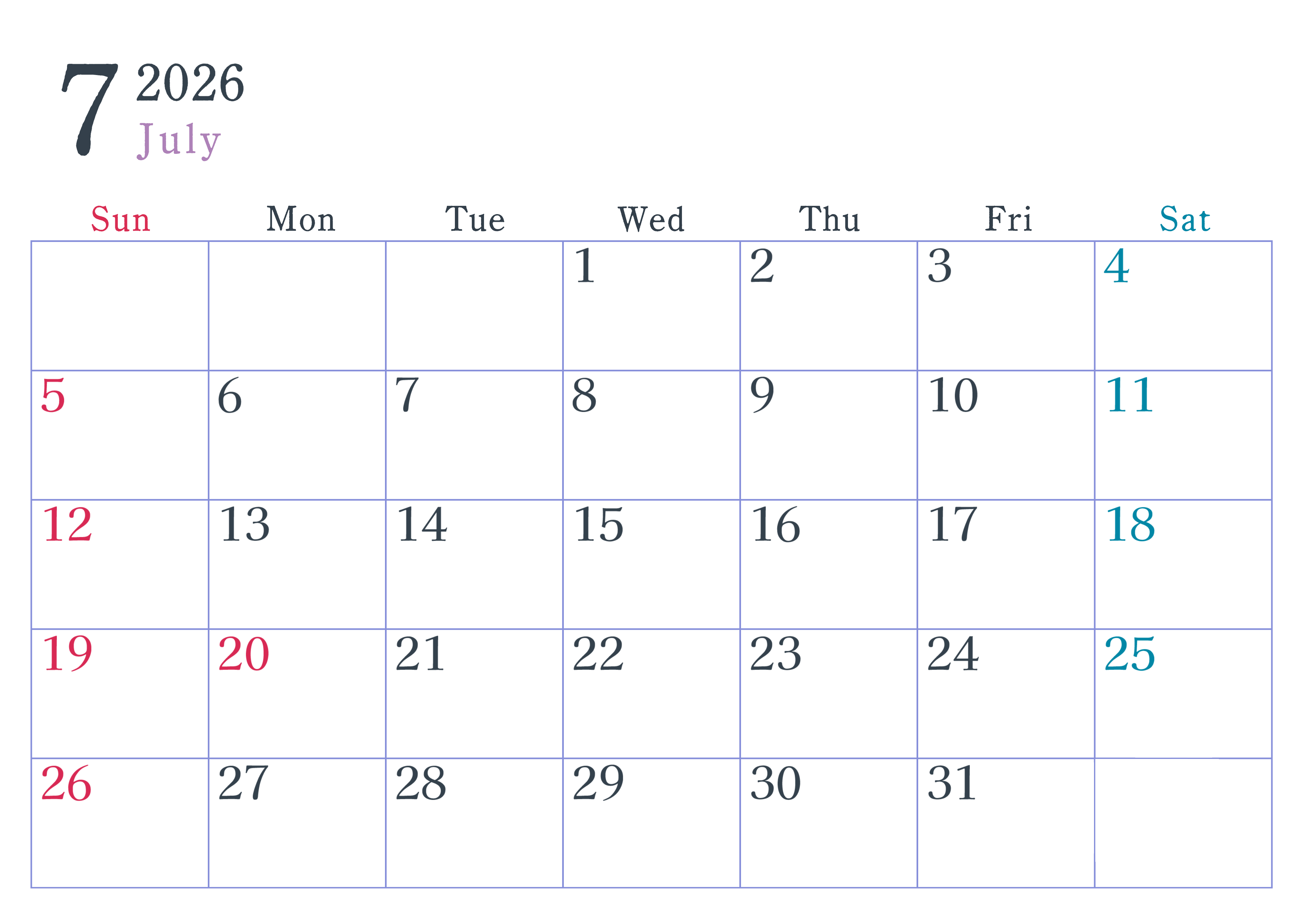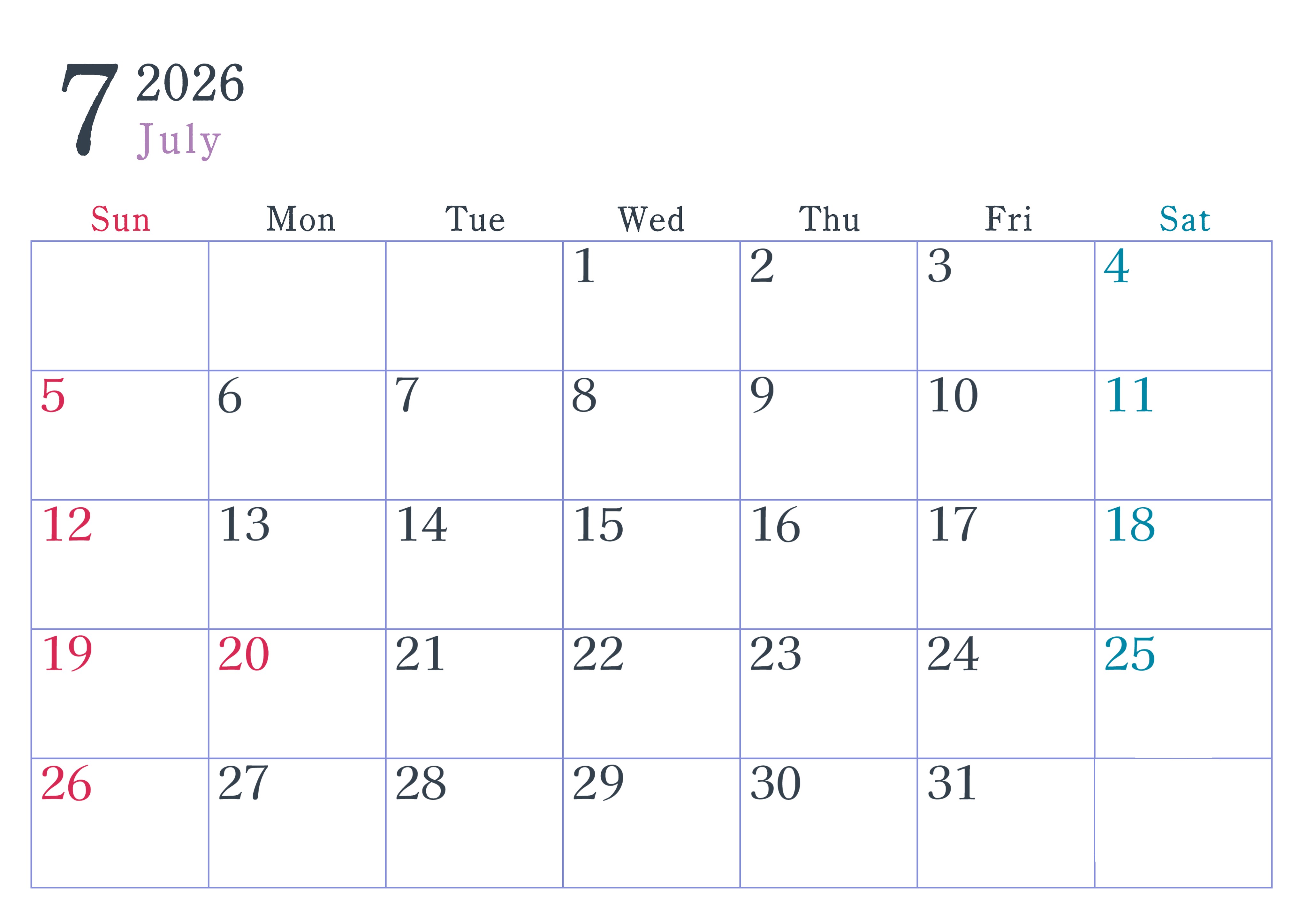 2026年・無料のカレンダーテンプレート 2026年7月横型日曜始まり シンプルで書き込みしやすい文字が大きい見やすいおすすめの無料カレンダー(2026-01150700) 素材状デザイン王 2025年4月8日 2026年7月横型日曜始まりのシンプルで書き込みしやすい文字が大きい見やすいおすすめの無料カレンダーです。余白たっぷりで使いやすく、計画を立てるのに最適です。(2026-01150700) シンプル 7月 横型のカレンダー 日曜始まり カレンダーデザイン-0115