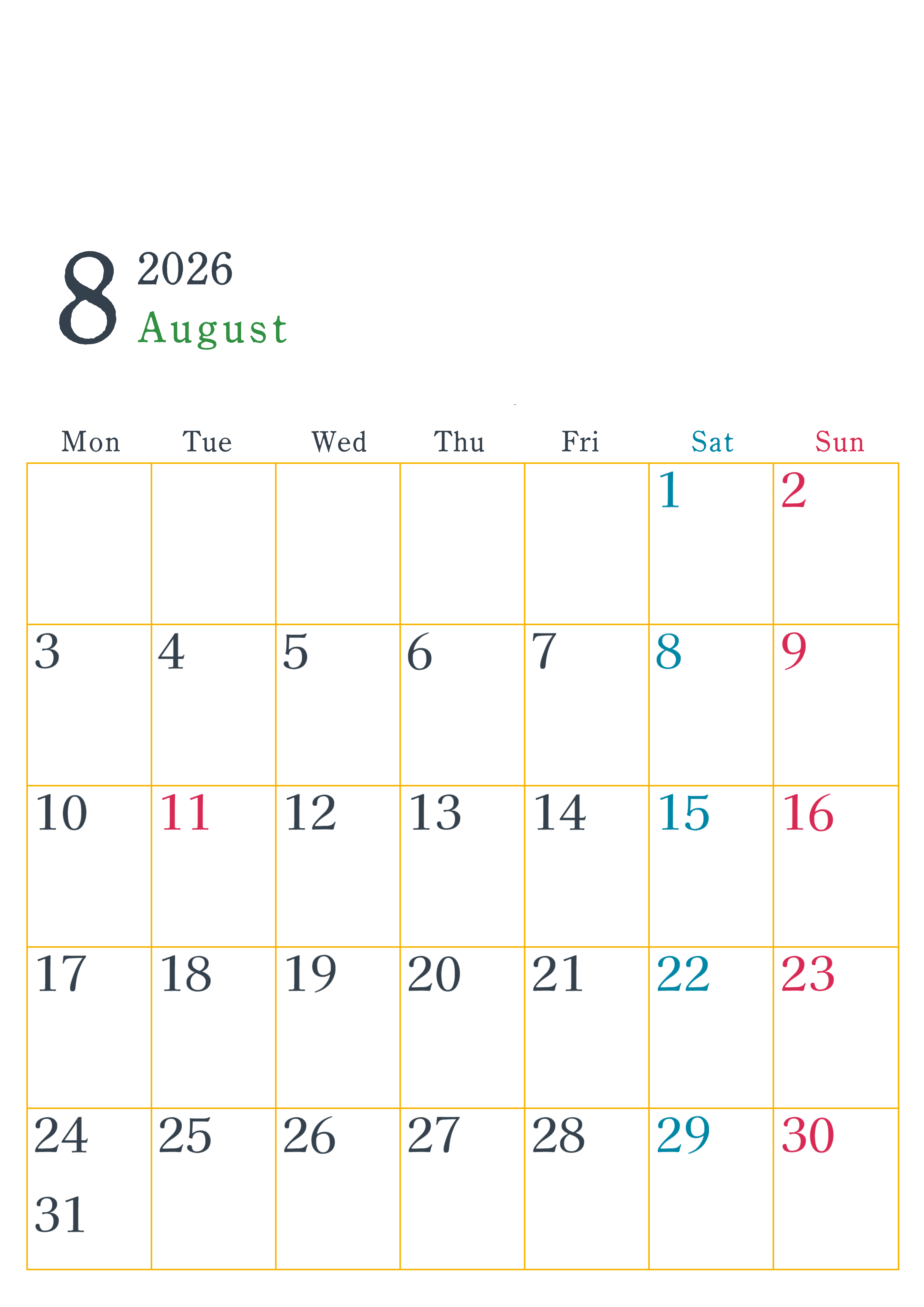 2026年・無料のカレンダーテンプレート 2026年8月縦型月曜始まり シンプルで書き込みしやすい文字が大きい見やすいおすすめの無料カレンダー(2026-01150811) 素材状デザイン王 2025年4月8日 2026年8月縦型月曜始まりのシンプルで書き込みしやすい文字が大きい見やすいおすすめの無料カレンダーです。余白たっぷりで使いやすく、スケジュールを管理しやすいです。(2026-01150811) シンプル 8月 縦型のカレンダー 月曜始まり カレンダーデザイン-0115