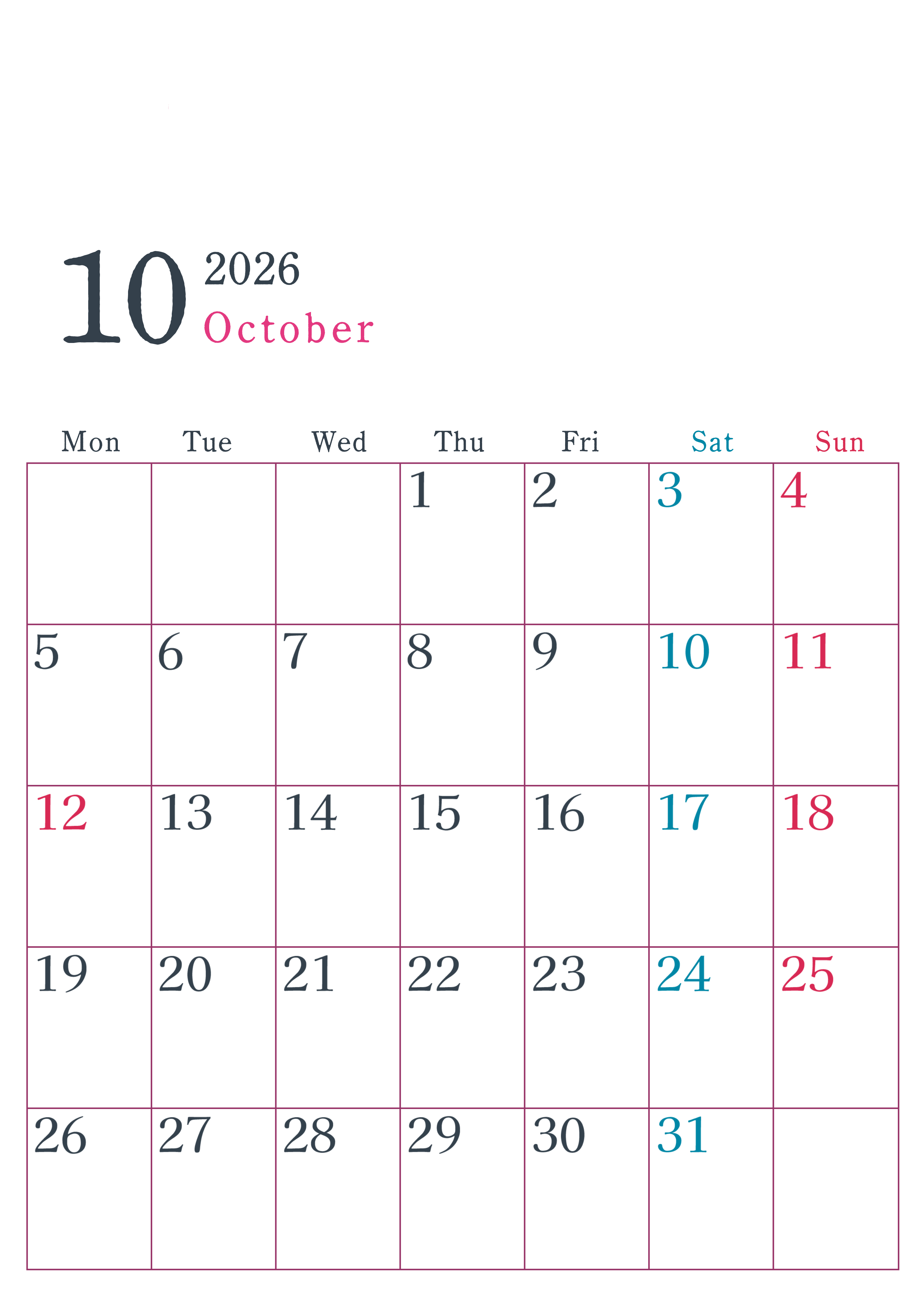 2026年・無料のカレンダーテンプレート 2026年10月縦型月曜始まり シンプルで書き込みしやすい文字が大きい見やすいおすすめの無料カレンダー(2026-01151011) 素材状デザイン王 2025年4月8日 2026年10月縦型月曜始まりのシンプルで書き込みしやすい文字が大きい見やすいおすすめの無料カレンダーです。余白たっぷりで使いやすく、計画を立てるのに最適です。(2026-01151011) シンプル 10月 縦型のカレンダー 月曜始まり カレンダーデザイン-0115