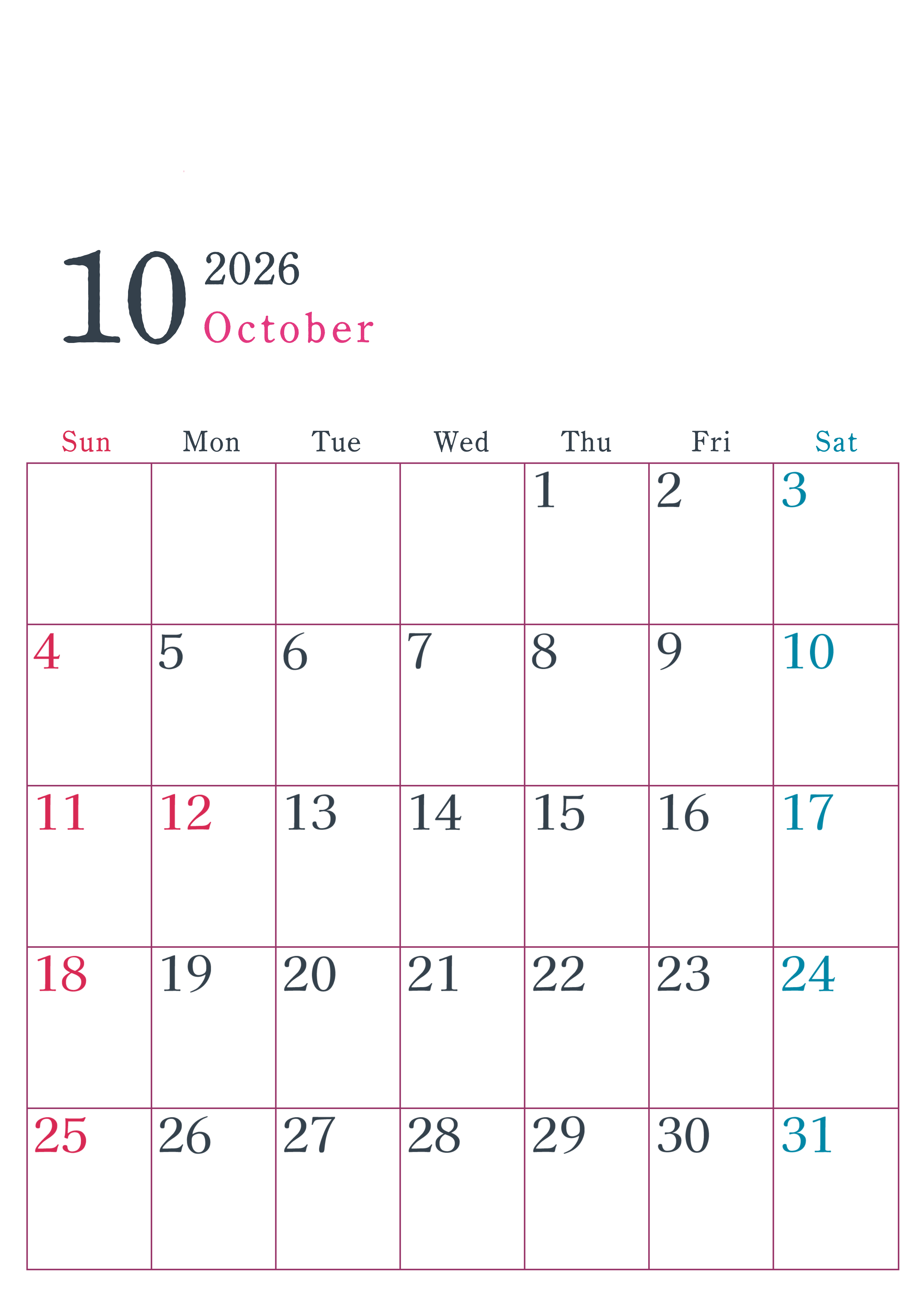 2026年・無料のカレンダーテンプレート 2026年10月縦型日曜始まり シンプルで書き込みしやすい文字が大きい見やすいおすすめの無料カレンダー(2026-01151010) 素材状デザイン王 2025年4月8日 2026年10月縦型日曜始まりのシンプルで書き込みしやすい文字が大きい見やすいおすすめの無料カレンダーです。余白たっぷりで使いやすく、計画を立てるのに最適です。(2026-01151010) シンプル 10月 縦型のカレンダー 日曜始まり カレンダーデザイン-0115