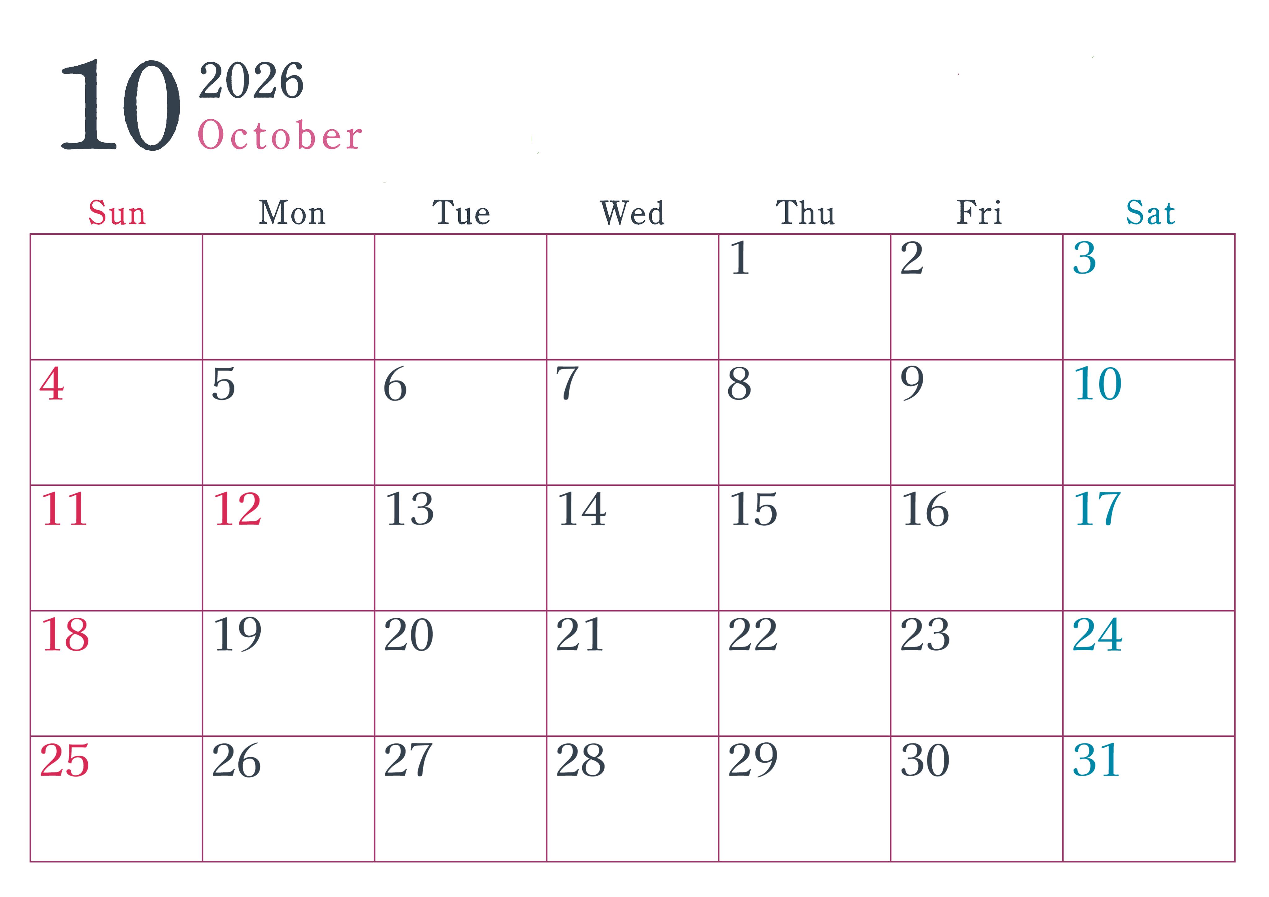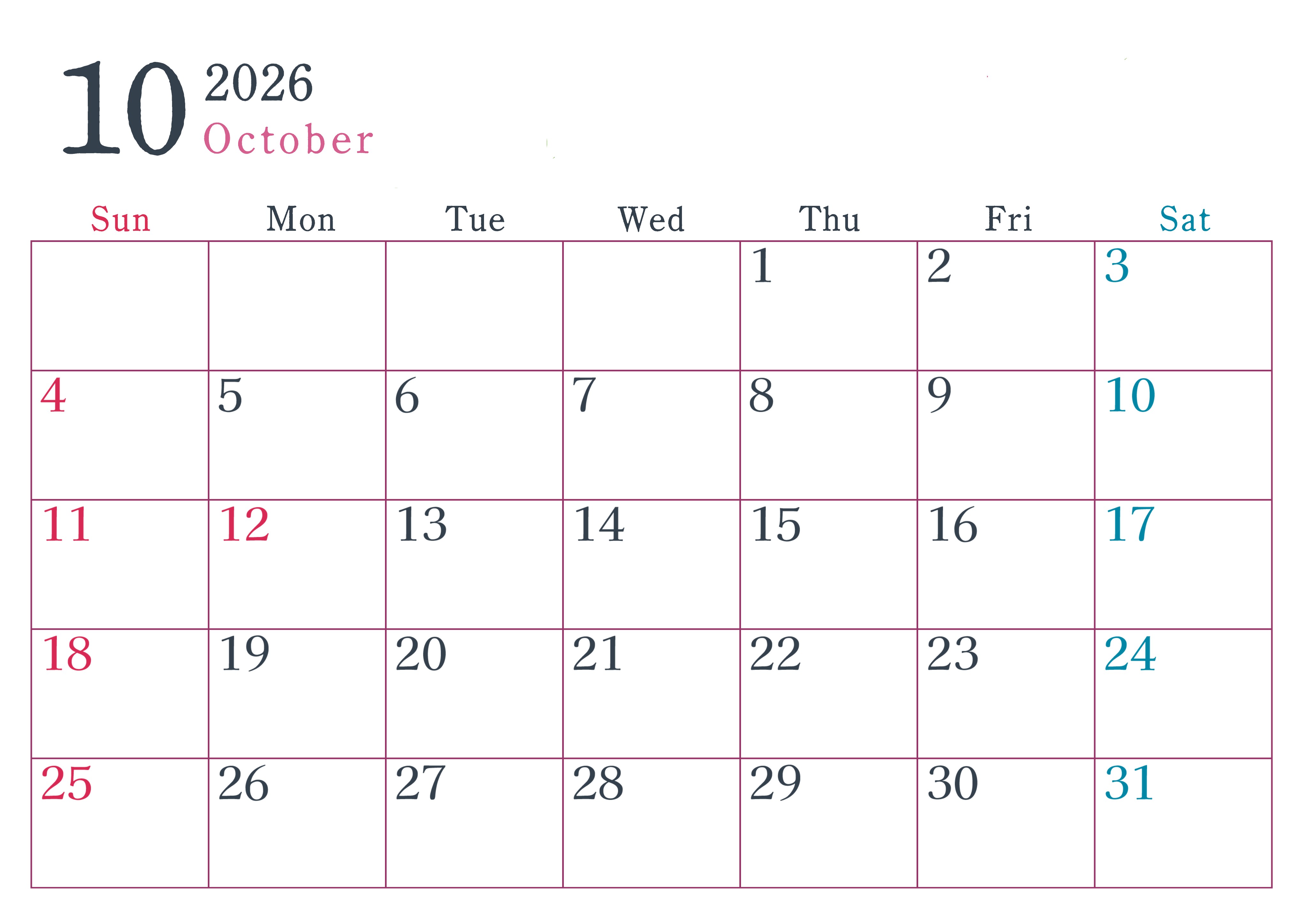 2026年10月横型日曜始まり シンプルで書き込みしやすい文字が大きい見やすいおすすめの無料カレンダー(2026-01151000)