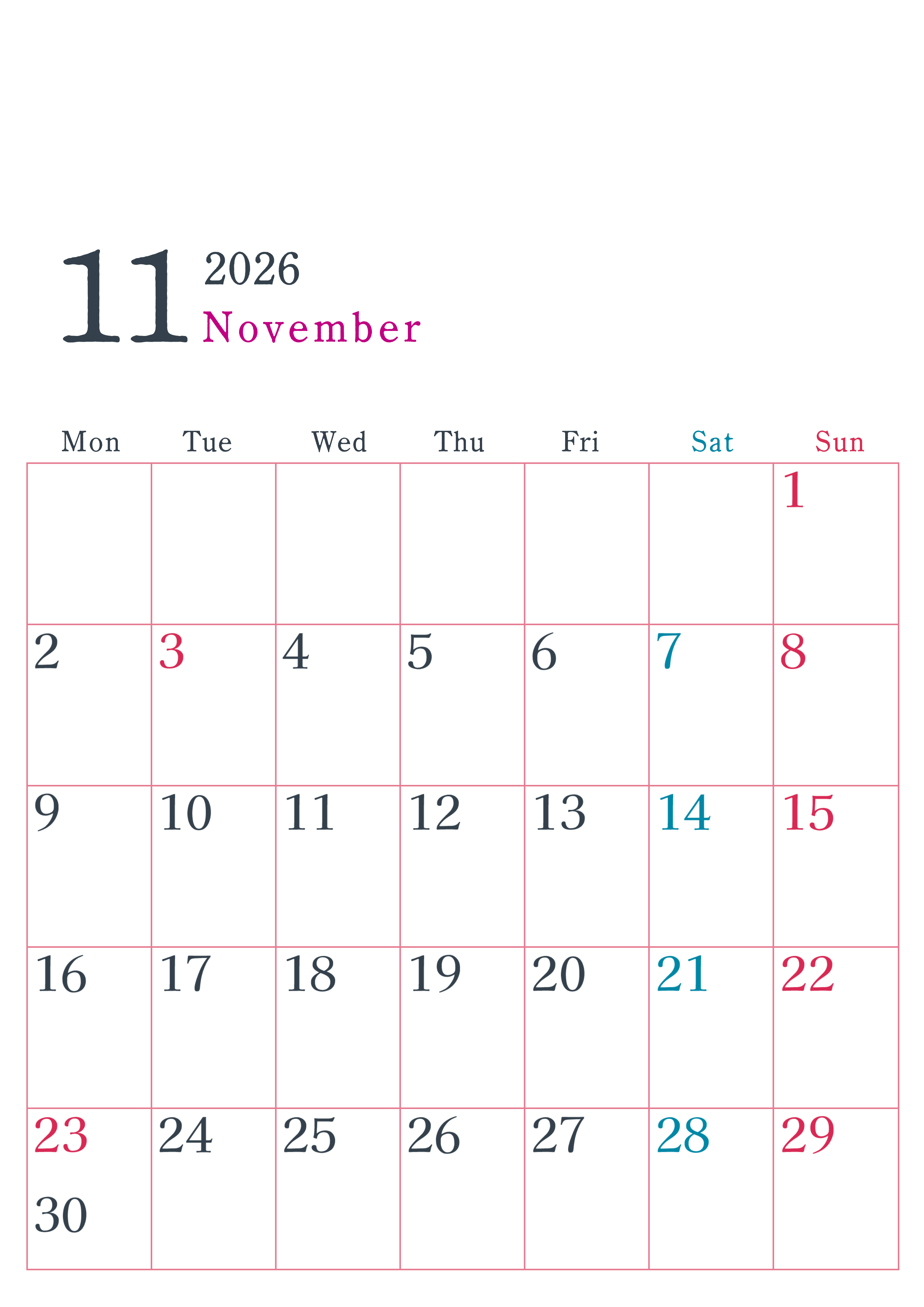 2026年・無料のカレンダーテンプレート 2026年11月縦型月曜始まり シンプルで書き込みしやすい文字が大きい見やすいおすすめの無料カレンダー(2026-01151111) 素材状デザイン王 2025年4月8日 2026年11月縦型月曜始まりのシンプルで書き込みしやすい文字が大きい見やすいおすすめの無料カレンダーです。余白たっぷりで使いやすく、スケジュールを管理しやすいです。(2026-01151111) シンプル 11月 縦型のカレンダー 月曜始まり カレンダーデザイン-0115