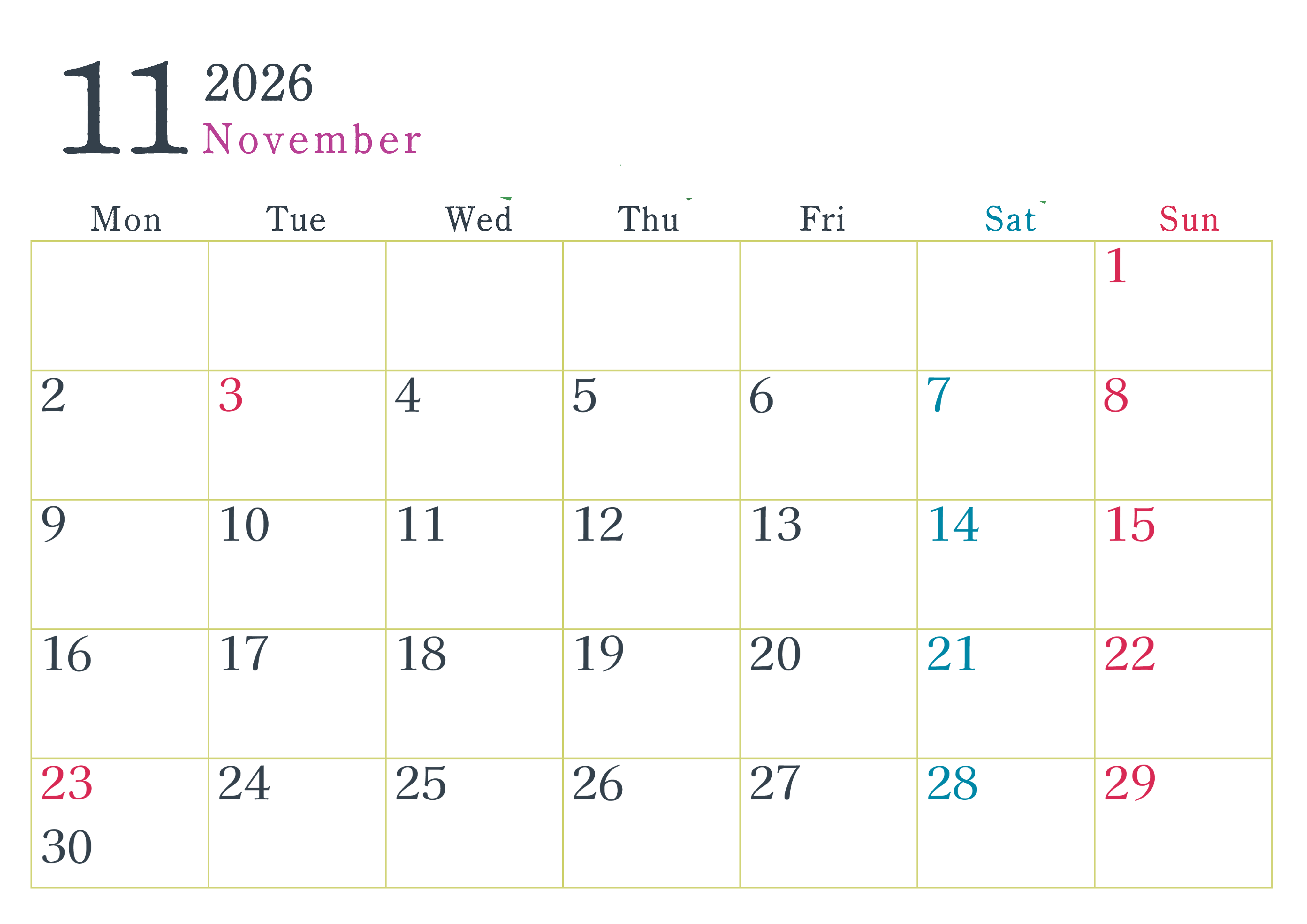 2026年・無料のカレンダーテンプレート 2026年11月横型月曜始まり シンプルで書き込みしやすい文字が大きい見やすいおすすめの無料カレンダー(2026-01151101) 素材状デザイン王 2025年4月8日 2026年11月横型月曜始まりのシンプルで書き込みしやすい文字が大きい見やすいおすすめの無料カレンダーです。余白たっぷりで使いやすく、スケジュールを管理しやすいです。(2026-01151101) シンプル 11月 横型のカレンダー 月曜始まり カレンダーデザイン-0115