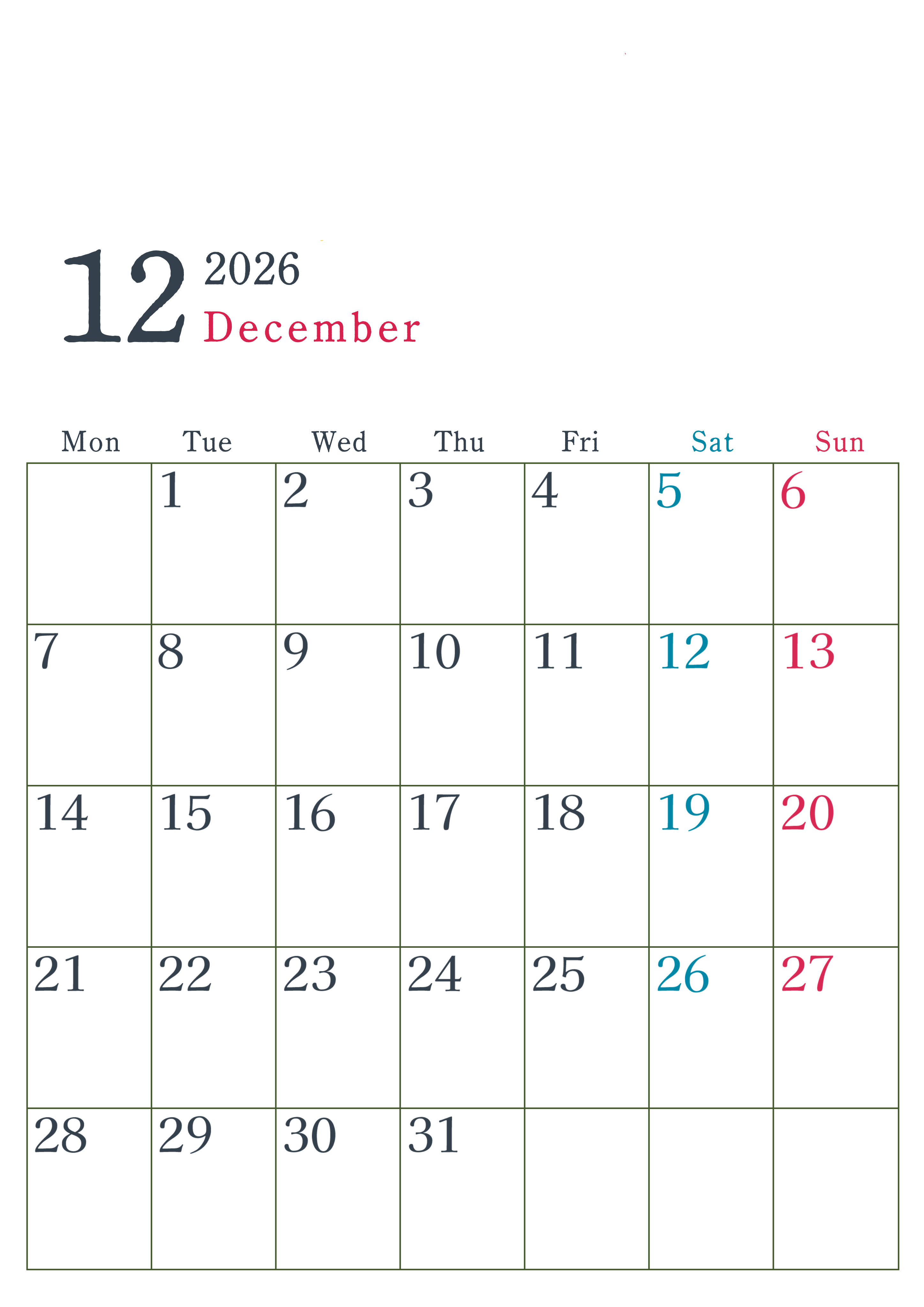 2026年・無料のカレンダーテンプレート 2026年12月縦型月曜始まり シンプルで書き込みしやすい文字が大きい見やすいおすすめの無料カレンダー(2026-01151211) 素材状デザイン王 2025年4月8日 2026年12月縦型月曜始まりのシンプルで書き込みしやすい文字が大きい見やすいおすすめの無料カレンダーです。余白たっぷりで使いやすく、プランの整理にぴったりです。(2026-01151211) シンプル 12月 縦型のカレンダー 月曜始まり カレンダーデザイン-0115