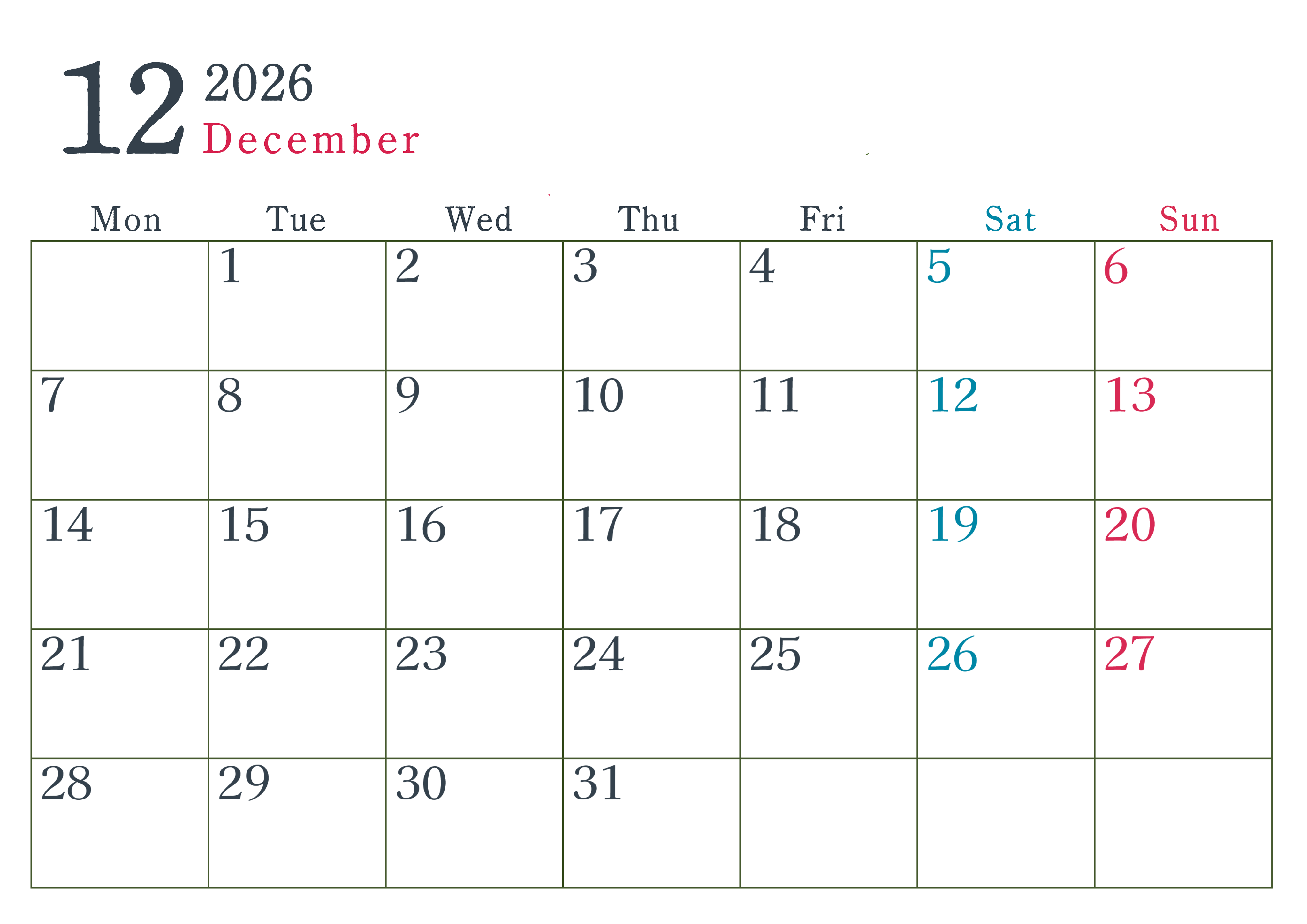 2026年・無料のカレンダーテンプレート 2026年12月横型月曜始まり シンプルで書き込みしやすい文字が大きい見やすいおすすめの無料カレンダー(2026-01151201) 素材状デザイン王 2025年4月8日 2026年12月横型月曜始まりのシンプルで書き込みしやすい文字が大きい見やすいおすすめの無料カレンダーです。余白たっぷりで使いやすく、プランの整理にぴったりです。(2026-01151201) シンプル 12月 横型のカレンダー 月曜始まり カレンダーデザイン-0115