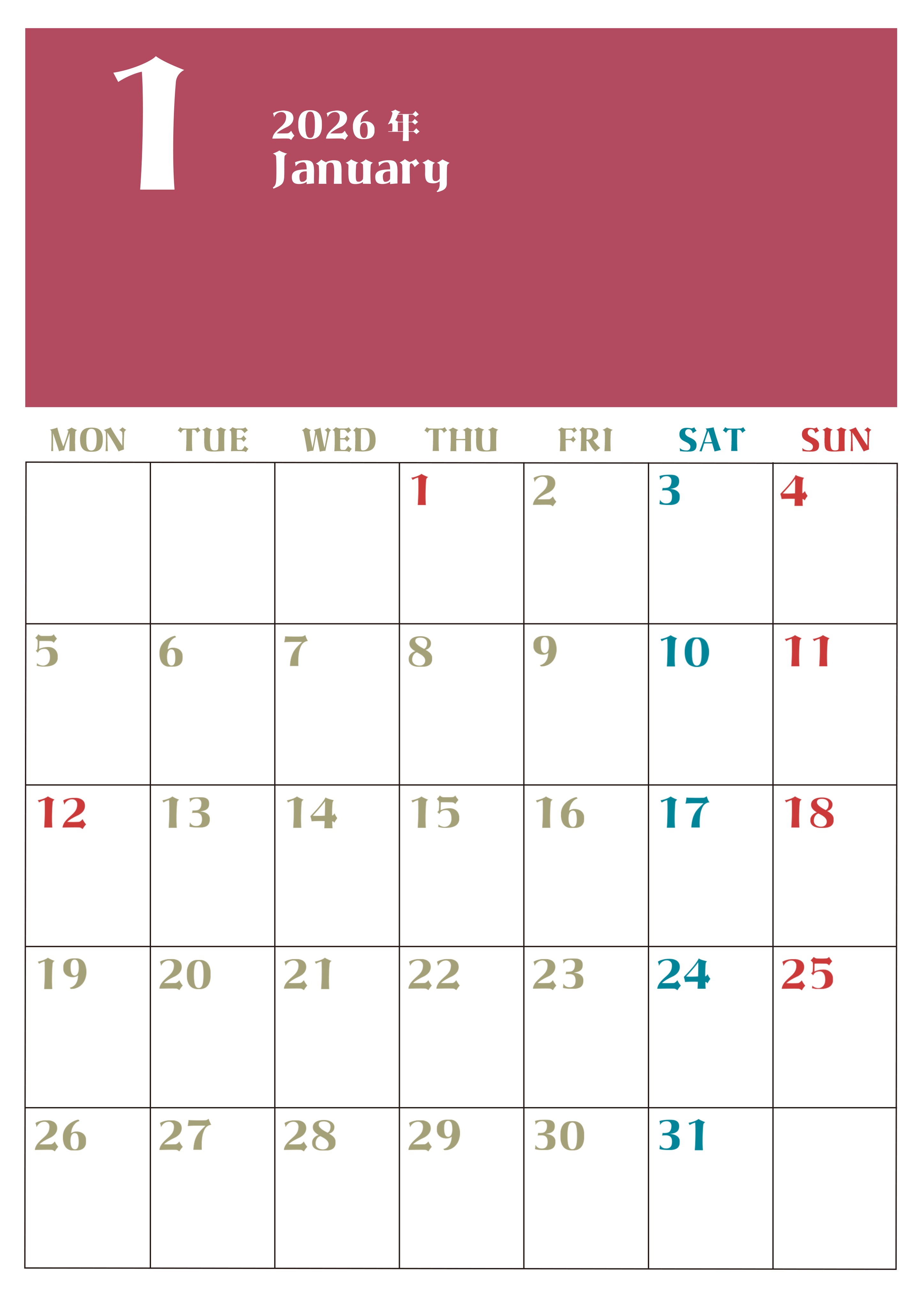 2026年1月のシンプルなカレンダーは縦型月のシンプルなカレンダーは曜始まりの大きい文字が見やすい書き込みも楽なA4サイズの無料素材です。スケジュールの整理におすすめのフリー素材です。計画を効率的に立てるのにおすすめです。(2026-01160111)