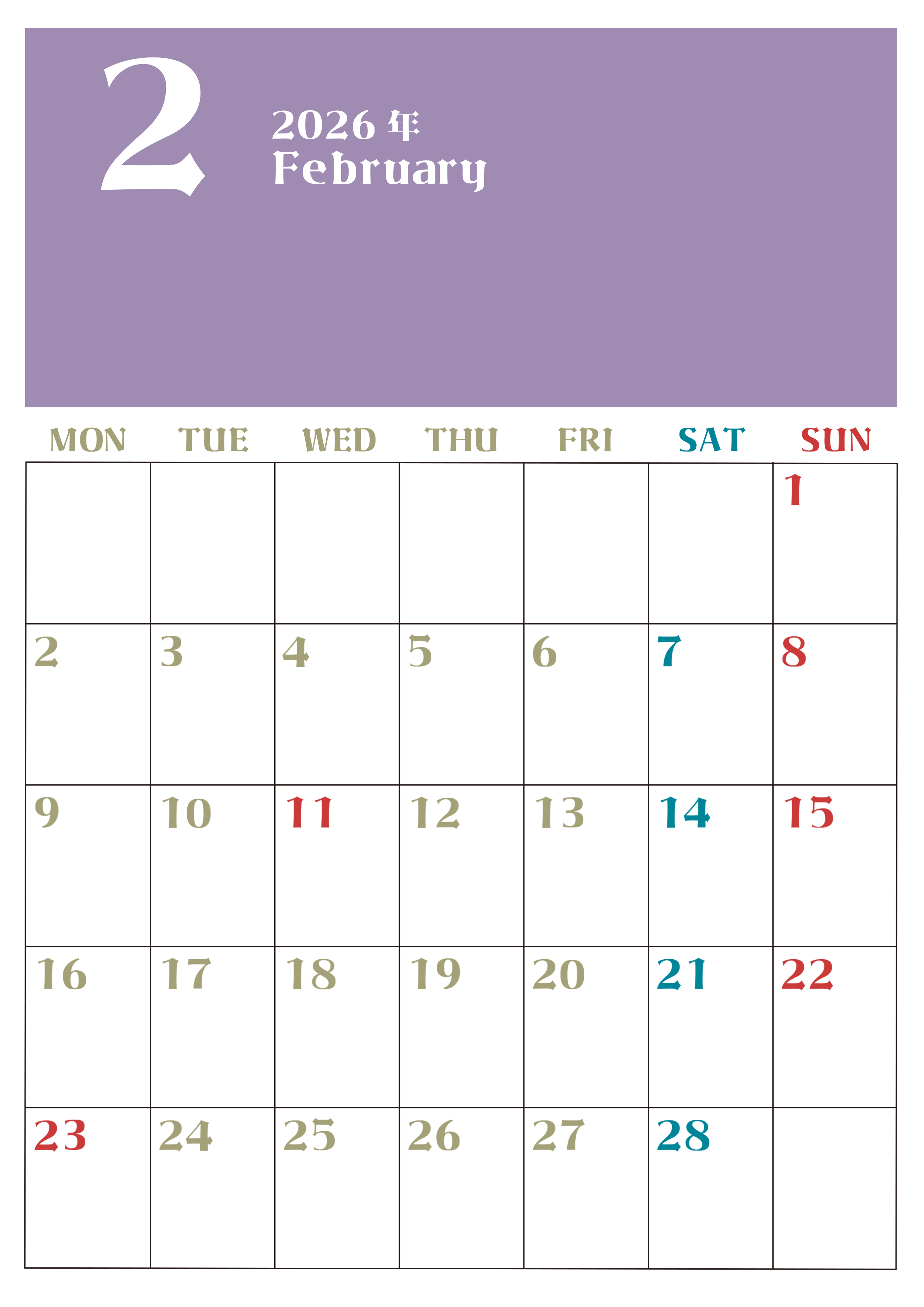 2026年2月のシンプルなカレンダーは縦型月のシンプルなカレンダーは曜始まりで大きい文字が見やすい書き込みも楽なA4サイズの無料素材(2026-01160211)