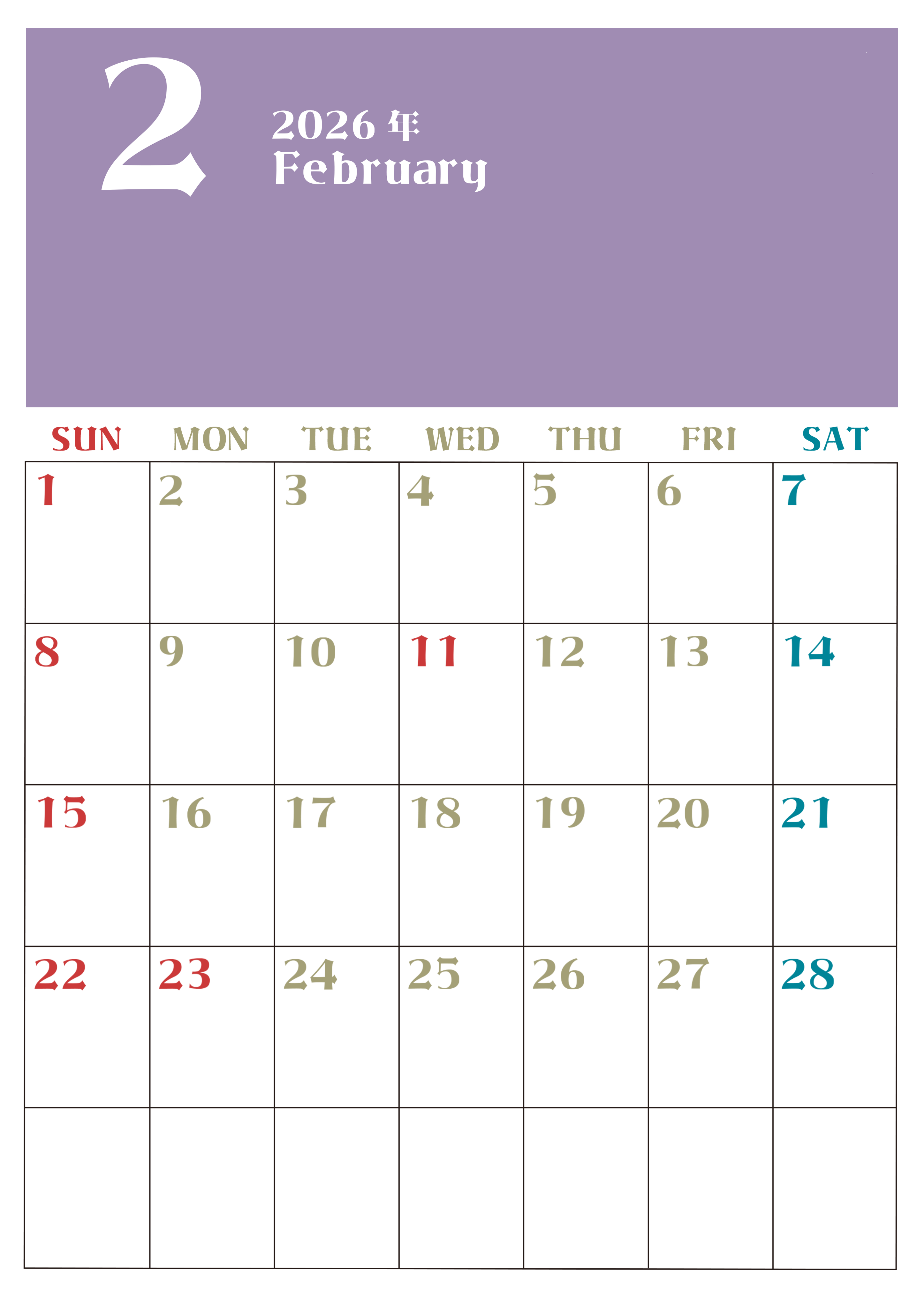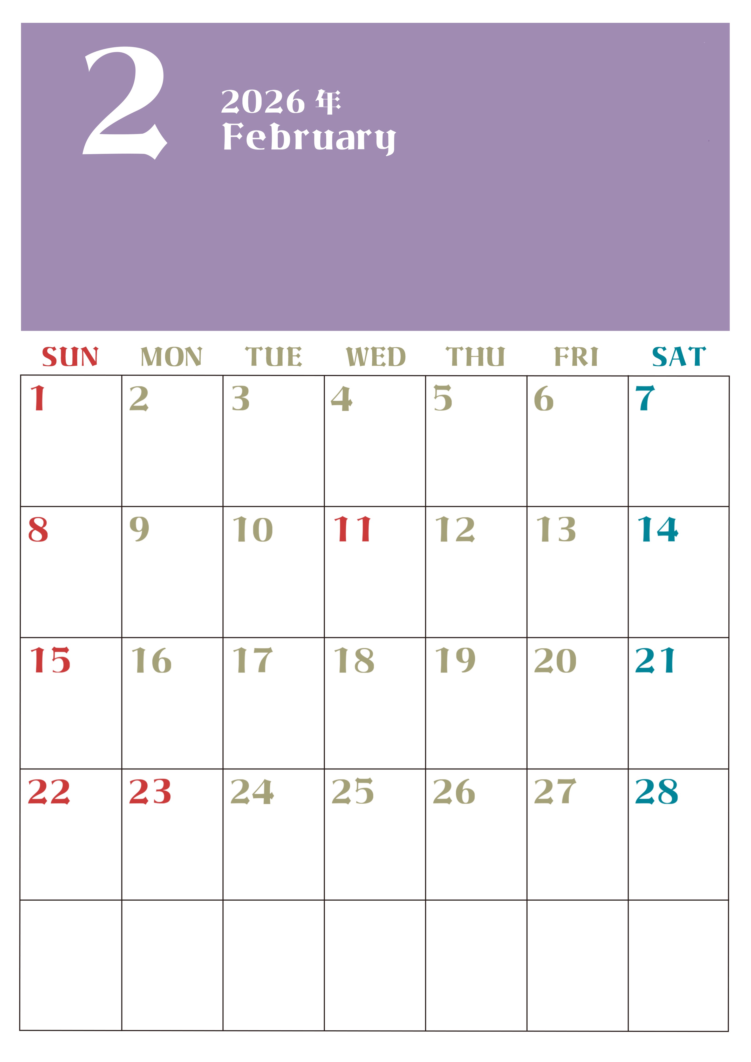 2026年2月のシンプルなカレンダーは縦型日曜始まりの大きい文字が見やすい書き込みも楽なA4サイズの無料素材です。スケジュールの整理におすすめのフリー素材です。忙しいスケジュールを簡単にまとめて書き込みするのにおすすめです。(2026-01160210)