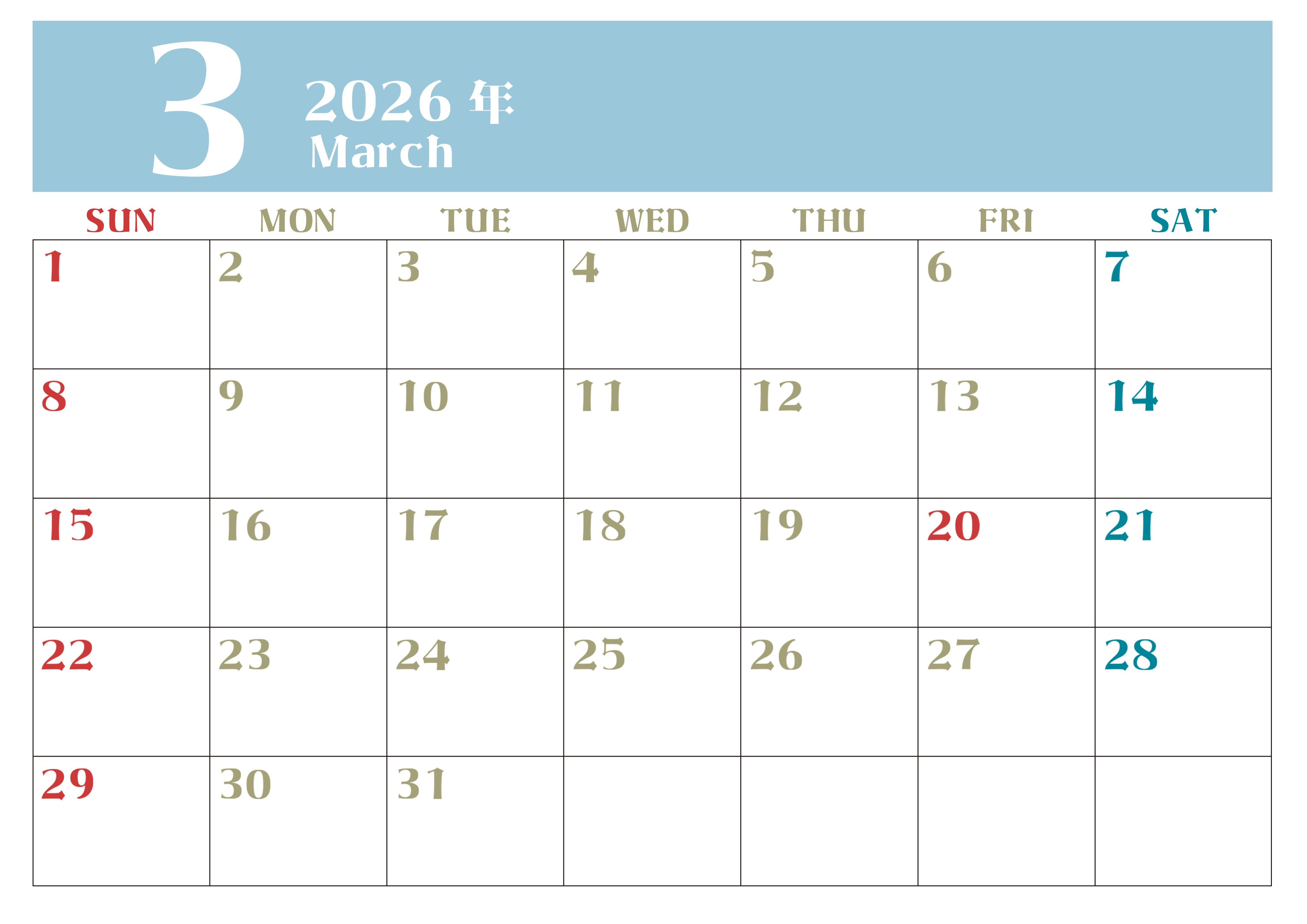 2026年3月のシンプルなカレンダーは横型日曜始まりの大きい文字が見やすい書き込みも楽なA4サイズの無料素材です。スケジュールの整理におすすめのフリー素材です。多忙なプランの可視化におすすめです。(2026-01160300)