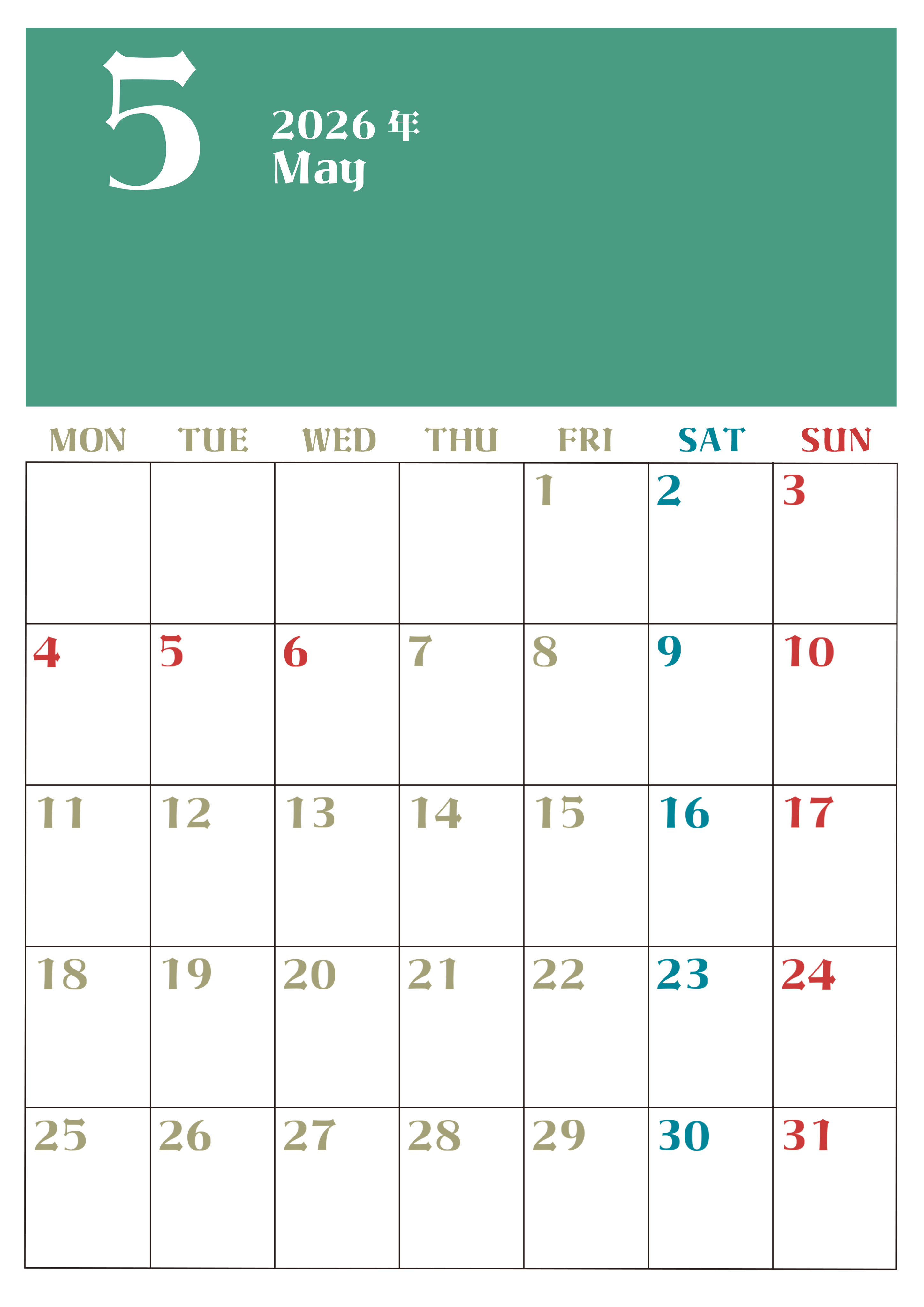 2026年5月のシンプルなカレンダーは縦型月のシンプルなカレンダーは曜始まりの大きい文字が見やすい書き込みも楽なA4サイズの無料素材です。スケジュールの整理におすすめのフリー素材です。忙しいスケジュールを簡単にまとめて書き込みするのにおすすめです。(2026-01160511)