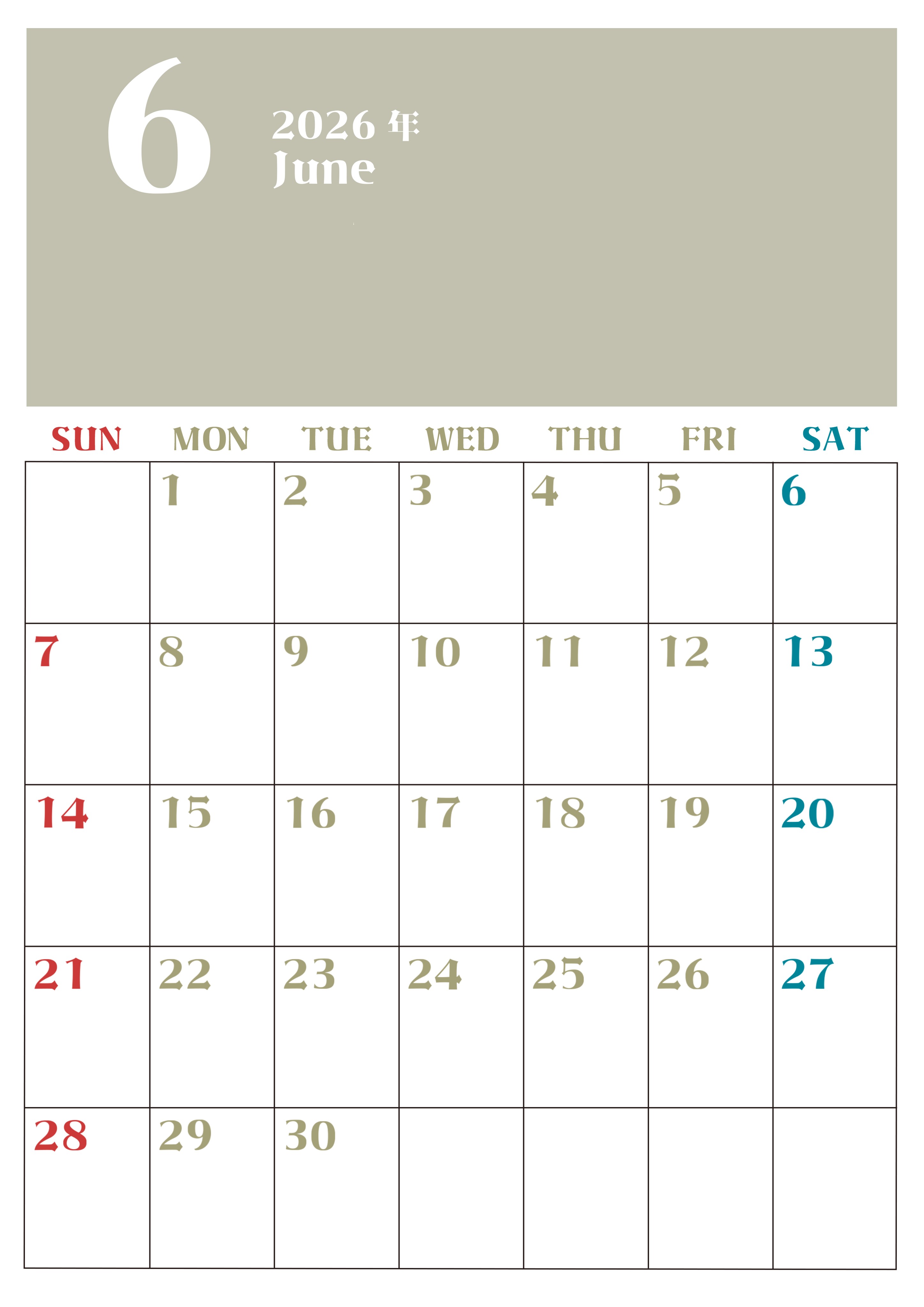 2026年・無料のカレンダーテンプレート 2026年6月のシンプルなカレンダーは縦型日曜始まりで大きい文字が見やすい書き込みも楽なA4サイズの無料素材(2026-01160610) 素材状デザイン王 2025年4月8日 2026年6月のシンプルなカレンダーは縦型日曜始まりの大きい文字が見やすい書き込みも楽なA4サイズの無料素材です。スケジュールの整理におすすめのフリー素材です。多忙なプランの可視化におすすめです。(2026-01160610) シンプル 6月 縦型のカレンダー 日曜始まり カレンダーデザイン-0116
