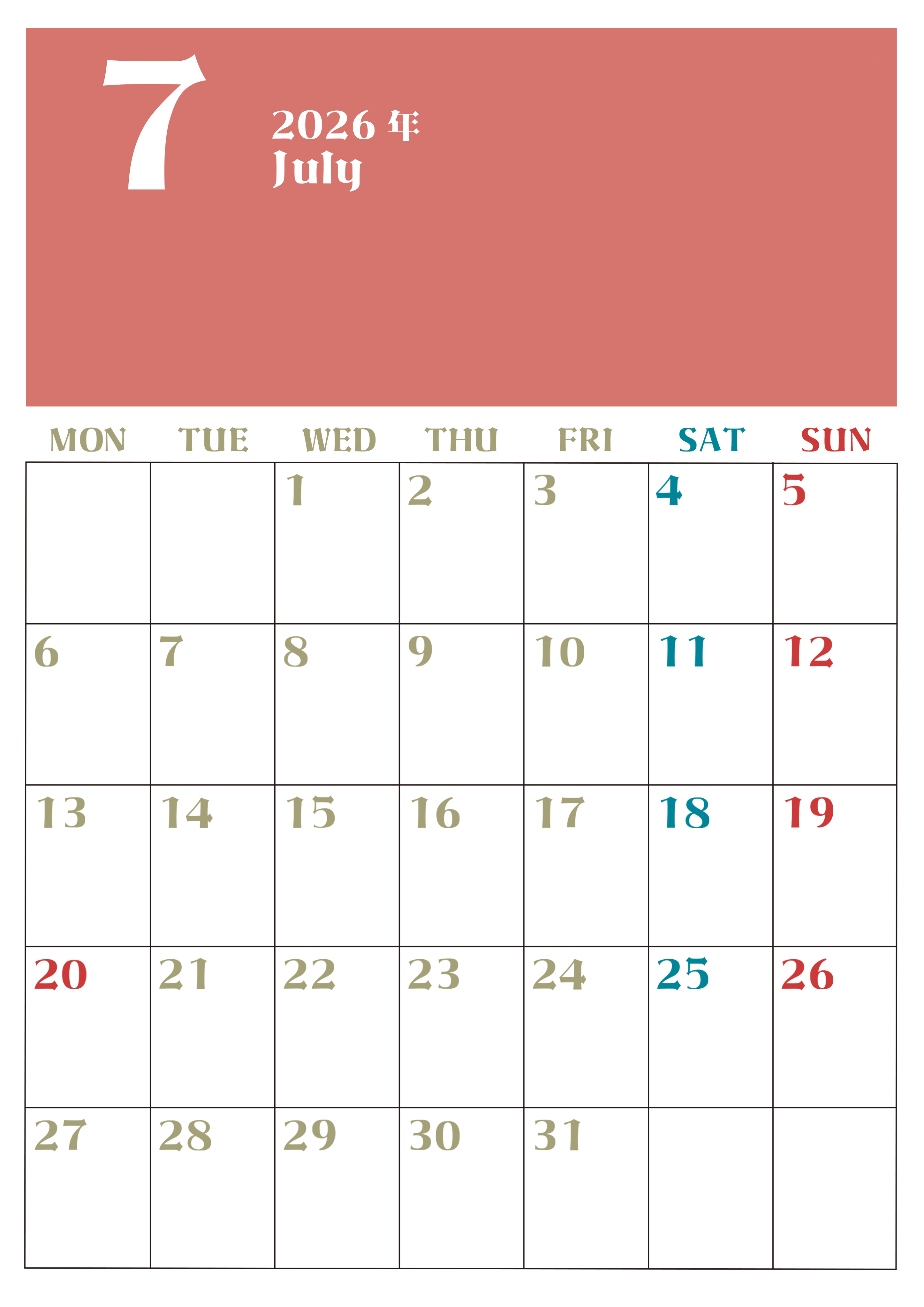 2026年7月のシンプルなカレンダーは縦型月のシンプルなカレンダーは曜始まりの大きい文字が見やすい書き込みも楽なA4サイズの無料素材です。スケジュールの整理におすすめのフリー素材です。計画を効率的に立てるのにおすすめです。(2026-01160711)