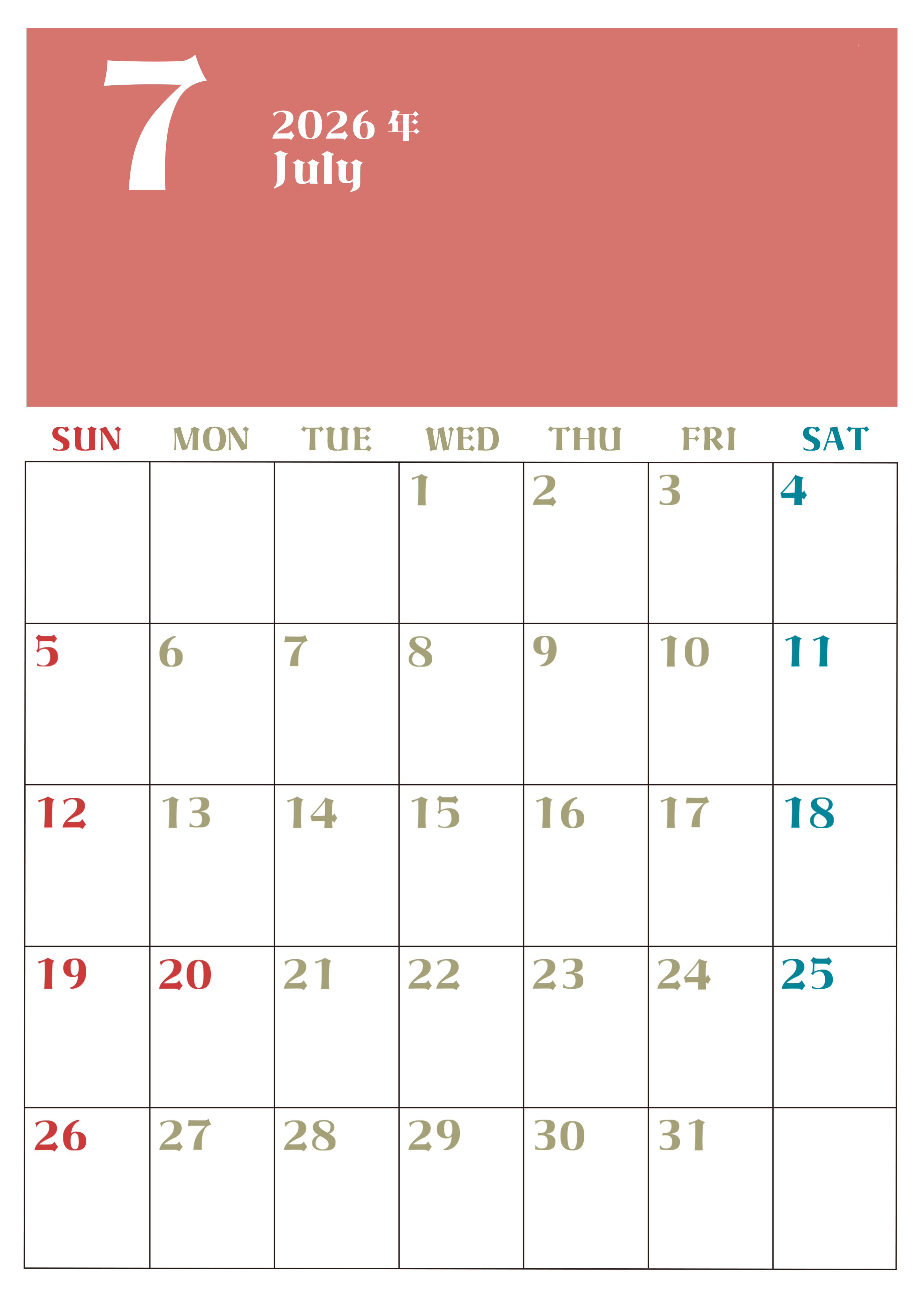 2026年7月のシンプルなカレンダーは縦型日曜始まりの大きい文字が見やすい書き込みも楽なA4サイズの無料素材です。スケジュールの整理におすすめのフリー素材です。計画を効率的に立てるのにおすすめです。(2026-01160710)