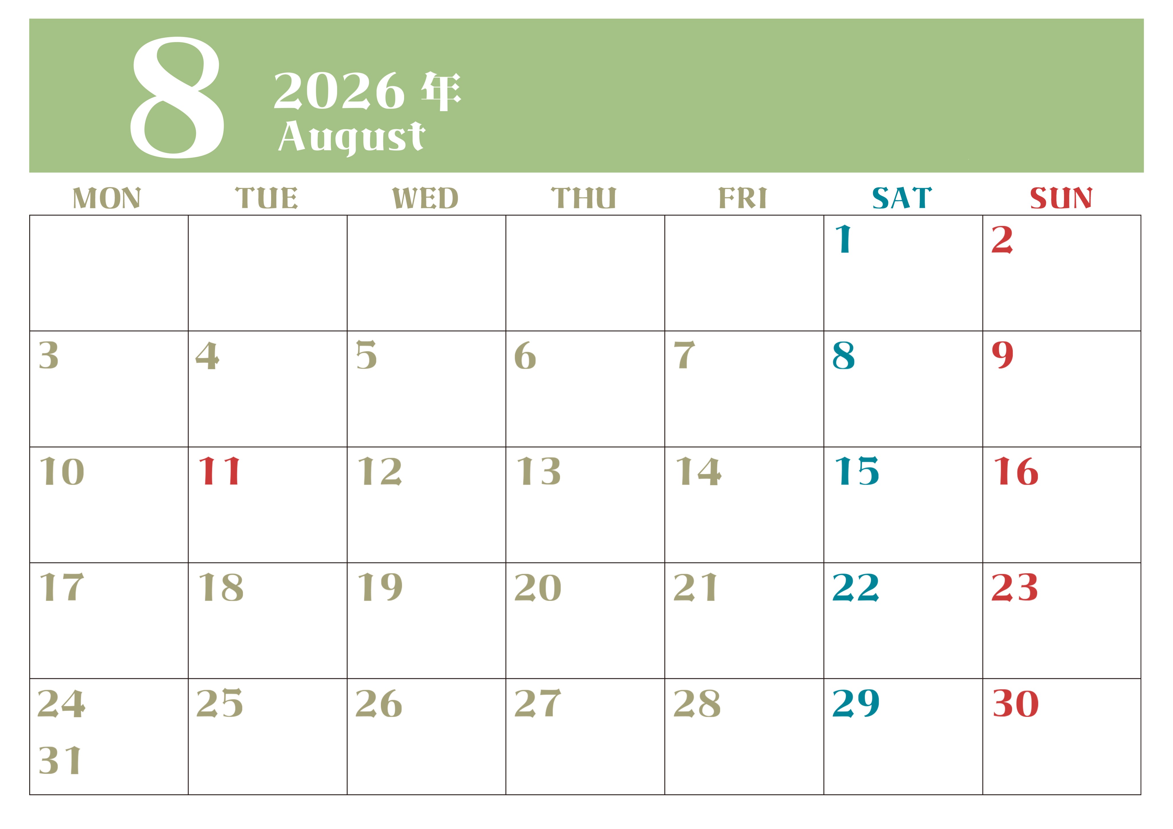 2026年8月のシンプルなカレンダーは横型月のシンプルなカレンダーは曜始まりの大きい文字が見やすい書き込みも楽なA4サイズの無料素材です。スケジュールの整理におすすめのフリー素材です。忙しいスケジュールを簡単にまとめて書き込みするのにおすすめです。(2026-01160801)