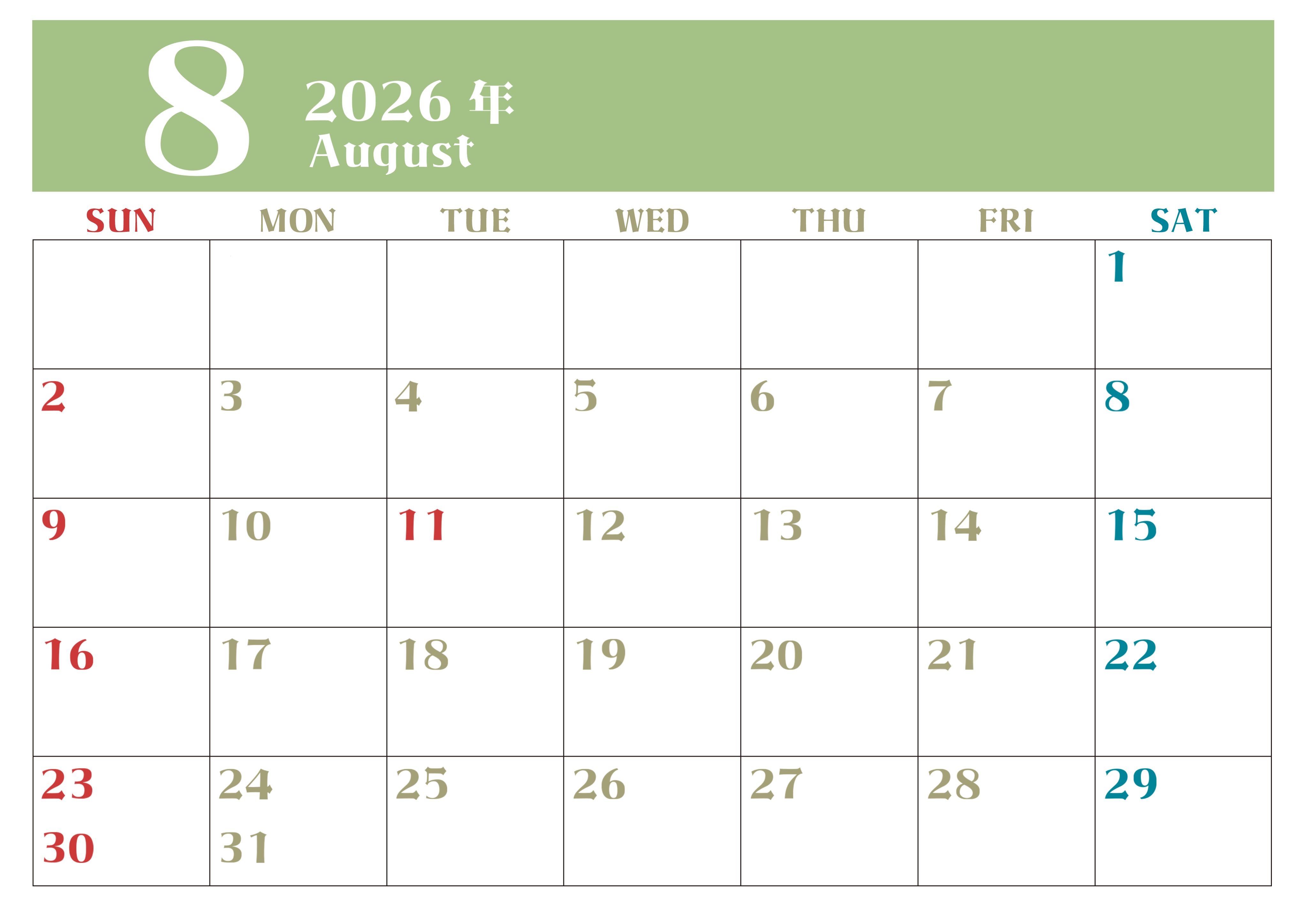 2026年8月のシンプルなカレンダーは横型日曜始まりで大きい文字が見やすい書き込みも楽なA4サイズの無料素材(2026-01160800)