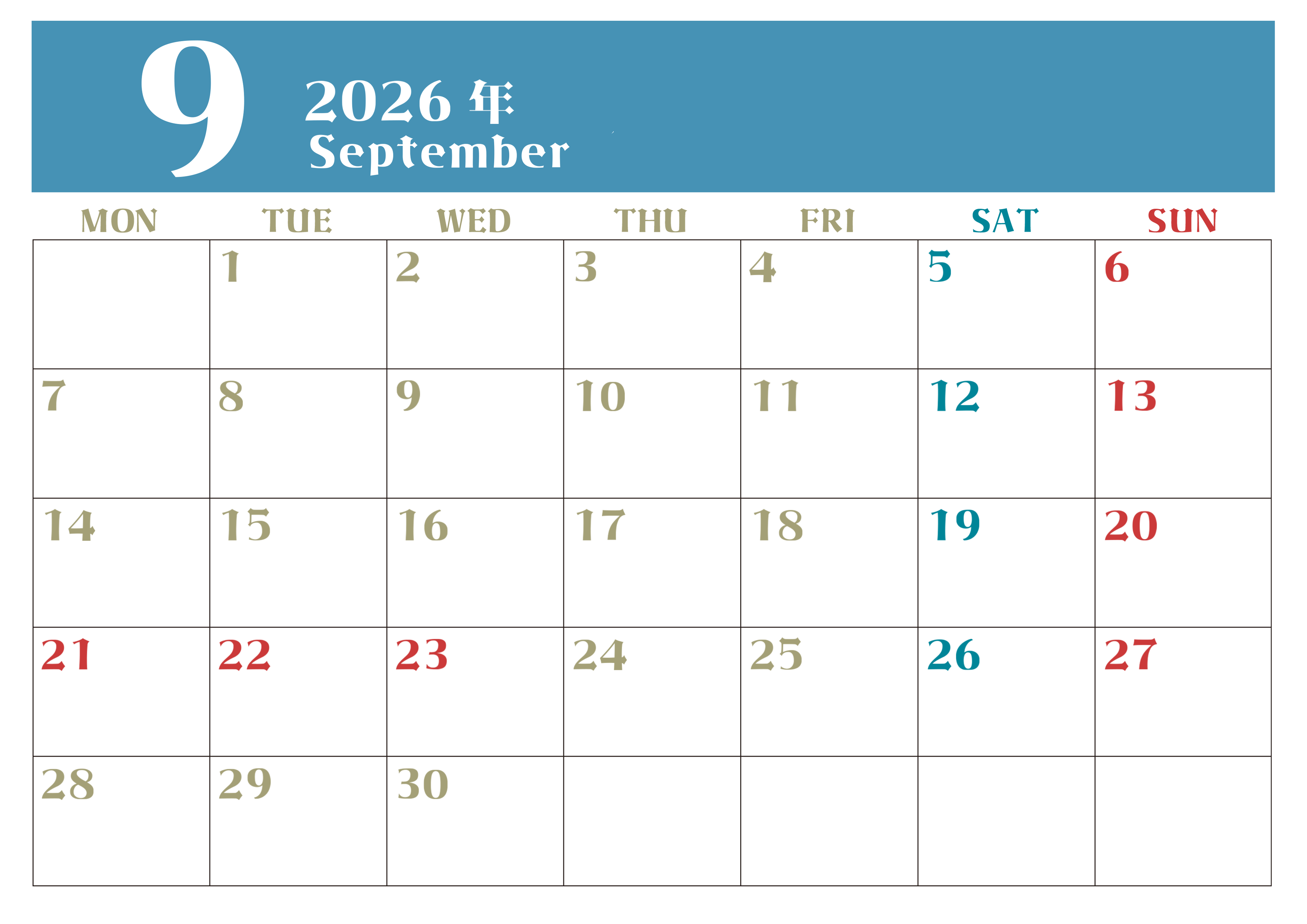 2026年9月のシンプルなカレンダーは横型月のシンプルなカレンダーは曜始まりの大きい文字が見やすい書き込みも楽なA4サイズの無料素材です。スケジュールの整理におすすめのフリー素材です。多忙なプランの可視化におすすめです。(2026-01160901)