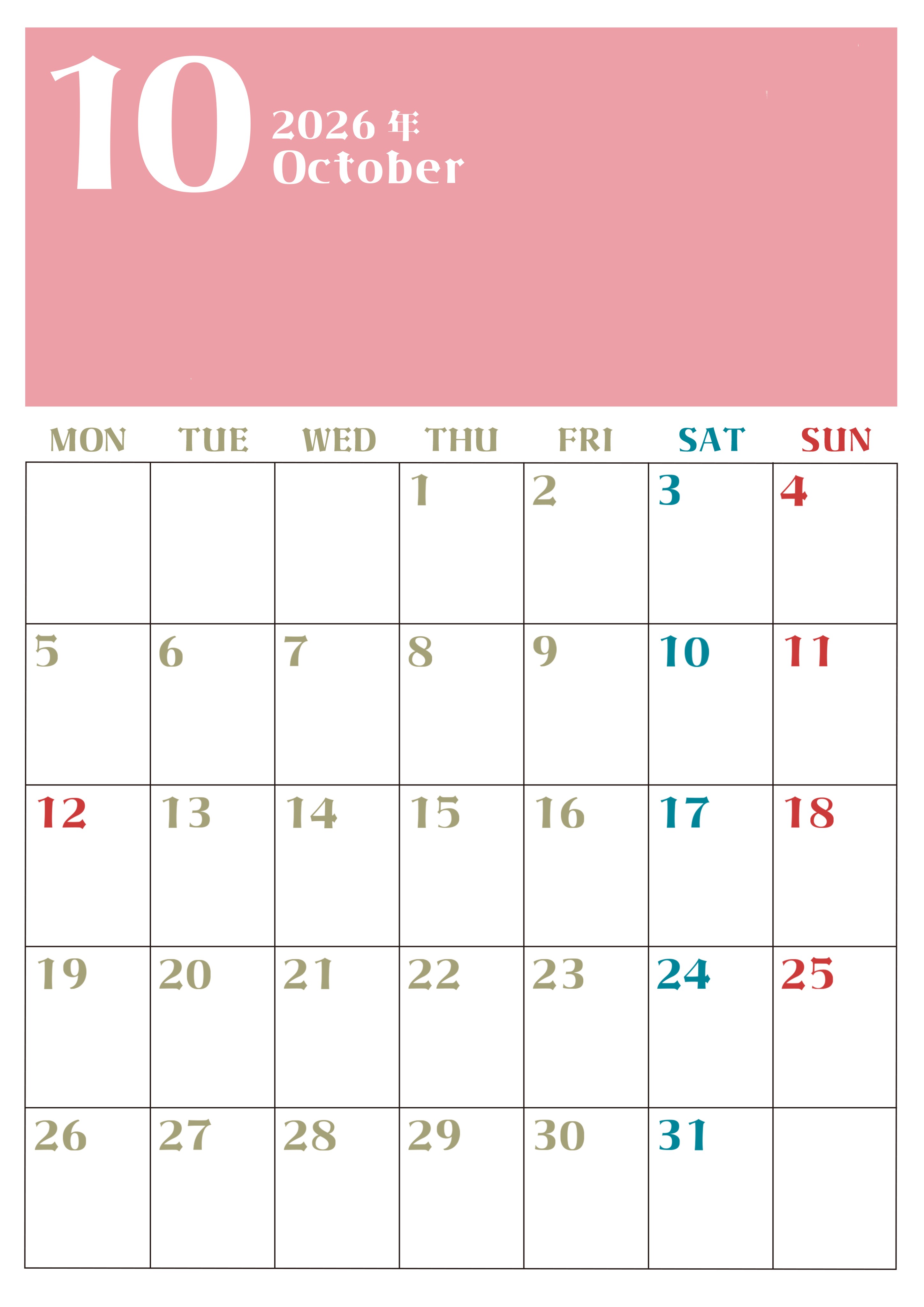 2026年10月のシンプルなカレンダーは縦型月のシンプルなカレンダーは曜始まりの大きい文字が見やすい書き込みも楽なA4サイズの無料素材です。スケジュールの整理におすすめのフリー素材です。計画を効率的に立てるのにおすすめです。(2026-01161011)