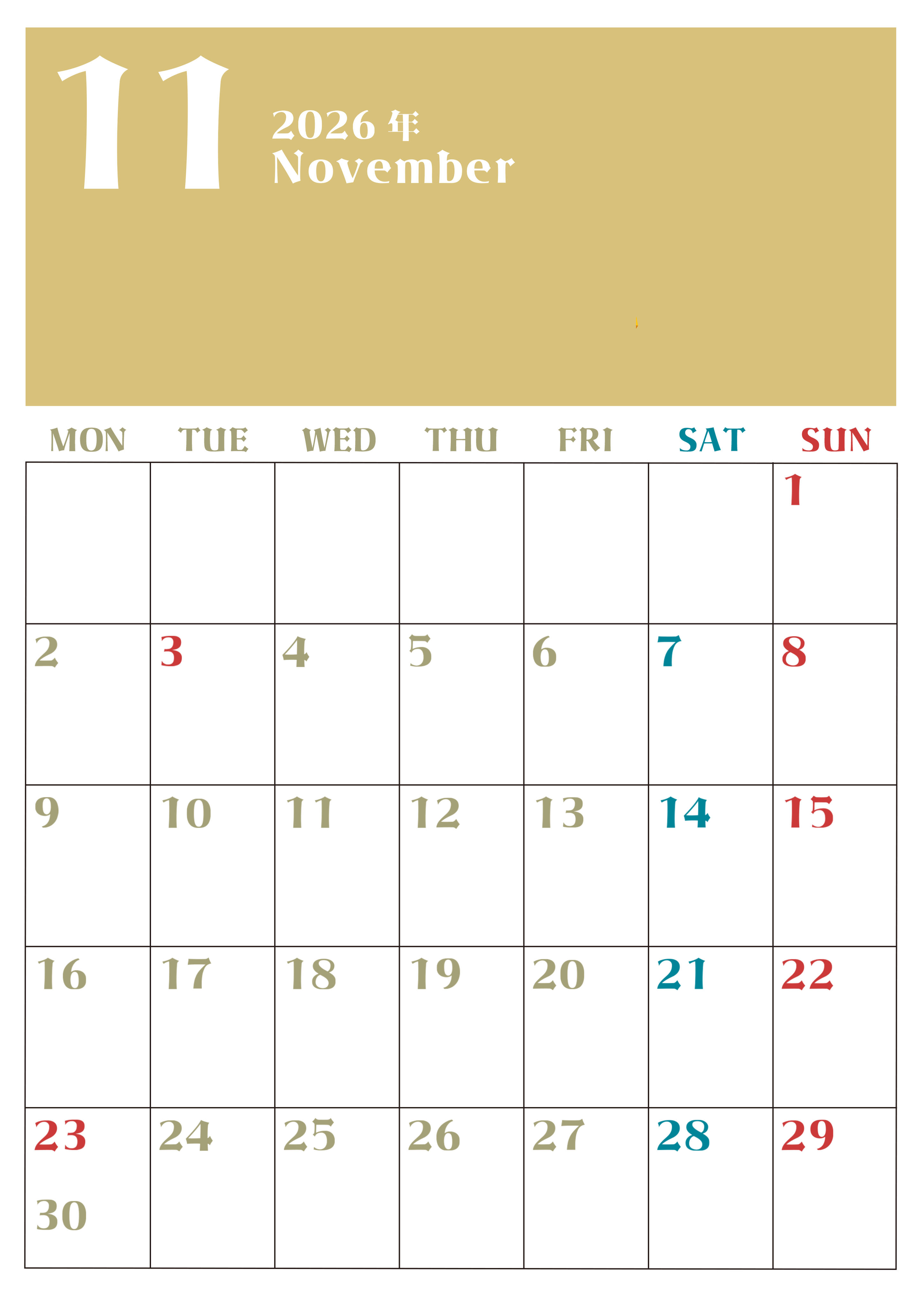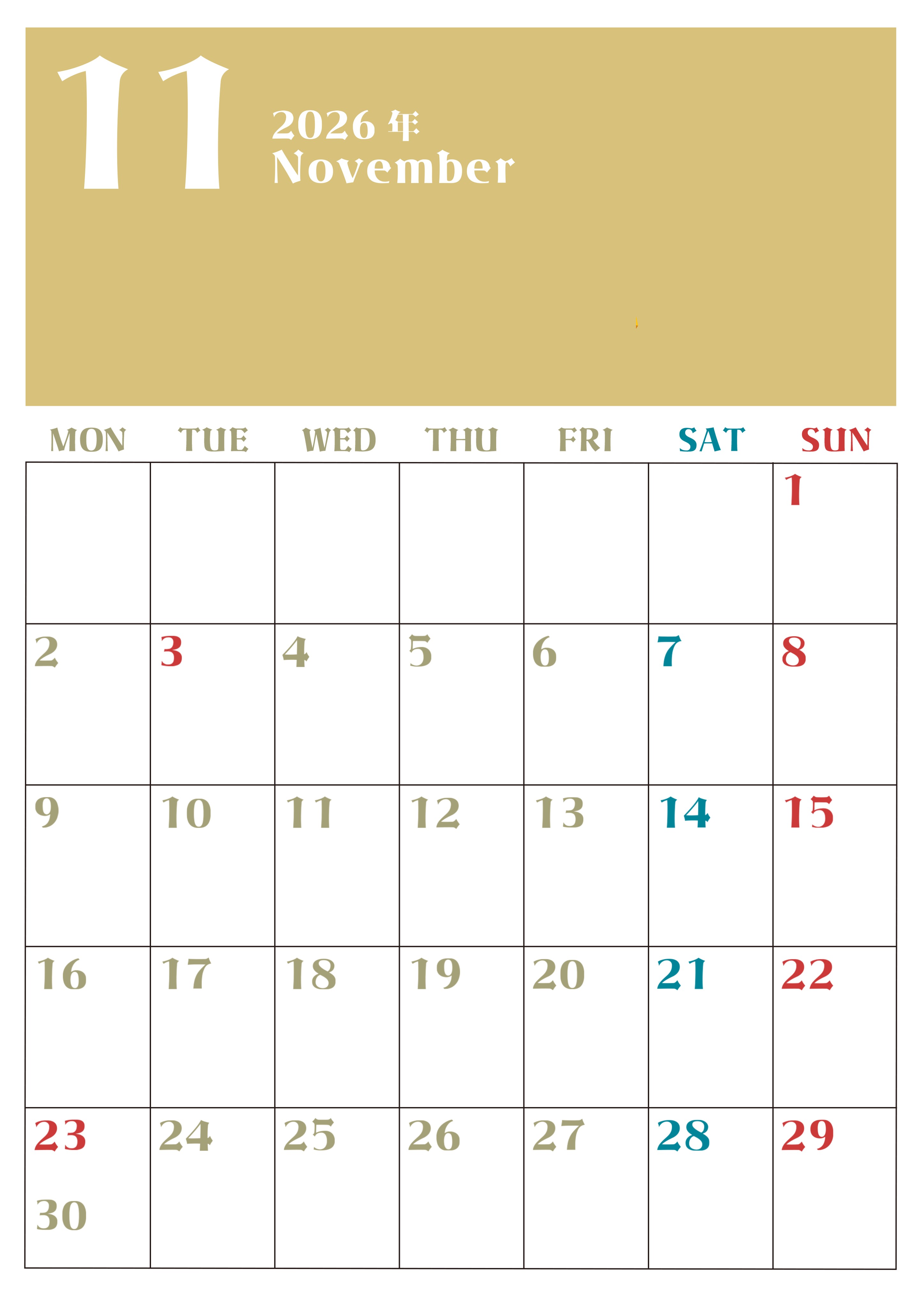 2026年11月のシンプルなカレンダーは縦型月のシンプルなカレンダーは曜始まりの大きい文字が見やすい書き込みも楽なA4サイズの無料素材です。スケジュールの整理におすすめのフリー素材です。忙しいスケジュールを簡単にまとめて書き込みするのにおすすめです。(2026-01161111)