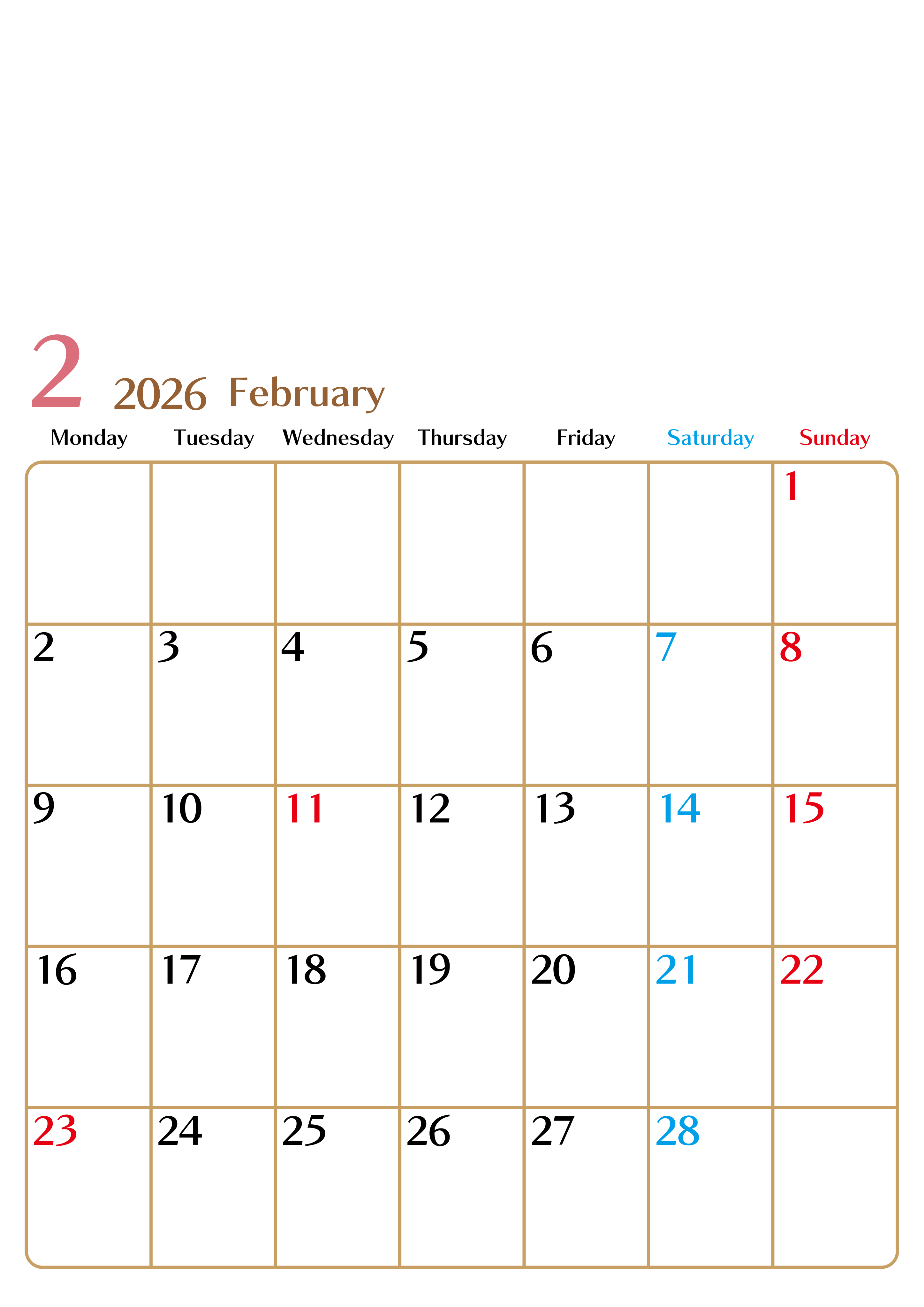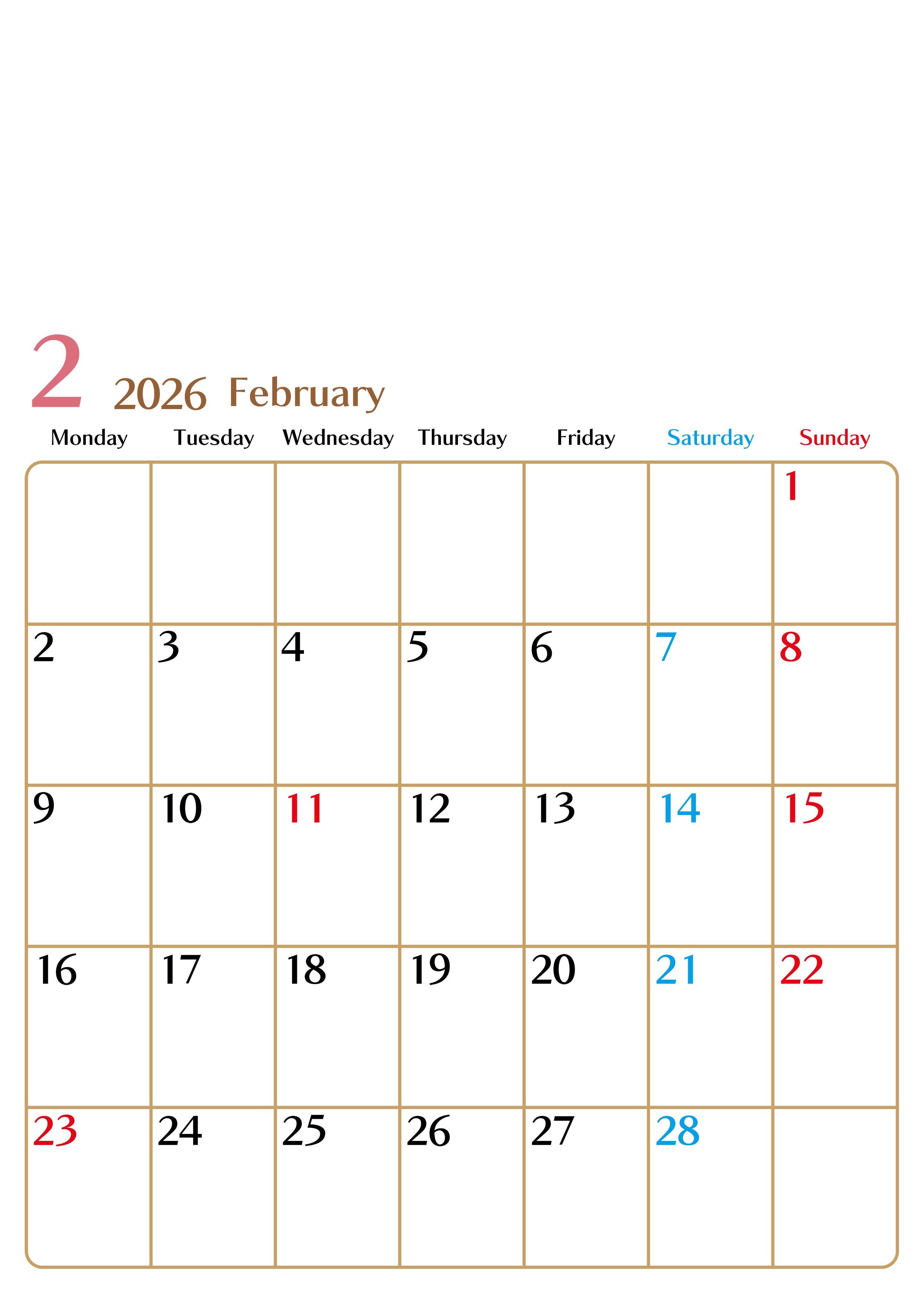 2026年・無料のカレンダーテンプレート 2026年2月縦型の月曜始まりカレンダー♪シンプルで書き込みしやすい文字が大きなA4用紙向け(無料)(2026-01170211) 素材状デザイン王 2025年4月8日 2026年2月縦型の月曜始まりの書き込みしやすい文字が大きなA4用紙向け(無料)です。予定を見える化するのに向いているのでダウンロードをおすすめ!スケジュールを管理しやすいです。(2026-01170211) シンプル 2月 縦型のカレンダー 月曜始まり カレンダーデザイン-0117