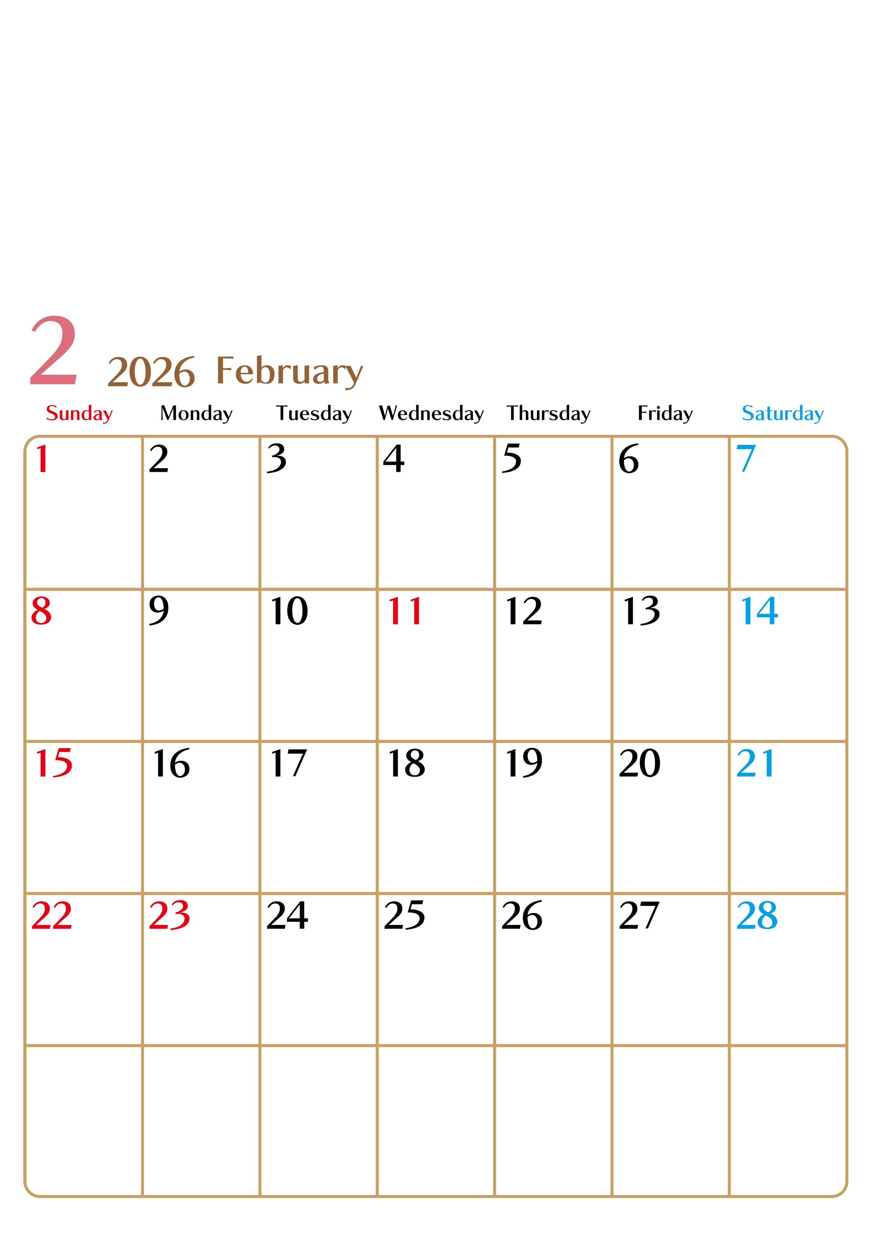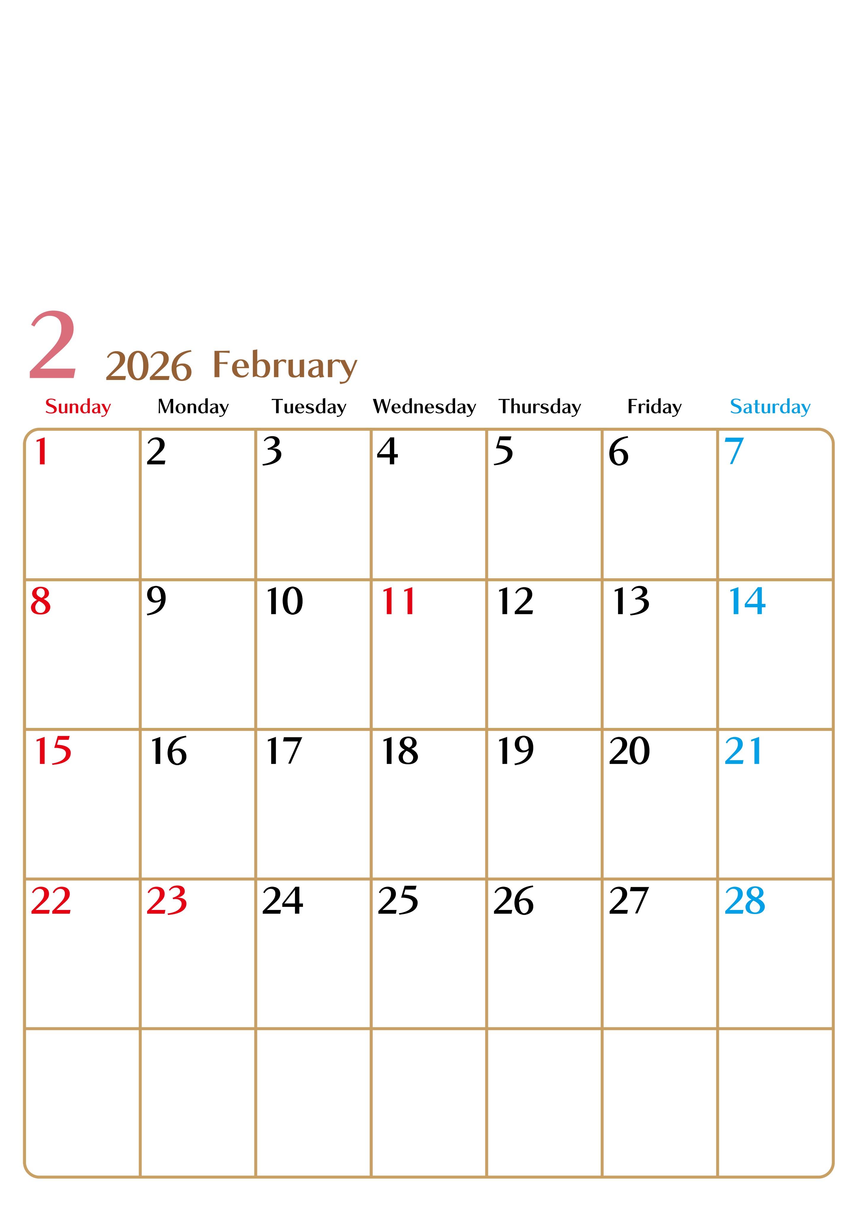 2026年・無料のカレンダーテンプレート 2026年2月縦型の日曜始まりカレンダー♪シンプルで書き込みしやすい文字が大きなA4用紙向け(無料)(2026-01170210) 素材状デザイン王 2025年4月8日 2026年2月縦型の日曜始まりの書き込みしやすい文字が大きなA4用紙向け(無料)です。予定を見える化するのに向いているのでダウンロードをおすすめ!スケジュールを管理しやすいです。(2026-01170210) シンプル 2月 縦型のカレンダー 日曜始まり カレンダーデザイン-0117