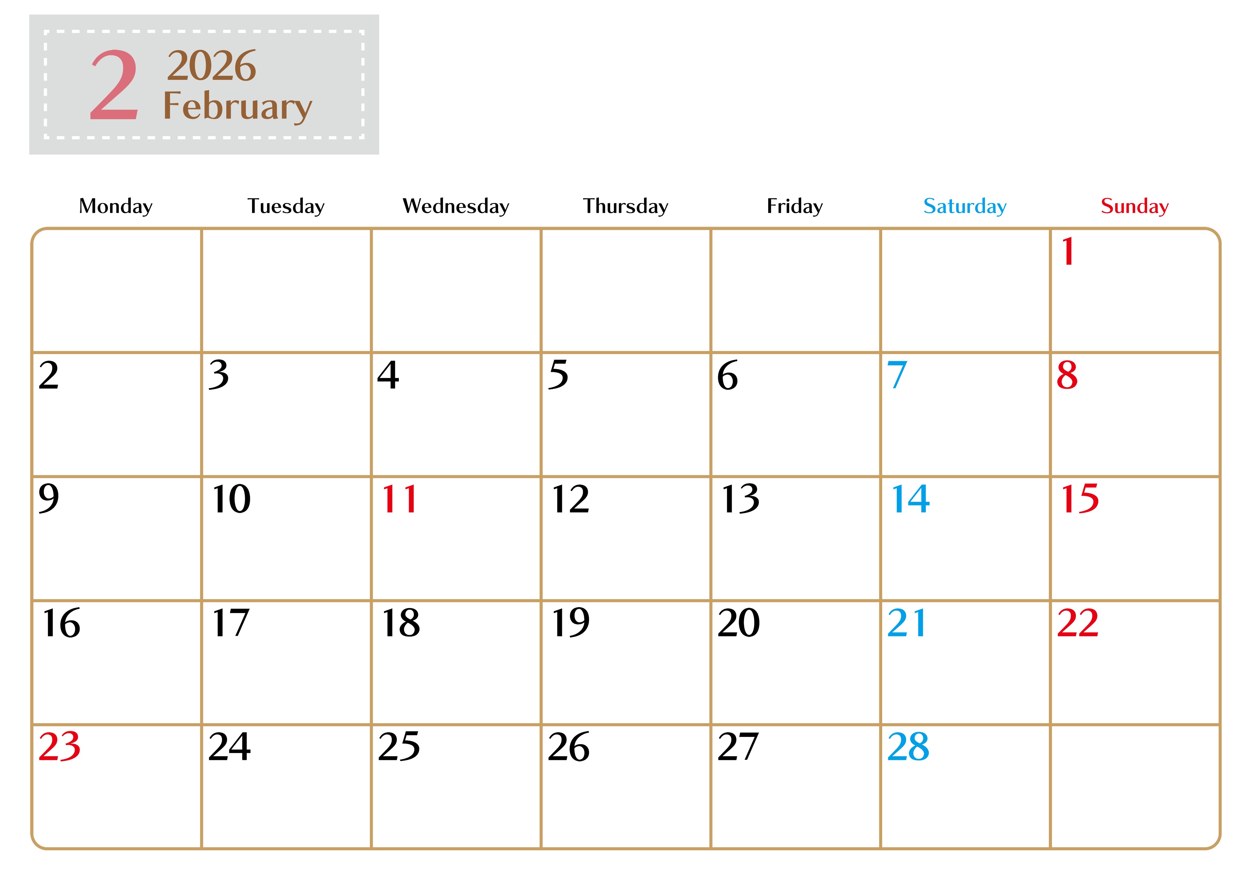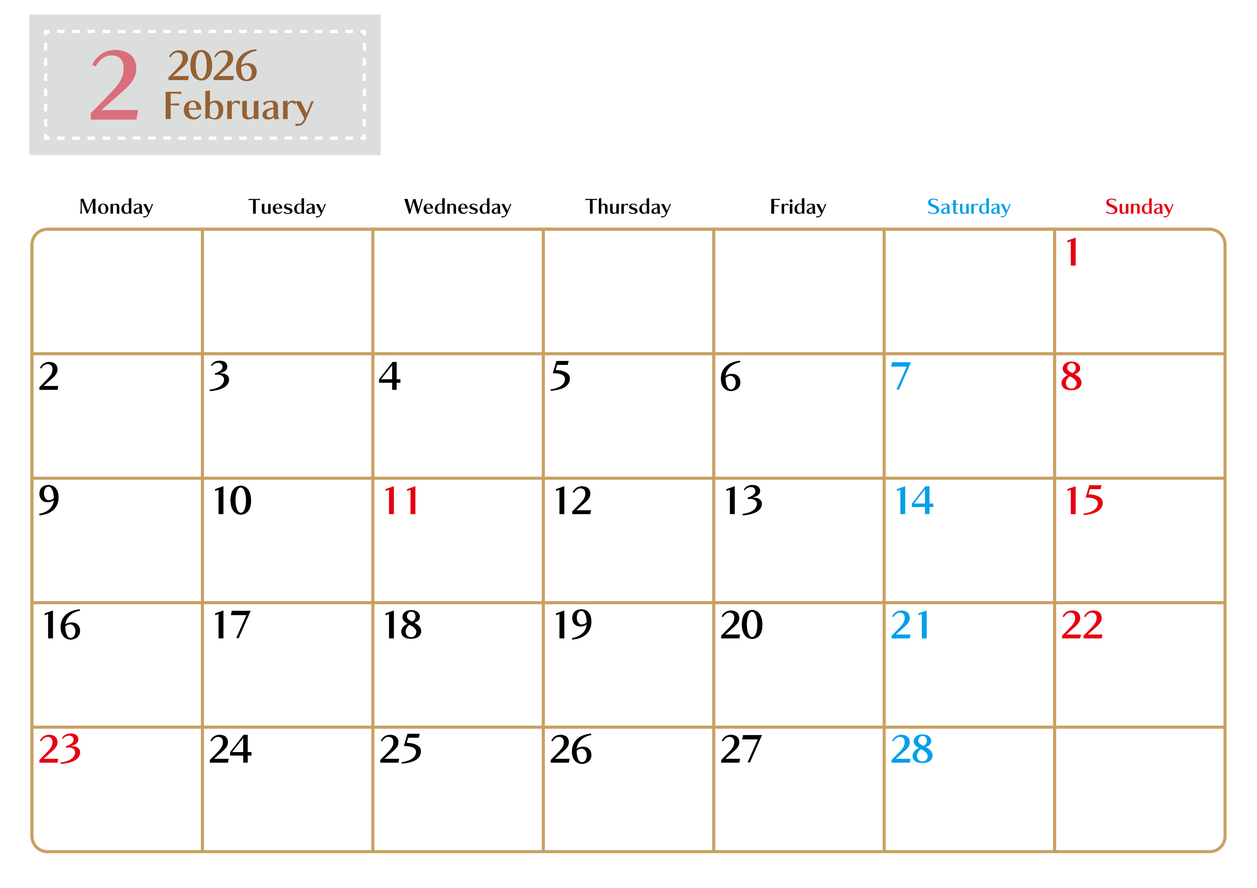2026年・無料のカレンダーテンプレート 2026年2月横型の月曜始まりカレンダー♪シンプルで書き込みしやすい文字が大きなA4用紙向け(無料)(2026-01170201) 素材状デザイン王 2025年4月8日 2026年2月横型の月曜始まりの書き込みしやすい文字が大きなA4用紙向け(無料)です。予定を見える化するのに向いているのでダウンロードをおすすめ!スケジュールを管理しやすいです。(2026-01170201) シンプル 2月 横型のカレンダー 月曜始まり カレンダーデザイン-0117
