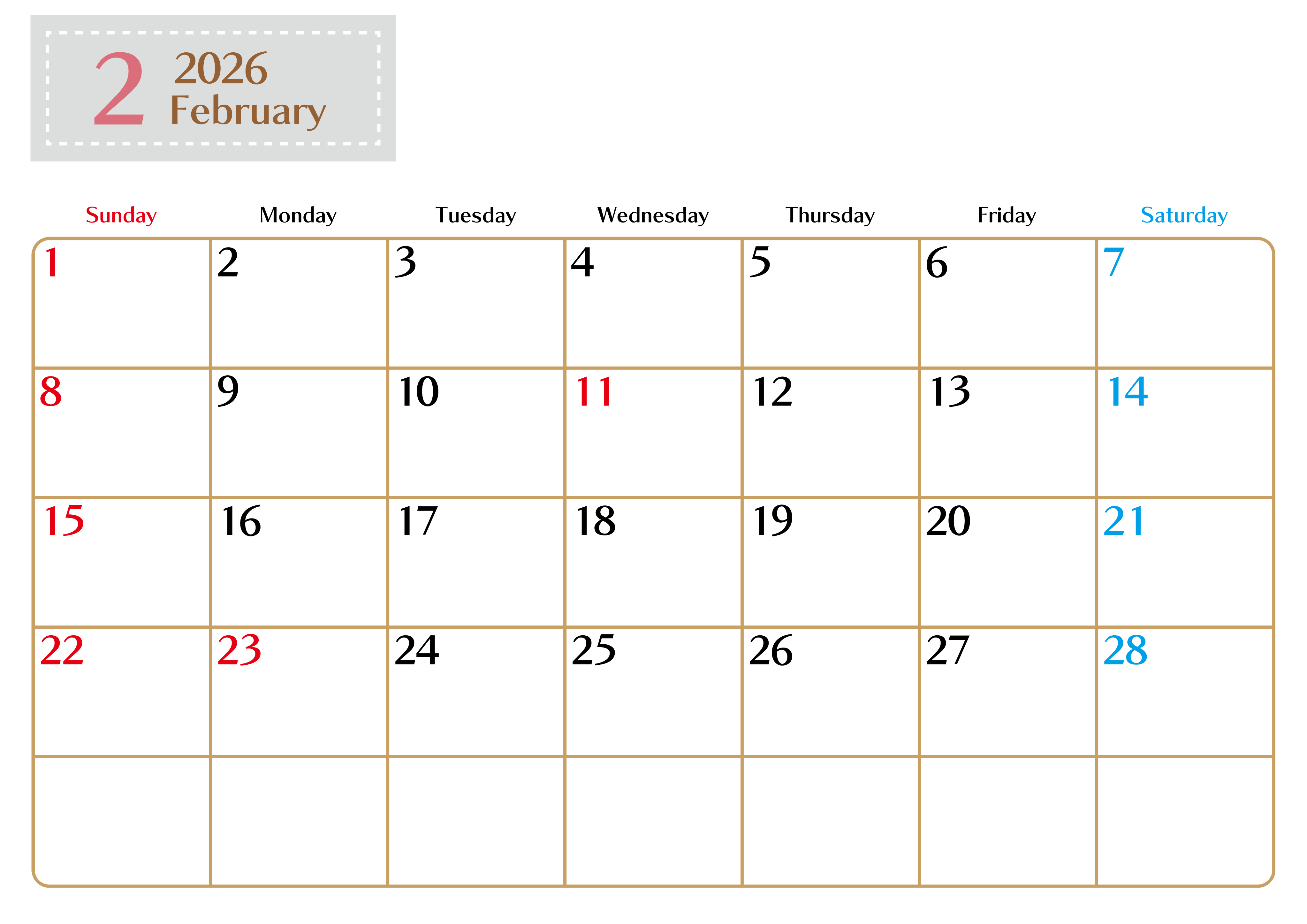 2026年2月横型の日曜始まりカレンダー♪シンプルで書き込みしやすい文字が大きなA4用紙向け(無料)(2026-01170200)