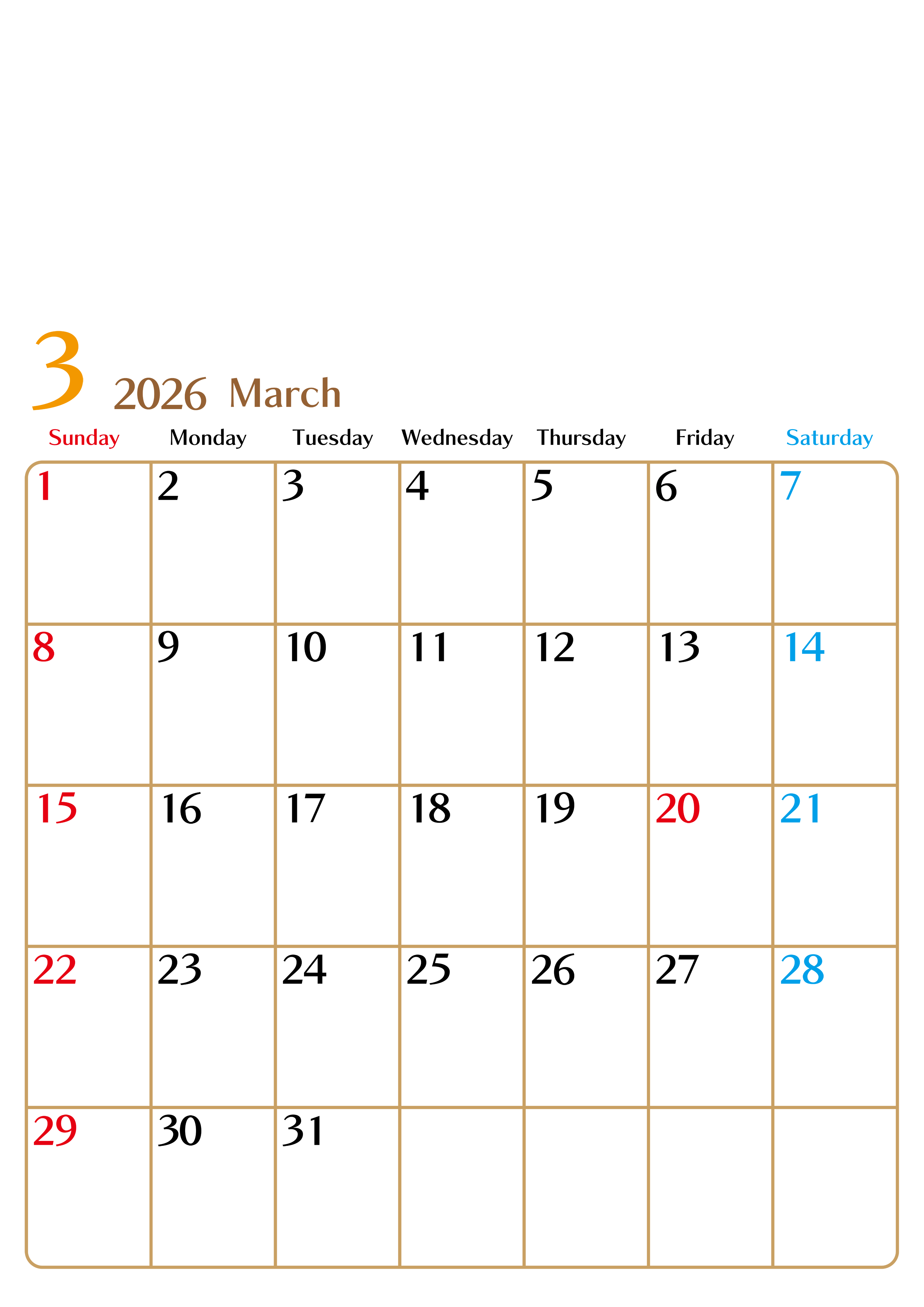 2026年3月縦型の日曜始まりカレンダー♪シンプルで書き込みしやすい文字が大きなA4用紙向け(無料)(2026-01170310)