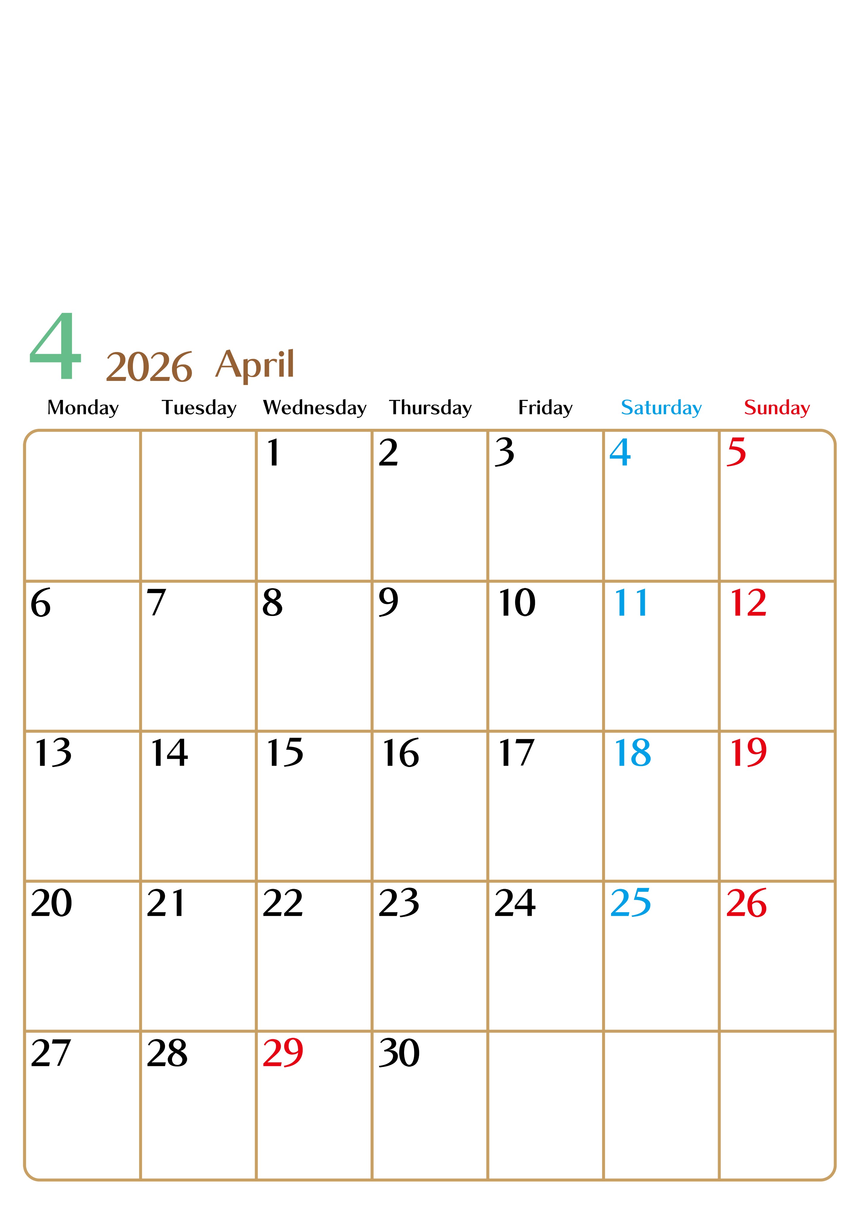 2026年・無料のカレンダーテンプレート 2026年4月縦型の月曜始まりカレンダー♪シンプルで書き込みしやすい文字が大きなA4用紙向け(無料)(2026-01170411) 素材状デザイン王 2025年4月8日 2026年4月縦型の月曜始まりの書き込みしやすい文字が大きなA4用紙向け(無料)です。予定を見える化するのに向いているのでダウンロードをおすすめ!計画を立てるのに最適です。(2026-01170411) シンプル 4月 縦型のカレンダー 月曜始まり カレンダーデザイン-0117