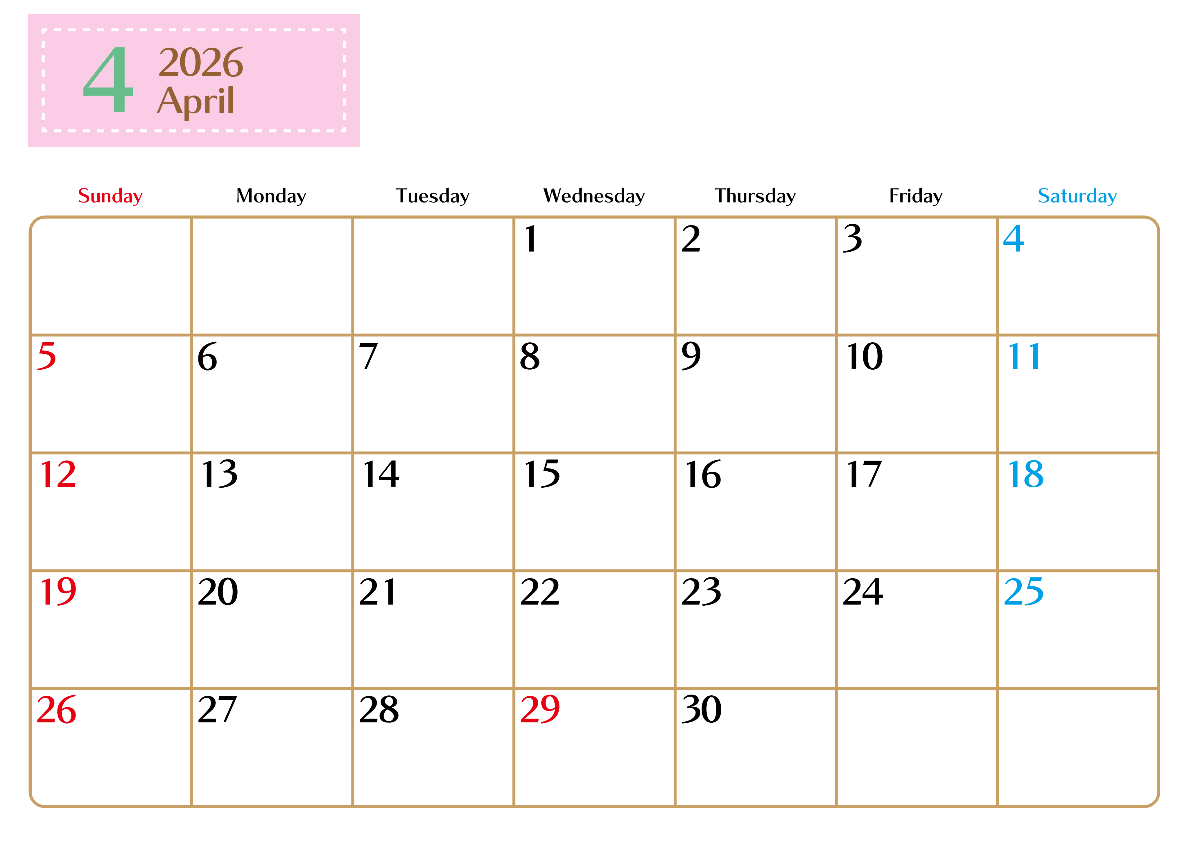 2026年・無料のカレンダーテンプレート 2026年4月横型の日曜始まりカレンダー♪シンプルで書き込みしやすい文字が大きなA4用紙向け(無料)(2026-01170400) 素材状デザイン王 2025年4月8日 2026年4月横型の日曜始まりの書き込みしやすい文字が大きなA4用紙向け(無料)です。予定を見える化するのに向いているのでダウンロードをおすすめ!計画を立てるのに最適です。(2026-01170400) シンプル 4月 横型のカレンダー 日曜始まり カレンダーデザイン-0117