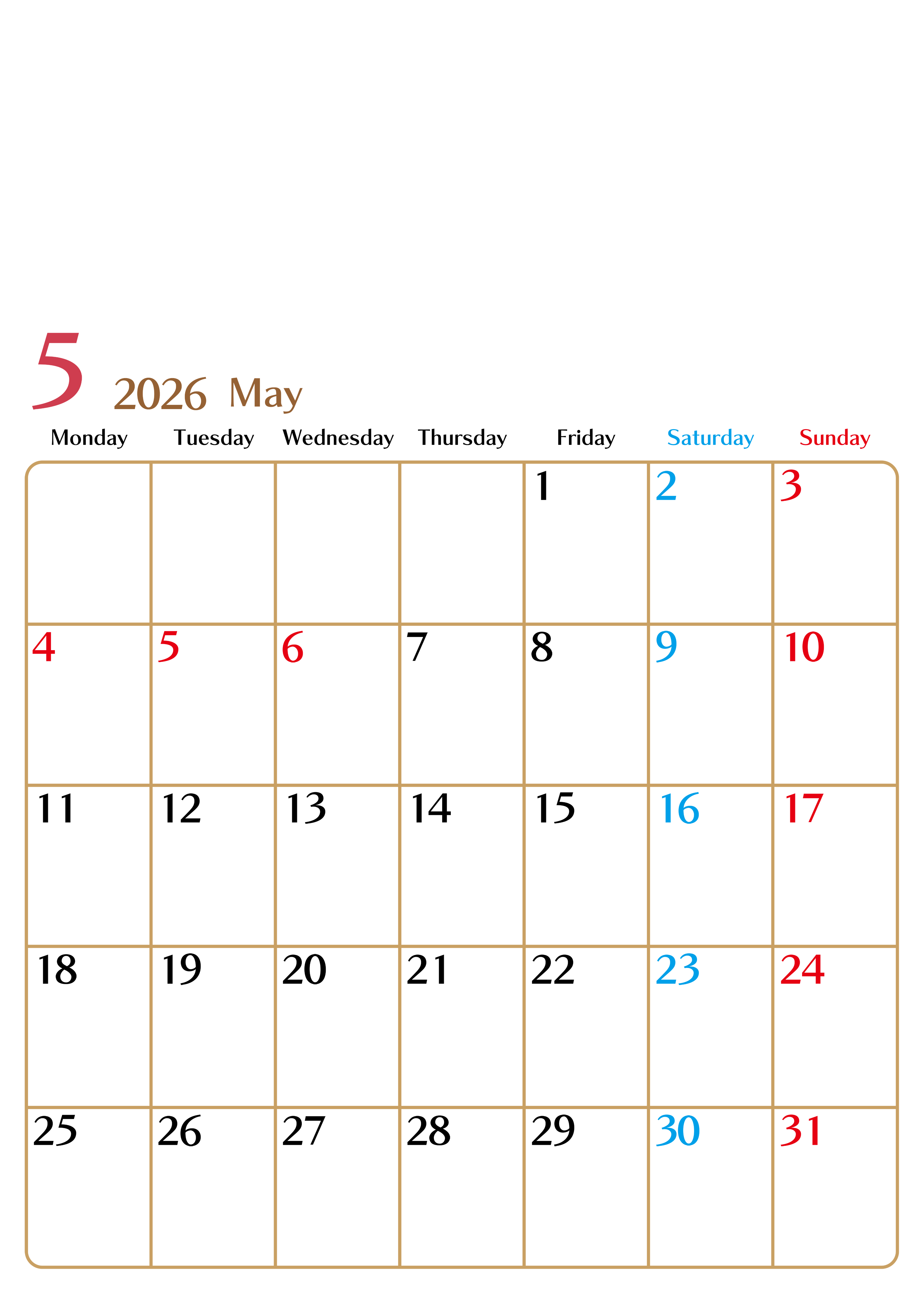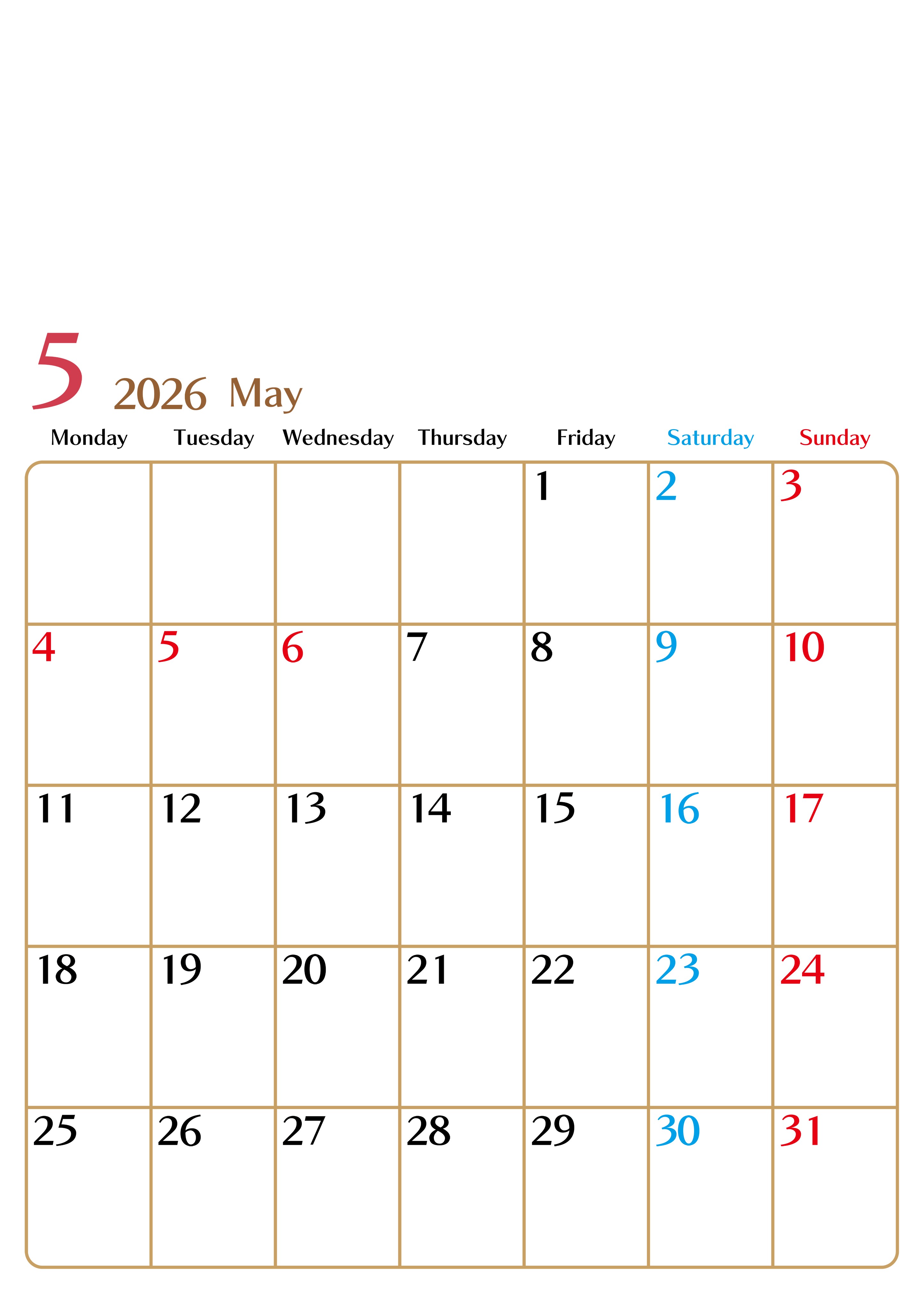 2026年・無料のカレンダーテンプレート 2026年5月縦型の月曜始まりカレンダー♪シンプルで書き込みしやすい文字が大きなA4用紙向け(無料)(2026-01170511) 素材状デザイン王 2025年4月8日 2026年5月縦型の月曜始まりの書き込みしやすい文字が大きなA4用紙向け(無料)です。予定を見える化するのに向いているのでダウンロードをおすすめ!スケジュールを管理しやすいです。(2026-01170511) シンプル 5月 縦型のカレンダー 月曜始まり カレンダーデザイン-0117
