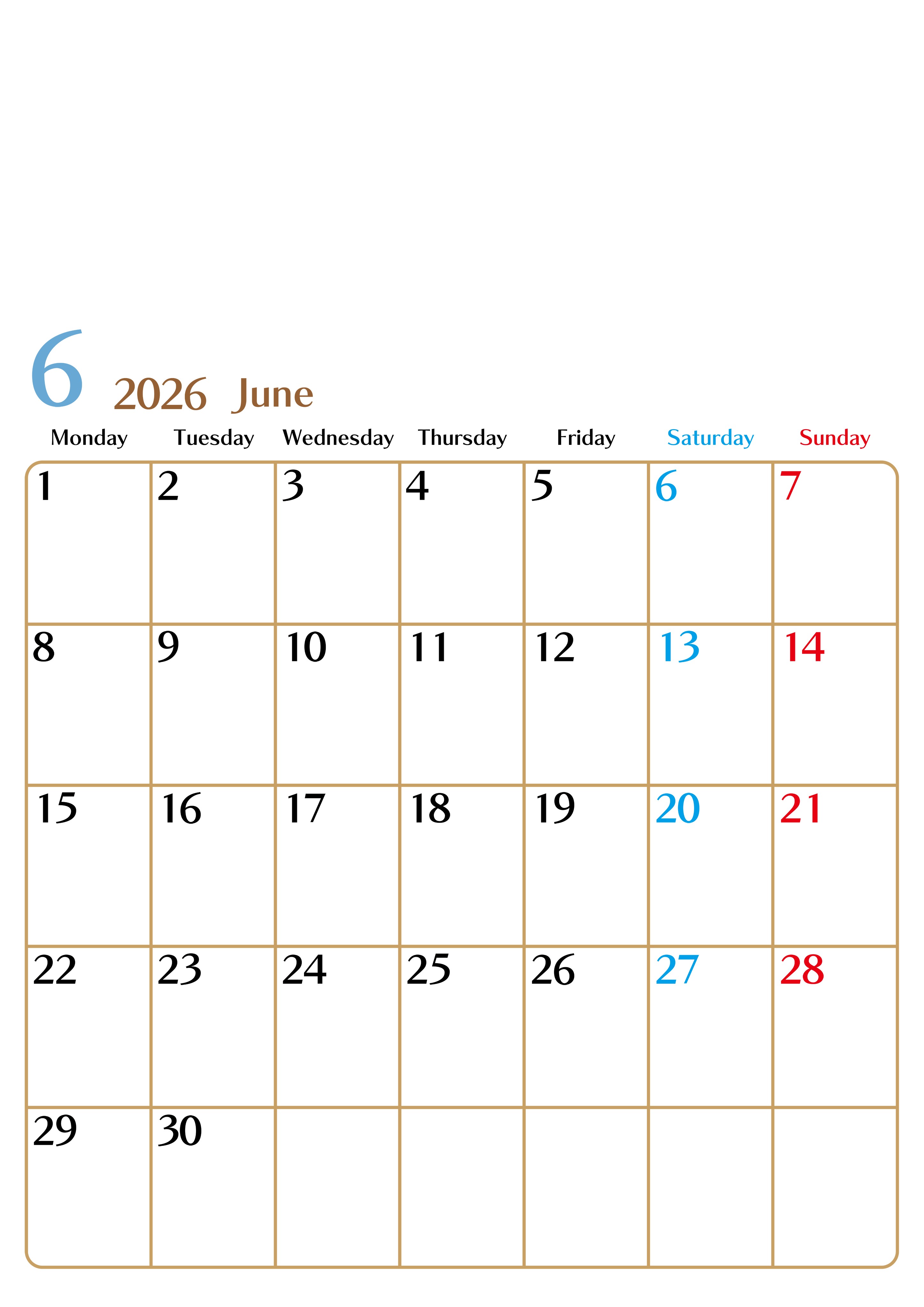 2026年・無料のカレンダーテンプレート 2026年6月縦型の月曜始まりカレンダー♪シンプルで書き込みしやすい文字が大きなA4用紙向け(無料)(2026-01170611) 素材状デザイン王 2025年4月8日 2026年6月縦型の月曜始まりの書き込みしやすい文字が大きなA4用紙向け(無料)です。予定を見える化するのに向いているのでダウンロードをおすすめ!プランの整理にぴったりです。(2026-01170611) シンプル 6月 縦型のカレンダー 月曜始まり カレンダーデザイン-0117