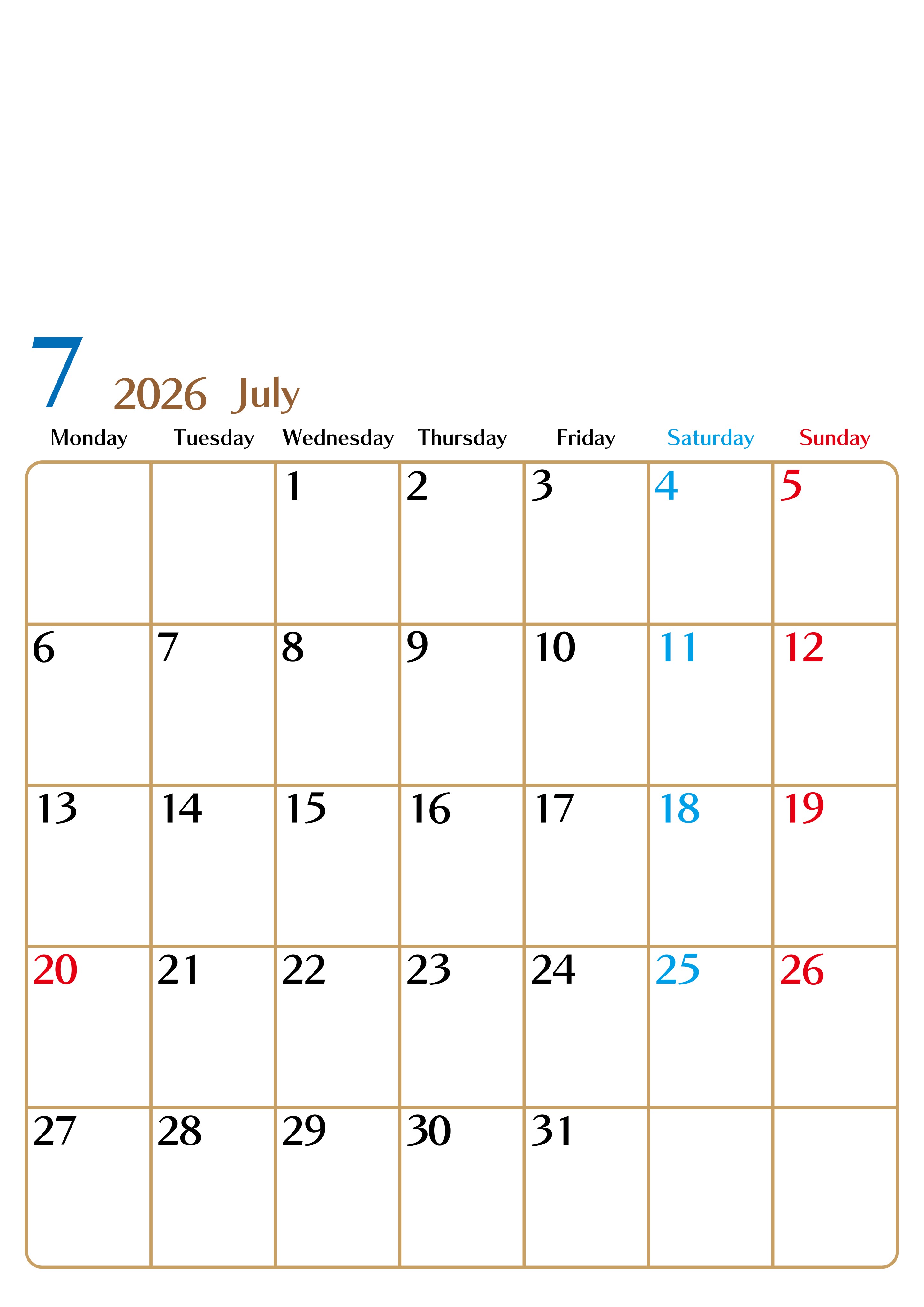 2026年・無料のカレンダーテンプレート 2026年7月縦型の月曜始まりカレンダー♪シンプルで 書き込みしやすい文字が大きなA4用紙向け(無料)(2026-01170711) 素材状デザイン王 2025年4月8日 2026年7月縦型の月曜始まりの書き込みしやすい文字が大きなA4用紙向け(無料)です。予定を見える化するのに向いているのでダウンロードをおすすめ!計画を立てるのに最適です。(2026-01170711) シンプル 7月 縦型のカレンダー 月曜始まり カレンダーデザイン-0117