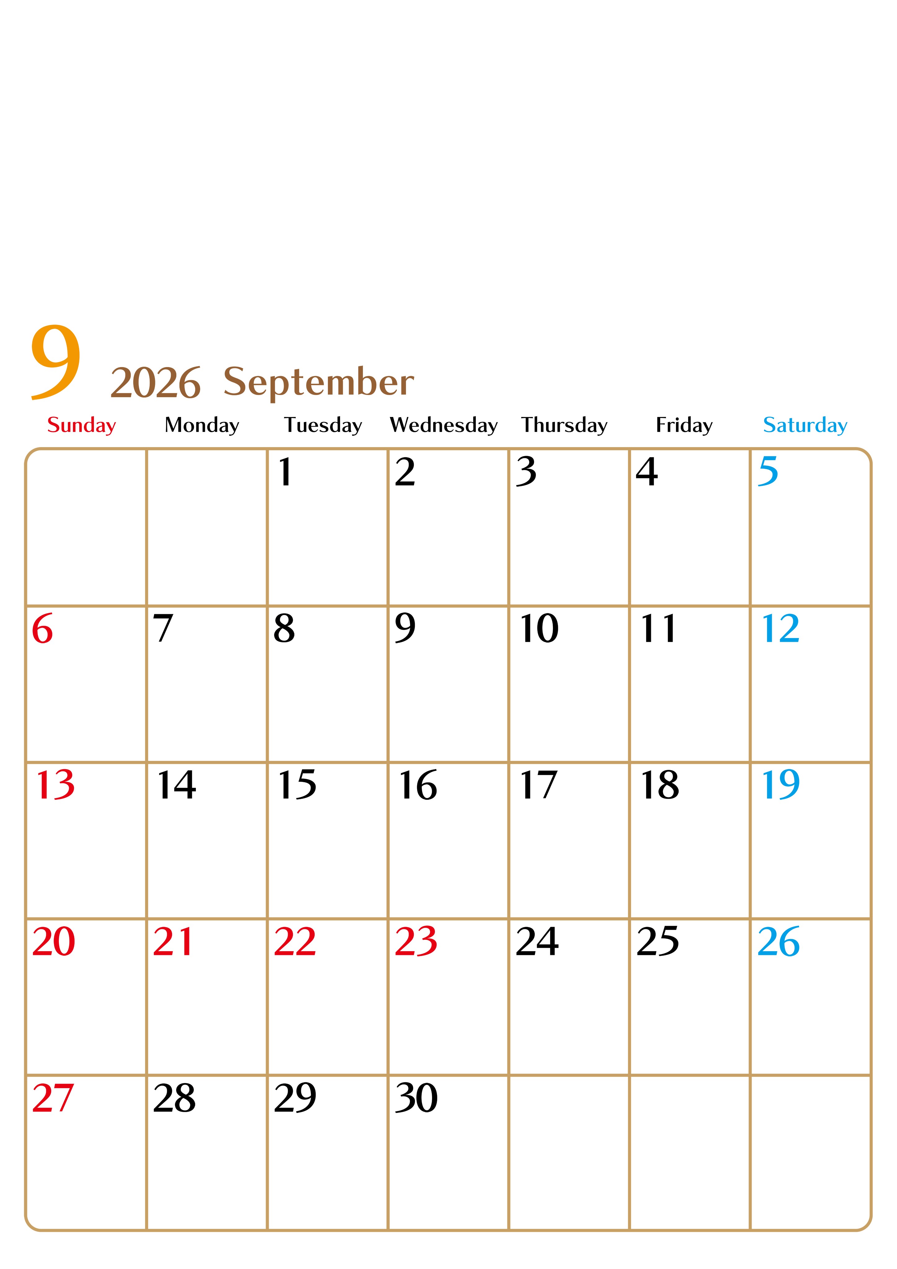 2026年9月縦型の日曜始まりカレンダー♪シンプルで書き込みしやすい文字が大きなA4用紙向け(無料)(2026-01170910)