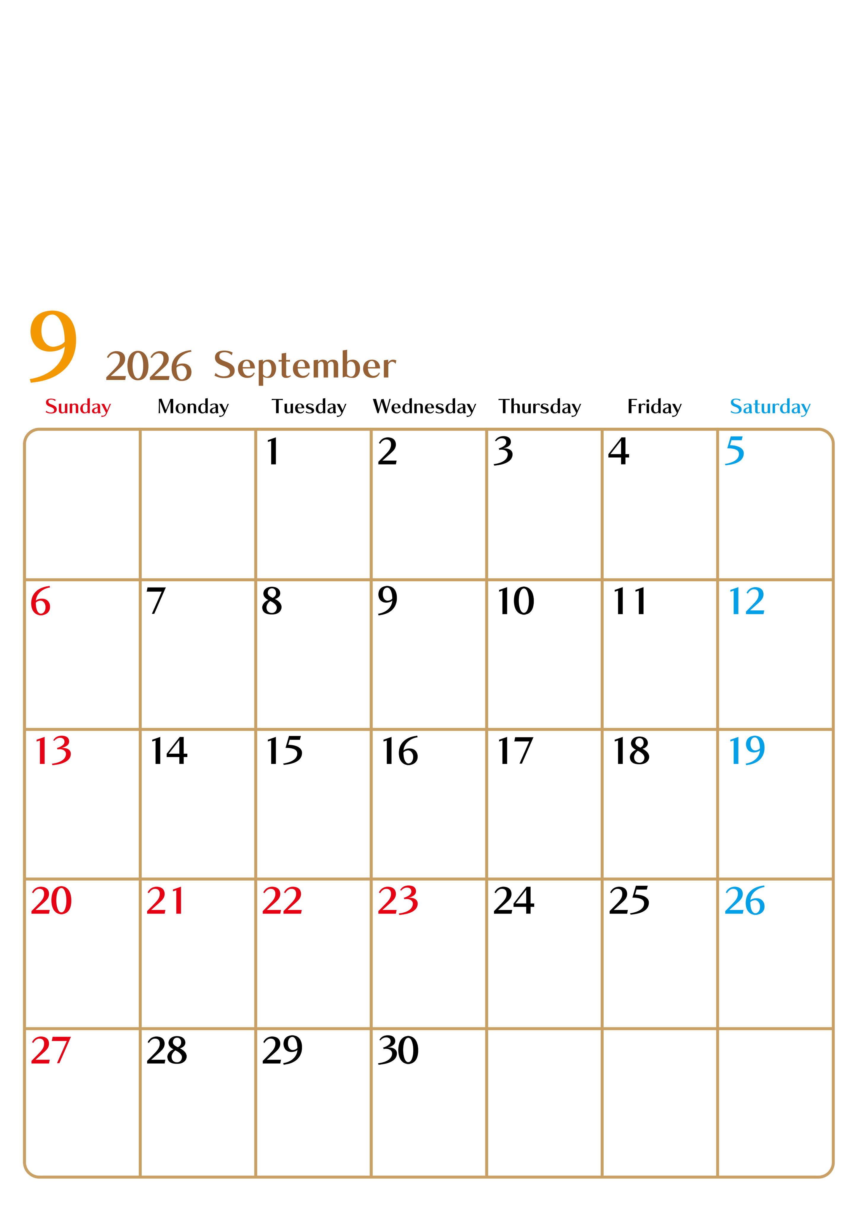2026年9月縦型の日曜始まりの書き込みしやすい文字が大きなA4用紙向け(無料)です。予定を見える化するのに向いているのでダウンロードをおすすめ!プランの整理にぴったりです。(2026-01170910)