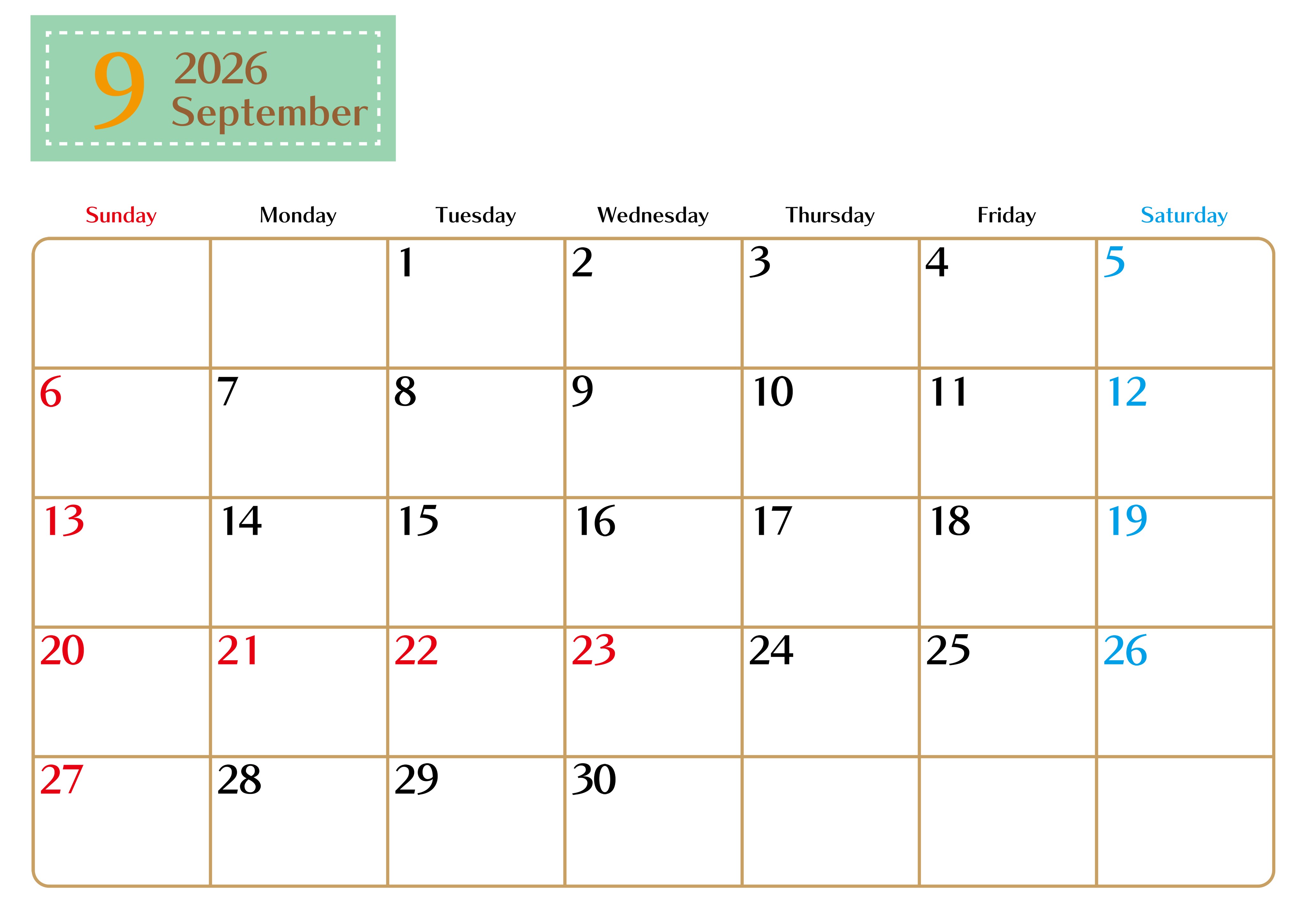 2026年・無料のカレンダーテンプレート 2026年9月横型の日曜始まりカレンダー♪シンプルで書き込みしやすい文字が大きなA4用紙向け(無料)(2026-01170900) 素材状デザイン王 2025年4月8日 2026年9月横型の日曜始まりの書き込みしやすい文字が大きなA4用紙向け(無料)です。予定を見える化するのに向いているのでダウンロードをおすすめ!プランの整理にぴったりです。(2026-01170900) シンプル 9月 横型のカレンダー 日曜始まり カレンダーデザイン-0117